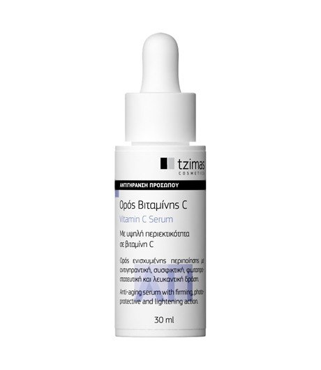 Vitamin C Serum, Tzimas Cosmetics: Δρα αντιοξειδωτικά για την εξουδετέρωση των ελεύθερων ριζών που ενοχοποιούνται για τη δερματική γήρανση, εξουδετερώνει τις βλαβερές επιδράσεις της ηλιακής ακτινοβολίας, μειώνει την ένταση των δερματικών κηλίδων και δυσχρωμιών. Συμμετέχει στη σύνθεση κολλαγόνου που διατηρεί το δέρμα σφριγηλό και προστατεύει την ανοσοποιητική λειτουργία του δέρματος.