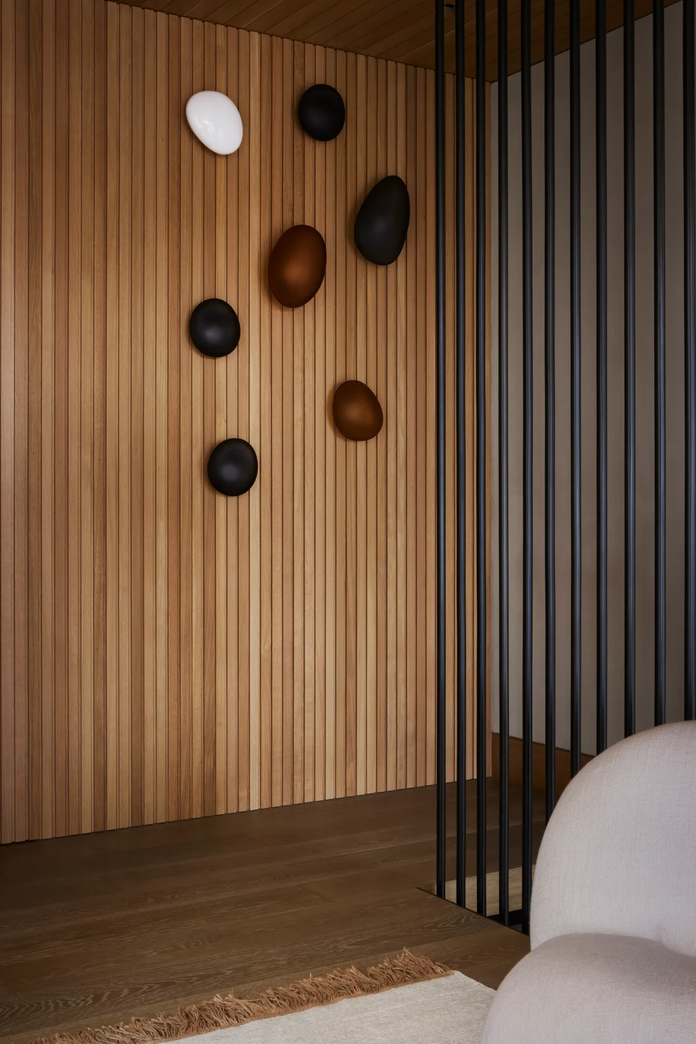 Στο κέντρο της κατοικίας δεσπόζει ο μεγάλος living area, ένας φωτεινός χώρος που ενσαρκώνει το πνεύμα της οικειότητας. Εδώ, η φωτιστική εγκατάσταση της Bec Britain δημιουργεί ένα παιχνιδιστικό διάλογο με τον τοίχο-γκαλερί που φιλοξενεί έργα τέχνης, αντικείμενα και προσωπικές συλλογές. Κάθε στοιχείο αφηγείται μια διαφορετική ιστορία, ταξίδια, εμπειρίες, στιγμές δημιουργικότητας, και συγκροτεί ένα αφήγημα γεμάτο μνήμη και αυθεντικότητα.