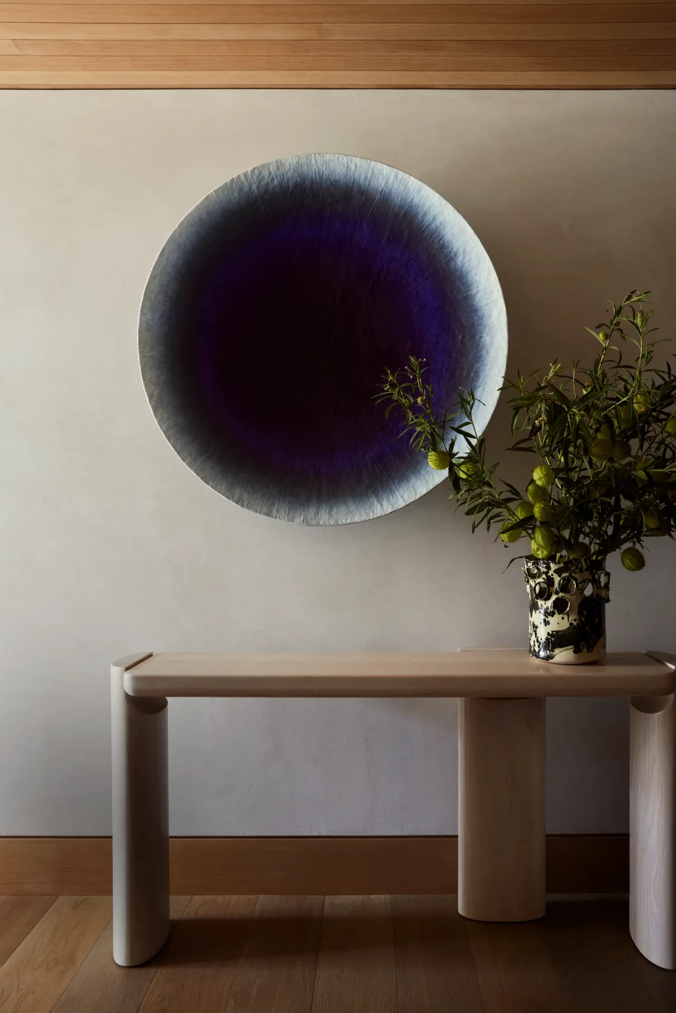 Η συνεργασία με τον αρχιτέκτονα Anders Lasater υπήρξε καθοριστική. Μαζί επαναπροσδιόρισαν τα δομικά στοιχεία, ισορροπώντας τις αναλογίες και χαρίζοντας στην κατοικία μια αίσθηση ισορροπημένης συμμετρίας. Εμβληματικό στοιχείο αποτελεί η μεγάλη ξύλινη επένδυση που λειτουργεί ταυτόχρονα ως γκαλερί τέχνης, coffee bar και χώρος αποθήκευσης, μια σύνθεση που συνδυάζει πρακτικότητα, λειτουργία και αισθητική ευαισθησία σε ένα ενιαίο σύνολο.