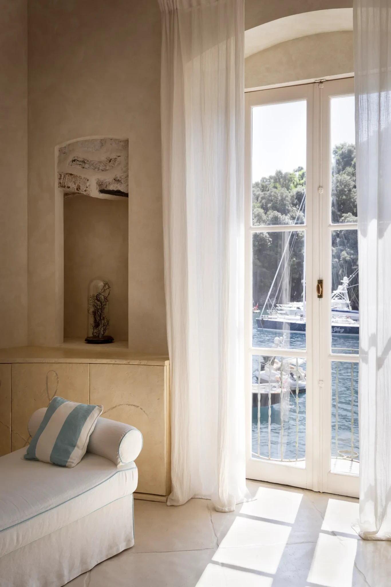Ένα μεσογειακού ύφους σπίτι στην καρδιά του Πορτοφίνο συνδέει τη θάλασσα και τη φύση με το εσωτερικό. Η θέα στο λιμάνι και το Castello Brown γίνεται καθημερινότητα, ενώ οι μεγάλες μπαλκονόπορτες και το φυσικό φως αναδεικνύουν τις καμπύλες και τις απαλά διαμορφωμένες γραμμές του χώρου. Τα φυσικά υλικά, όπως το παλαιωμένο ξύλο και η πελεκημένη πέτρα, ενσωματώνουν την τοπική παράδοση, ενώ τα χειροποίητα έπιπλα, όπως το τραπέζι από κορμό ελιάς και οι καρέκλες Superleggera της Cassina, προσδίδουν χαρακτήρα και κομψότητα. Η σπειροειδής σκάλα ενώνει τους ορόφους, ενώ η θέα από το υπνοδωμάτιο προσφέρει αίσθηση απεραντοσύνης. Το μπάνιο με μπανιέρα από Tadelakt και η ντουζιέρα λαξευμένη στον βράχο δημιουργούν εμπειρία χαλάρωσης. Το δωμάτιο επισκεπτών με παλαιωμένη ξυλεία προσφέρει ζεστή ατμόσφαιρα. Το αποτέλεσμα είναι μια κατοικία που παντρεύει μεσογειακή αισθητική και ευαίσθητη αρχιτεκτονική, προσφέροντας χώρο ξεκούρασης, δημιουργικότητας και σύνδεσης με το περιβάλλον.