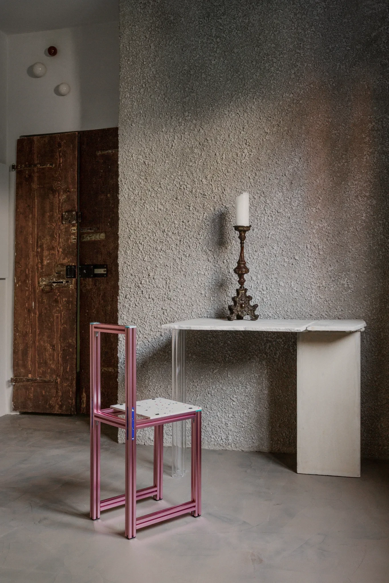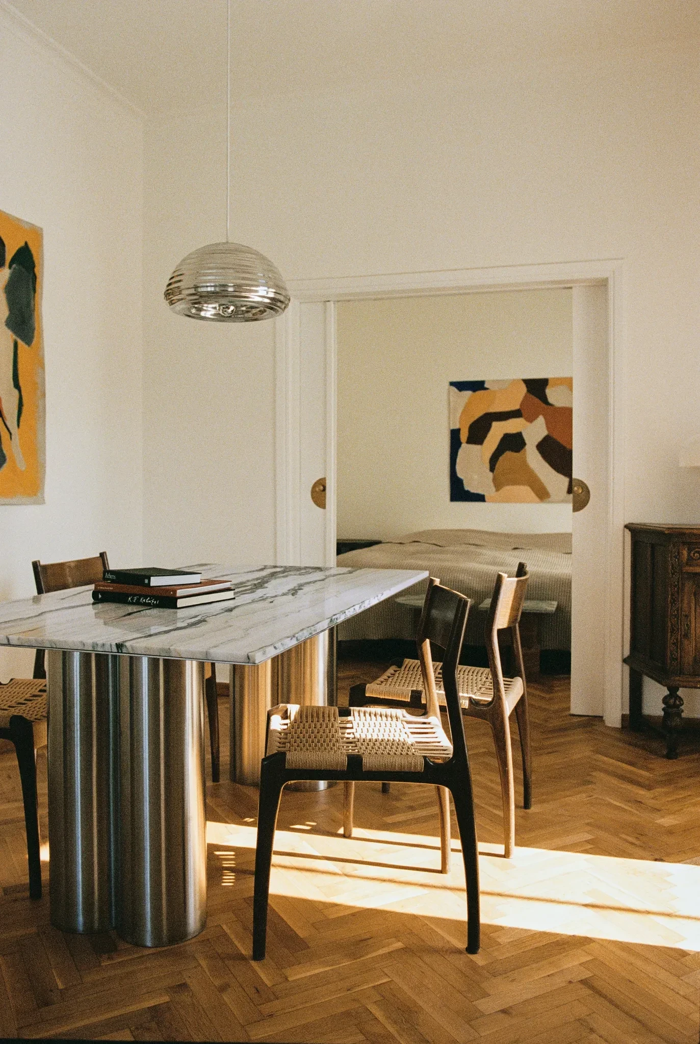 ΔΑυτό το διαμέρισμα συνδυάζει τα κλασικά στοιχεία της παρισινής αρχιτεκτονικής με μια σύγχρονη, εκρηκτική αίσθηση. Οι καμπυλόγραμμες επιφάνειες ενσωματώνουν αποθηκευτικούς χώρους, ενώ τα έντονα χρώματα, όπως το layette μπλε και το candy crush ροζ, συνυπάρχουν με τα ξύλινα πατώματα και τις κορνίζες, δημιουργώντας αντίθεση μεταξύ παραδοσιακού και μοντέρνου. Η μουσική και η τέχνη ενσωματώνονται αρμονικά, δίνοντας στον χώρο ζωντάνια, ενέργεια και παιχνιδιάρικο χαρακτήρα.