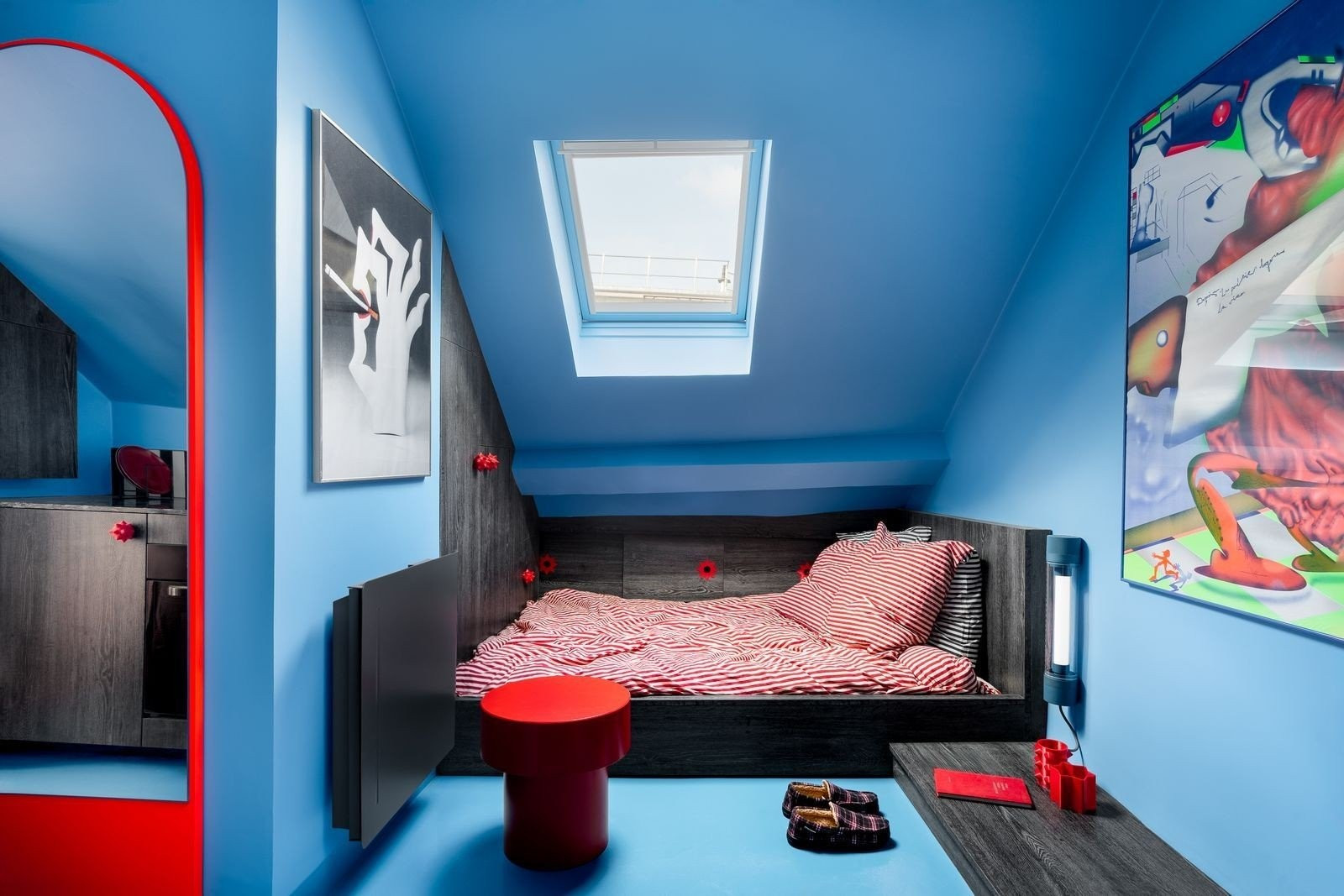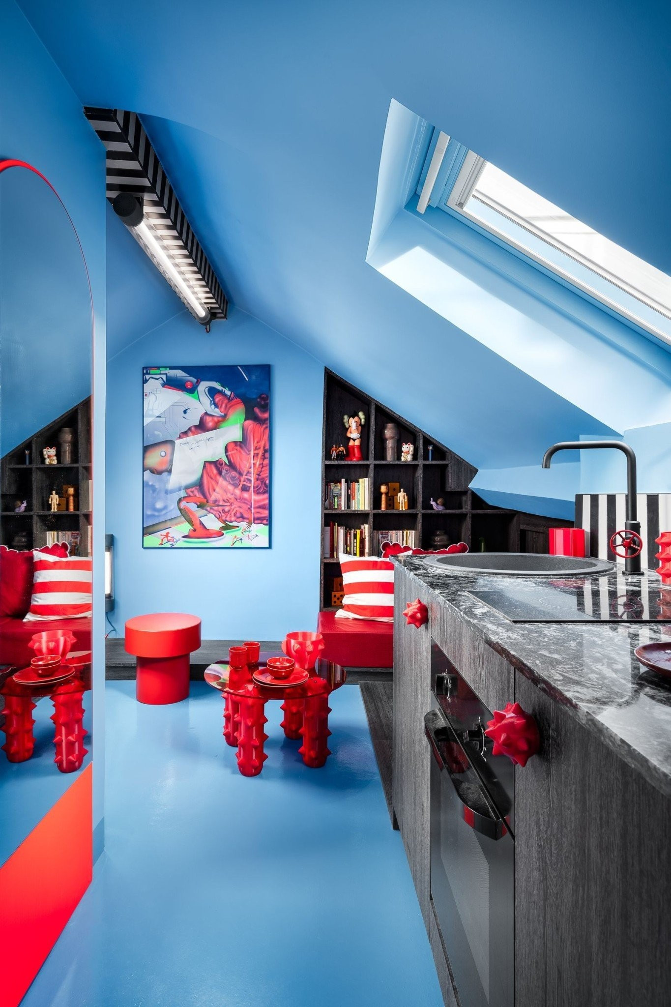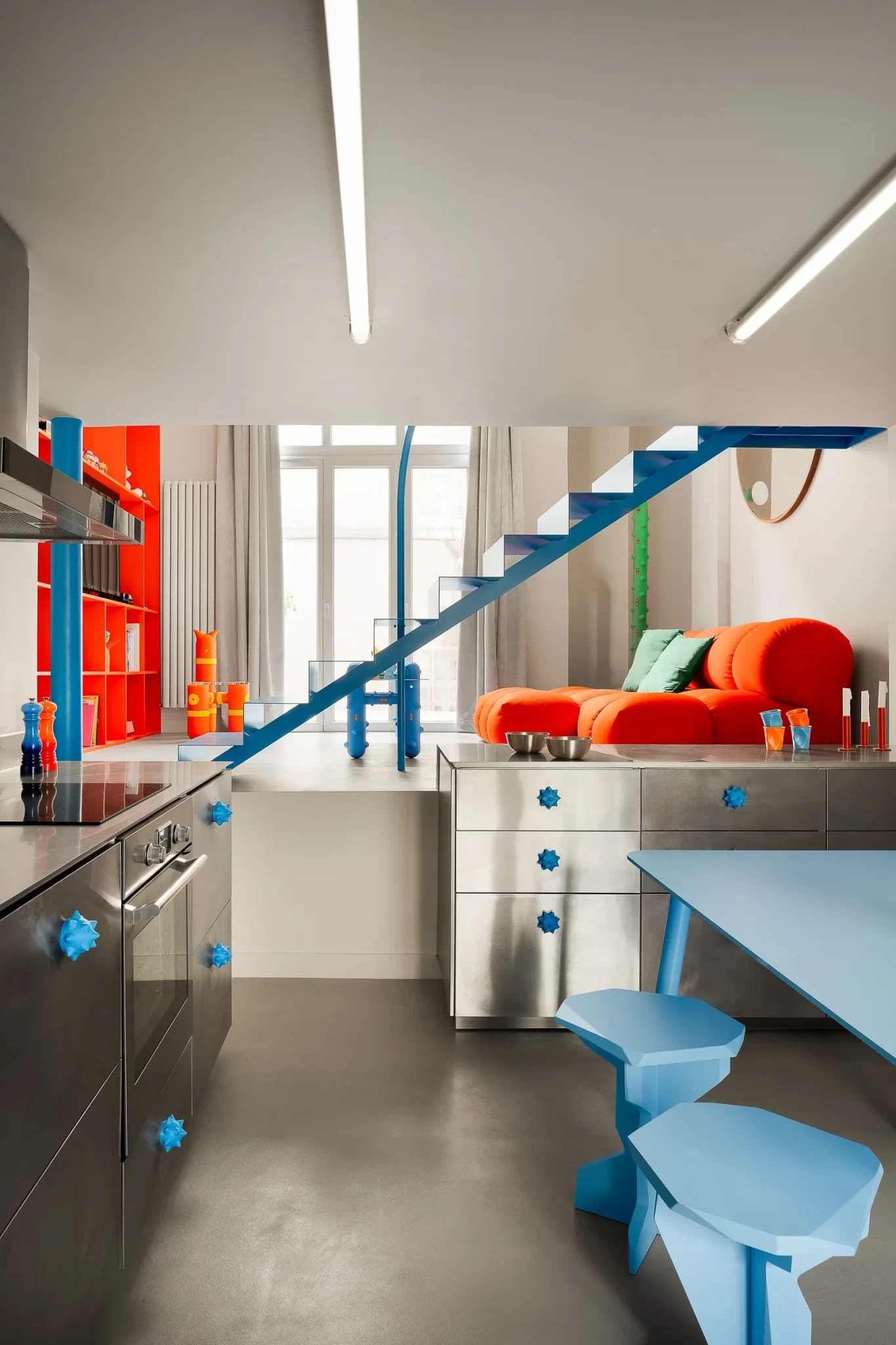 Σε αυτό το μικρό διαμέρισμα, η σκάλα από μπλε μέταλλο ενώνει τρεις ημι-επίπεδους χώρους και λειτουργεί ως κεντρικό στοιχείο, ενώ τα μεγάλα ανοίγματα δημιουργούν ένα ανοιχτό, συνεχές περιβάλλον. Η έντονη χρήση χρωμάτων και τα έπιπλα με καρτούν αναφορές, όπως η πορτοκαλί βιβλιοθήκη και ο καναπές σε σχήμα φυσαλίδας, ενισχύουν τη φανταστική ατμόσφαιρα. Κάθε λεπτομέρεια, από τις πόρτες με χερούλια Mario Bros μέχρι τα διακοσμητικά στοιχεία, συμβάλλει στη δημιουργία ενός παιχνιδιάρικου και λίγο εξωπραγματικού κόσμου.