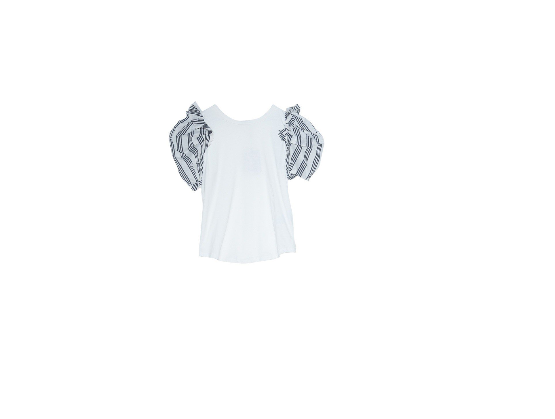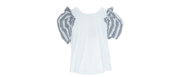 Σίγουρα, ένα λευκό μπλουζάκι είναι ίσως και το πιο βασικό κομμάτι μιας γκαρνταρόμπας. Είναι απαραίτητο για κάθε γυναίκα ανεξαρτήτως ηλικίας, στιλ και προσωπικότητας. Από τη στιγμή όμως που μιλάμε για μία μίνι wardrobe με μόνο 9 κομμάτια, δε θα μπορούσαμε να αρκεστούμε σ' ένα απλό T-Shirt. Αντιθέτως, προτείνουμε ένα με μεγάλους ώμους και φουσκωτά μανίκια, που θυμίζουν λίγο τα 80’s και θα φορεθεί τόσο στη δουλειά με μία ψηλόμεση ζιπ κιλότ, όσο και σε μία χαλαρή βόλτα μ' ένα denim παντελόνι.
