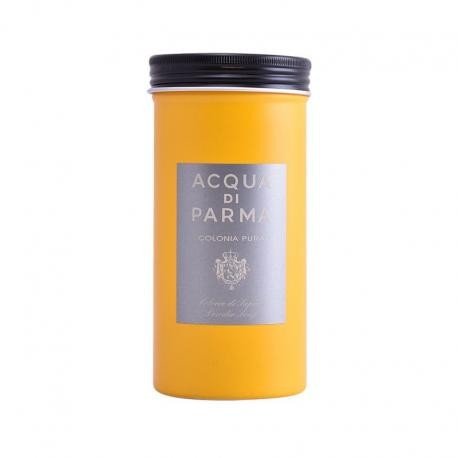 Colonia Pura Powder Soap, Acqua di Parma: Μια καινοτόμα υφή, ελαφρύ και μεταξένιο σαπούνι σε μορφή πούδρας, δημιουργεί έναν πλούσιο, βελούδινο αφρό κατά την επαφή του με το νερό για να καθαρίσει απαλά την επιδερμίδα. Η συσκευασία του -κομψό, μεταλλικό δοχείο- θυμίζει τις κλασικές συσκευασίες του ταλκ από το παρελθόν, με το χαρακτηριστικό λαμπερό κίτρινο της Acqua di Parma. Η ετικέτα της συσκευασίας δείχνει το χαρακτηριστικό άρωμά του: Ασημένια ετικέτα: Colonia Pura με ένα καθαρό, φρέσκο και λαμπερό άρωμα.