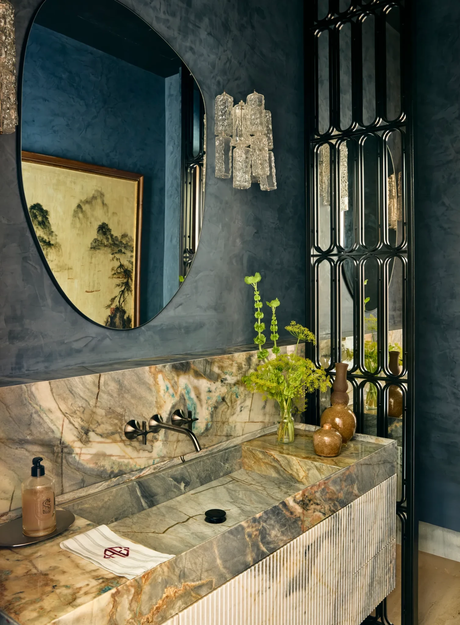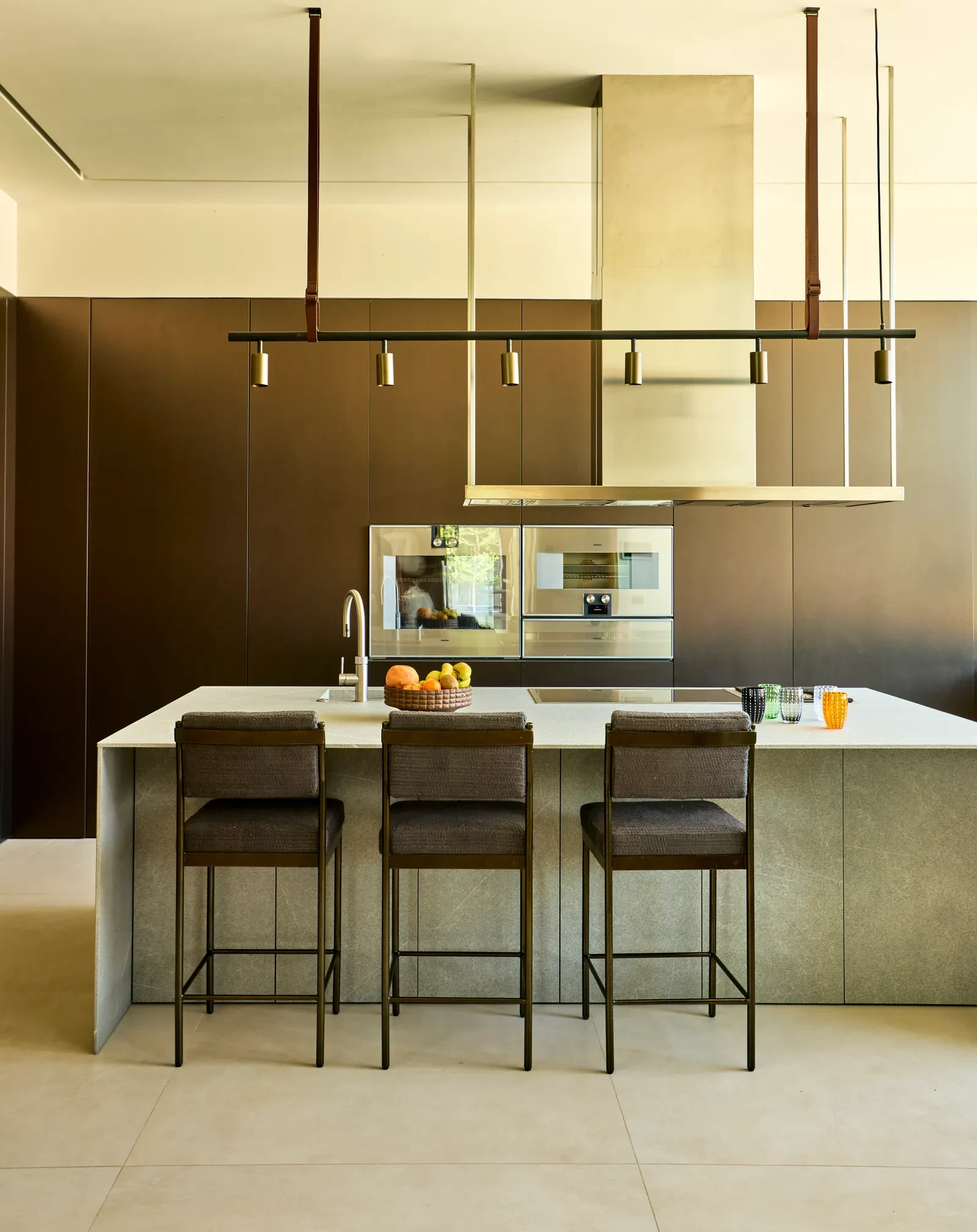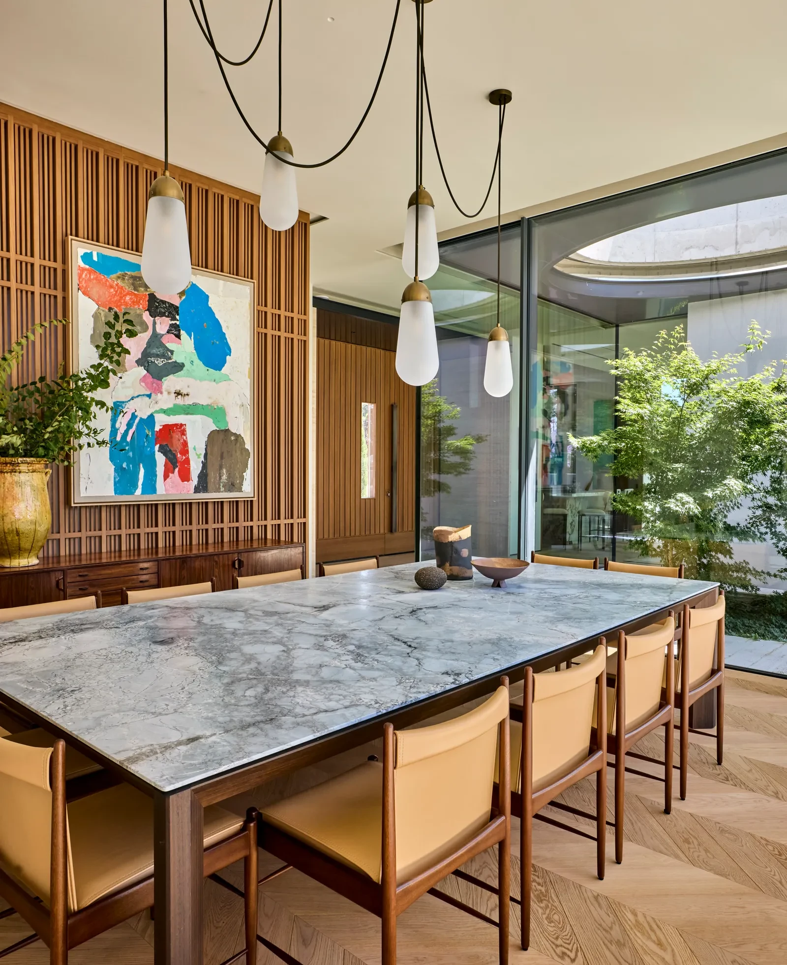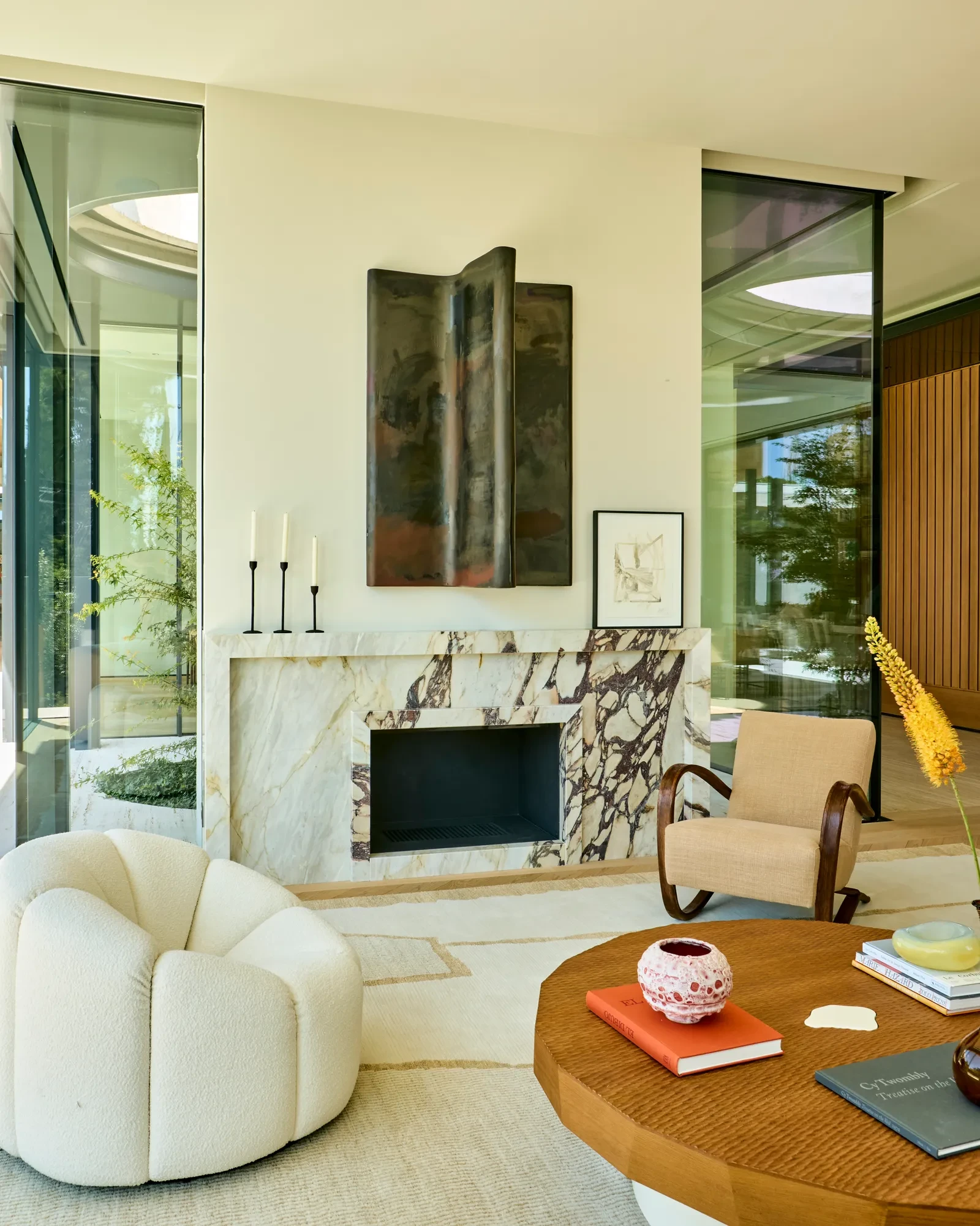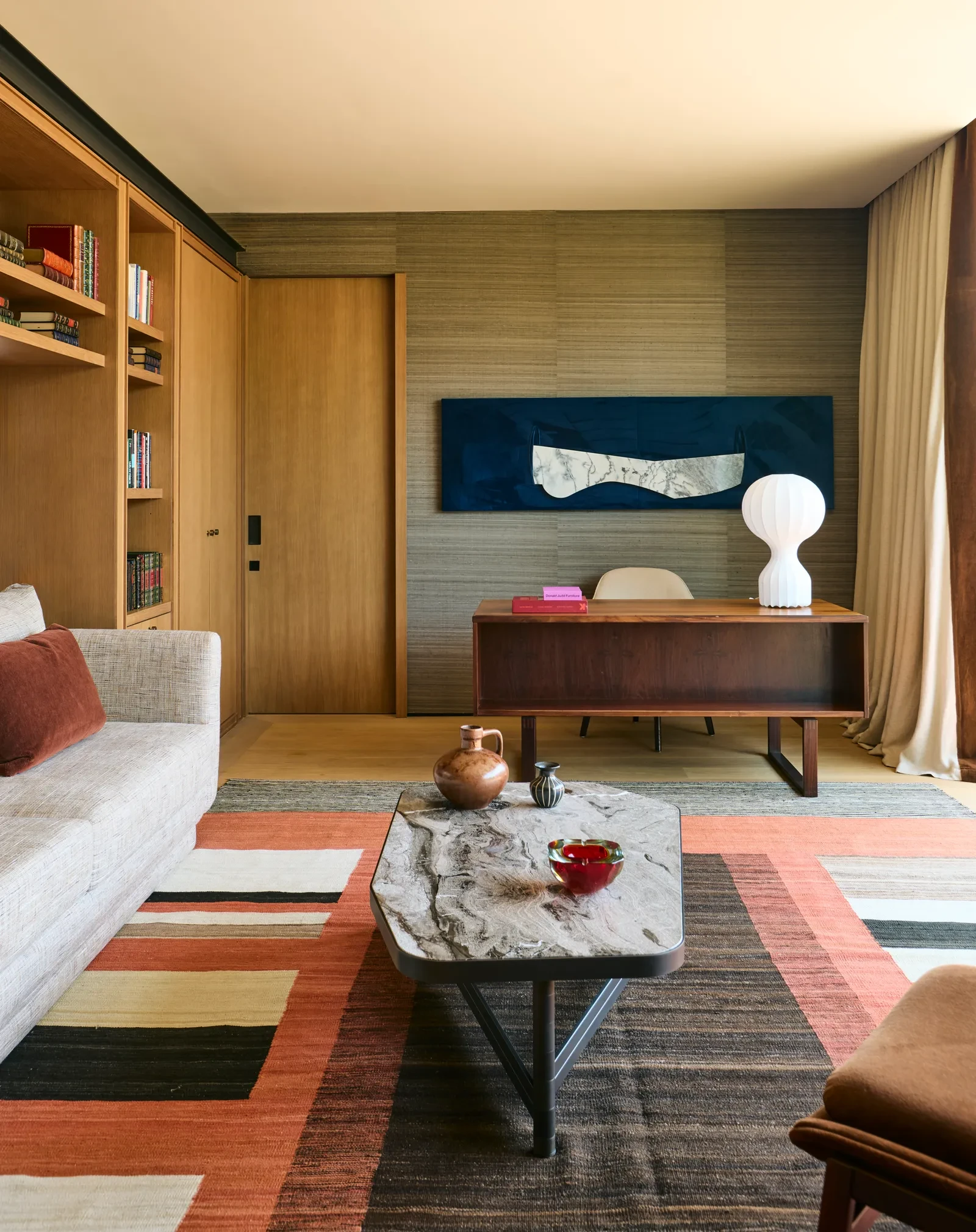 Το μαρμάρινο τζάκι και το bar προσθέτουν κομψότητα και λειτουργικότητα, ενώ οι επιφάνειες σε δρυ και ταβερτίνι προσδίδουν αίσθηση σταθερότητας και βάθους. Η σύνθεση των έργων τέχνης με την αρχιτεκτονική γραμμή δημιουργεί ένα χώρο όπου η αισθητική και η λειτουργικότητα συνυπάρχουν με φυσικότητα.