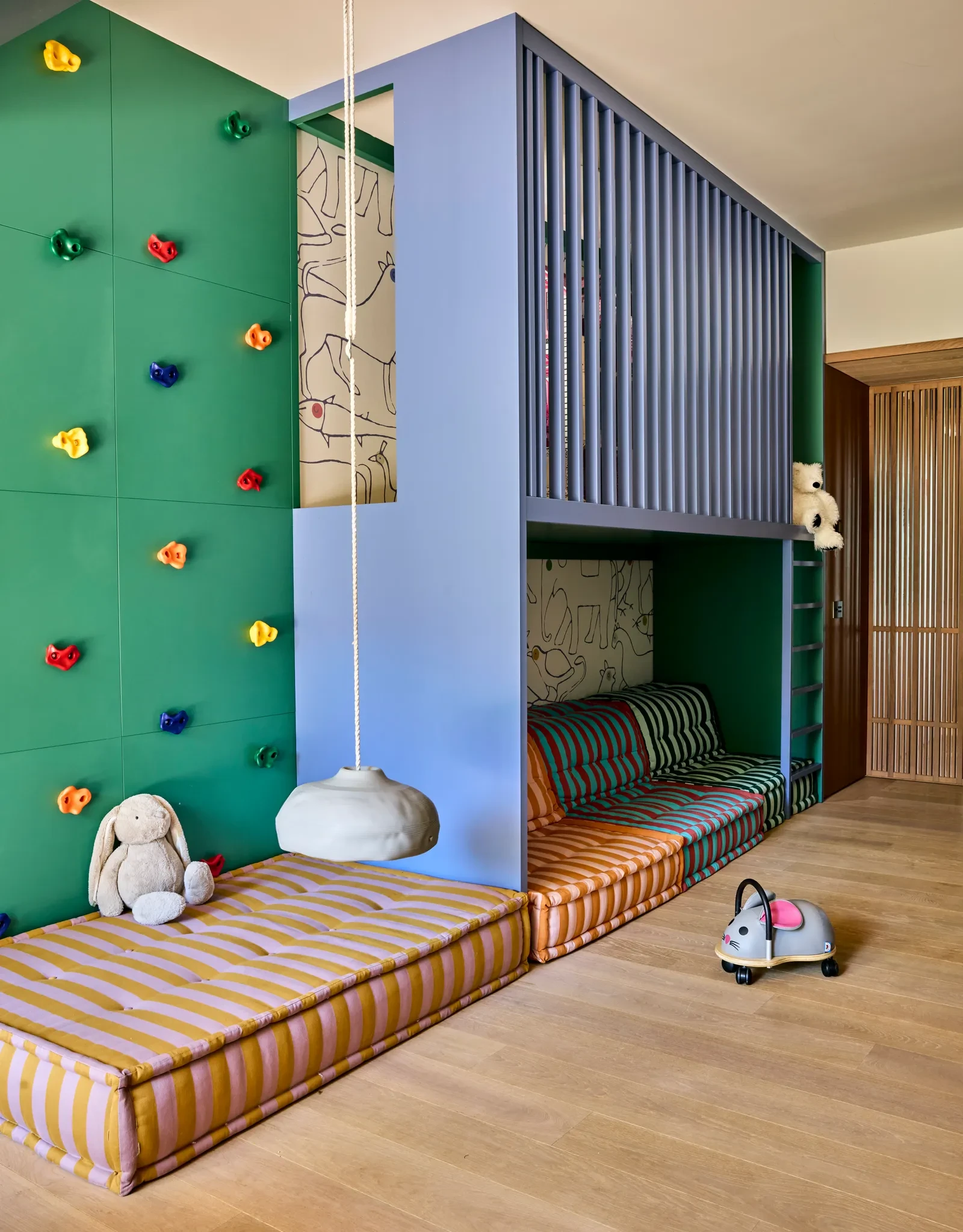 Η χρωματική παλέτα του σπιτιού είναι ζωντανή, τολμηρή και ευρηματική. Στο παιδικό δωμάτιο, τα έντονα χρώματα και οι φυσικές υφές δημιουργούν έναν χώρο παιχνιδιού και φαντασίας. Τα δύο ξύλινα κρεβάτια με τοξωτή κατασκευή συνδυάζονται με έντονες αποχρώσεις, ενώ ένας πράσινος τοίχος-αναρρίχηση φέρνει την αίσθηση του εξωτερικού περιβάλλοντος στο εσωτερικό. Η δημιουργικότητα και η χαρά των παιδιών γίνονται αισθητές σε κάθε γωνία, ενώ ο σχεδιασμός ενθαρρύνει την κοινωνικότητα και την κίνηση.
