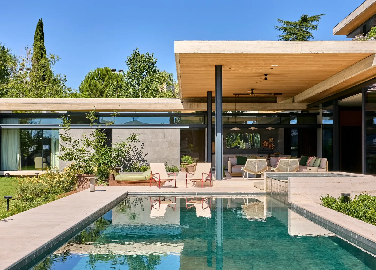 Η πισίνα και η συνολική pool area συνθέτουν έναν χώρο χαλάρωσης που αναδεικνύει την αρχιτεκτονική λιτότητα και τη φυσική ομορφιά του περιβάλλοντος. Οι γραμμές του landscape design υπογραμμίζουν την κατακόρυφη διάσταση και τον οργανικό χαρακτήρα της κατοικίας, ενώ το περιβάλλον πρασίνου αγκαλιάζει την πισίνα, δημιουργώντας μια αίσθηση προστασίας και ισορροπίας. Η σκεπαστή βεράντα λειτουργεί ως επέκταση του καθιστικού, προσφέροντας έναν χώρο άνεσης και κοινωνικής ζωής μέσα σε πλαίσιο πολυτέλειας.