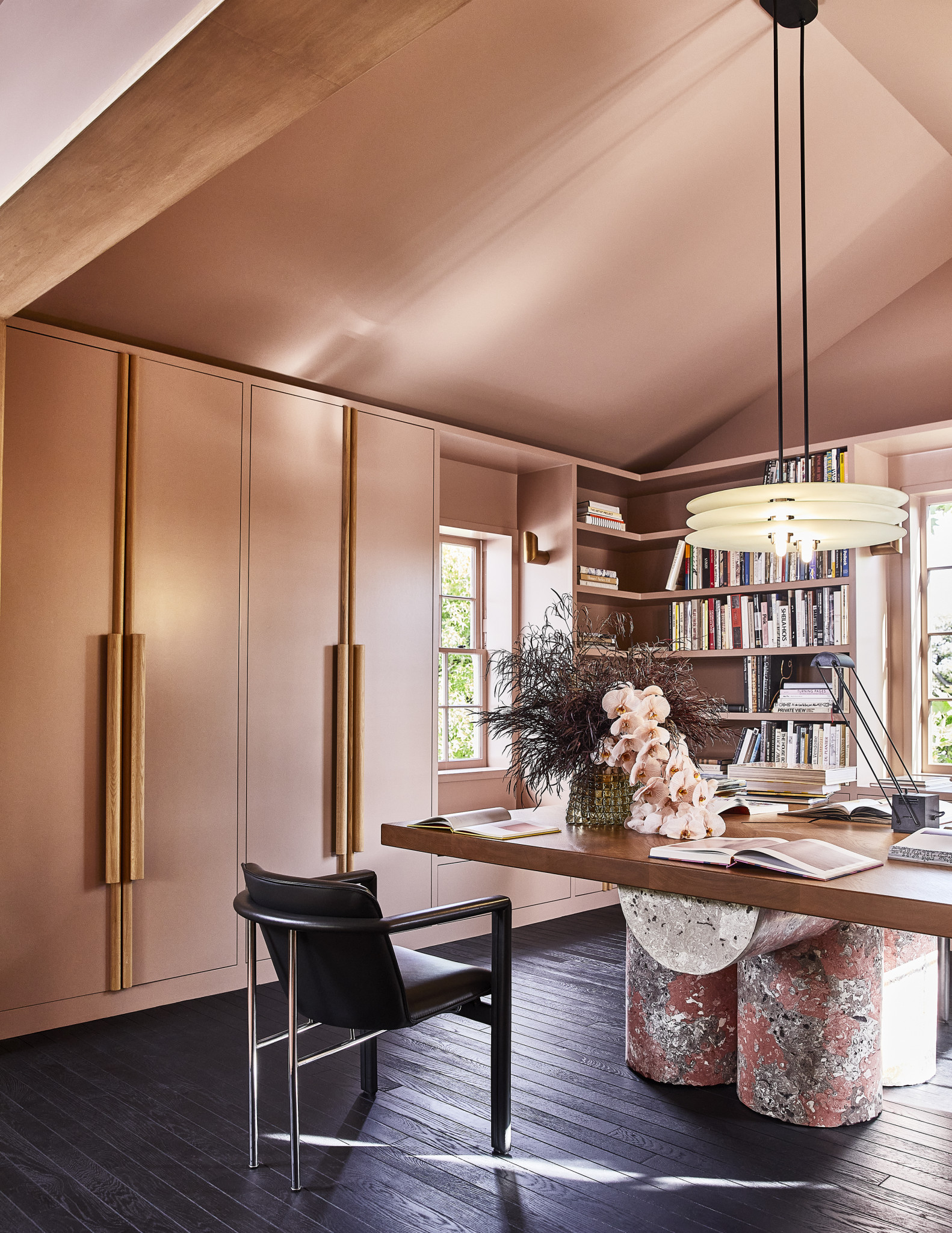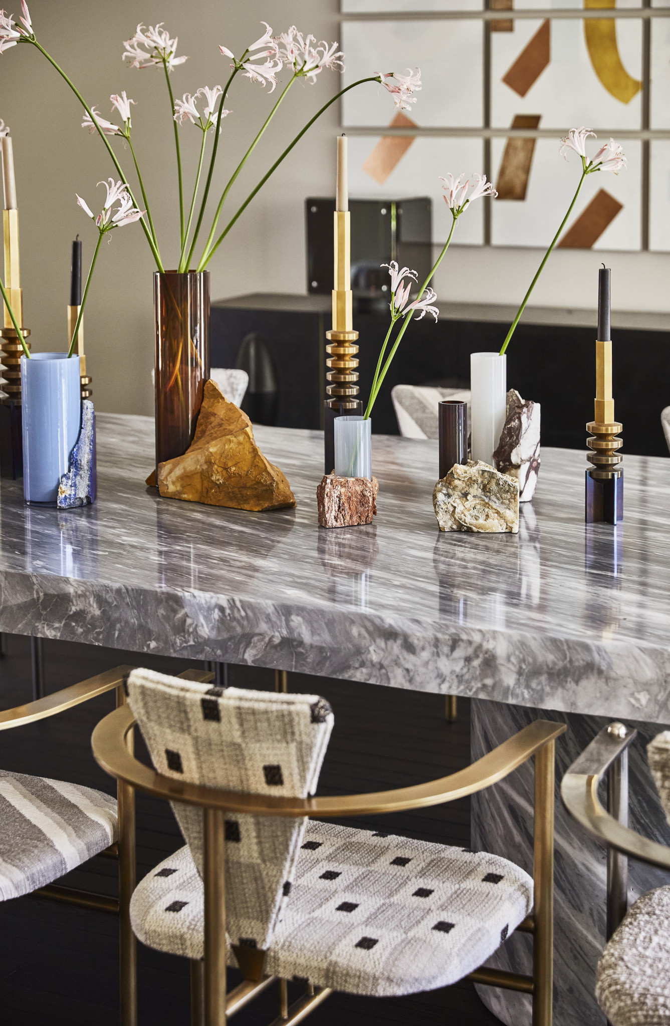 Το vibe, όμως, αλλάζει στο Game Room το οποίο διαφέρει από το υπόλοιπο σπίτι. Εκεί, η σχεδιάστρια επέλεξε μια πιο σκοτεινή χρωματική παλέτα, παραμένοντας ωστόσο προσηλωμένη στα luxurious υλικά. Ο καναπές “Le Bambole” από τη δεκαετία του ’70 -ένα iconic κομμάτι του οίκου B&B Italia- δημιουργεί ένα σκηνικό ήσυχης πολυτέλειας, ενώ το παιχνίδι ανάμεσα στο φως και στις σκιές που αυτό δημιουργεί δίνει στον χώρο μια κινηματογραφική, rock chic ατμόσφαιρα. Στην τραπεζαρία, τώρα, το εντυπωσιακό “rubber sideboard” -με την υπογραφή του Brian Thoreen- χαρίζει το απαραίτητο cool touch που η Wearstler πάντα ενσωματώνει στα έργα της. Πάνω από αυτό το έπιπλο, ένα gallery wall τραβάει τα βλέμματα και γίνεται ο πρωταγωνιστής του χώρου.