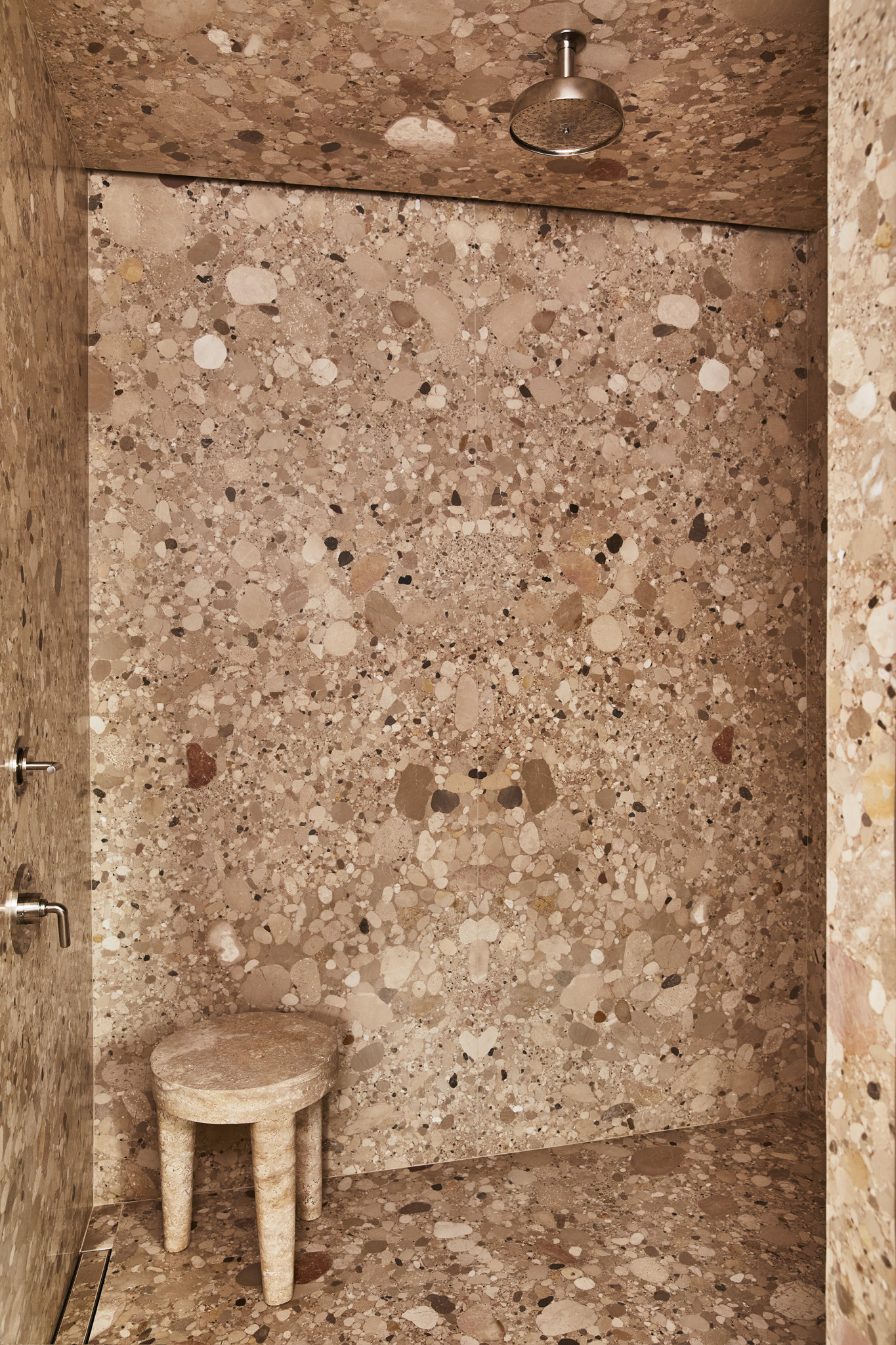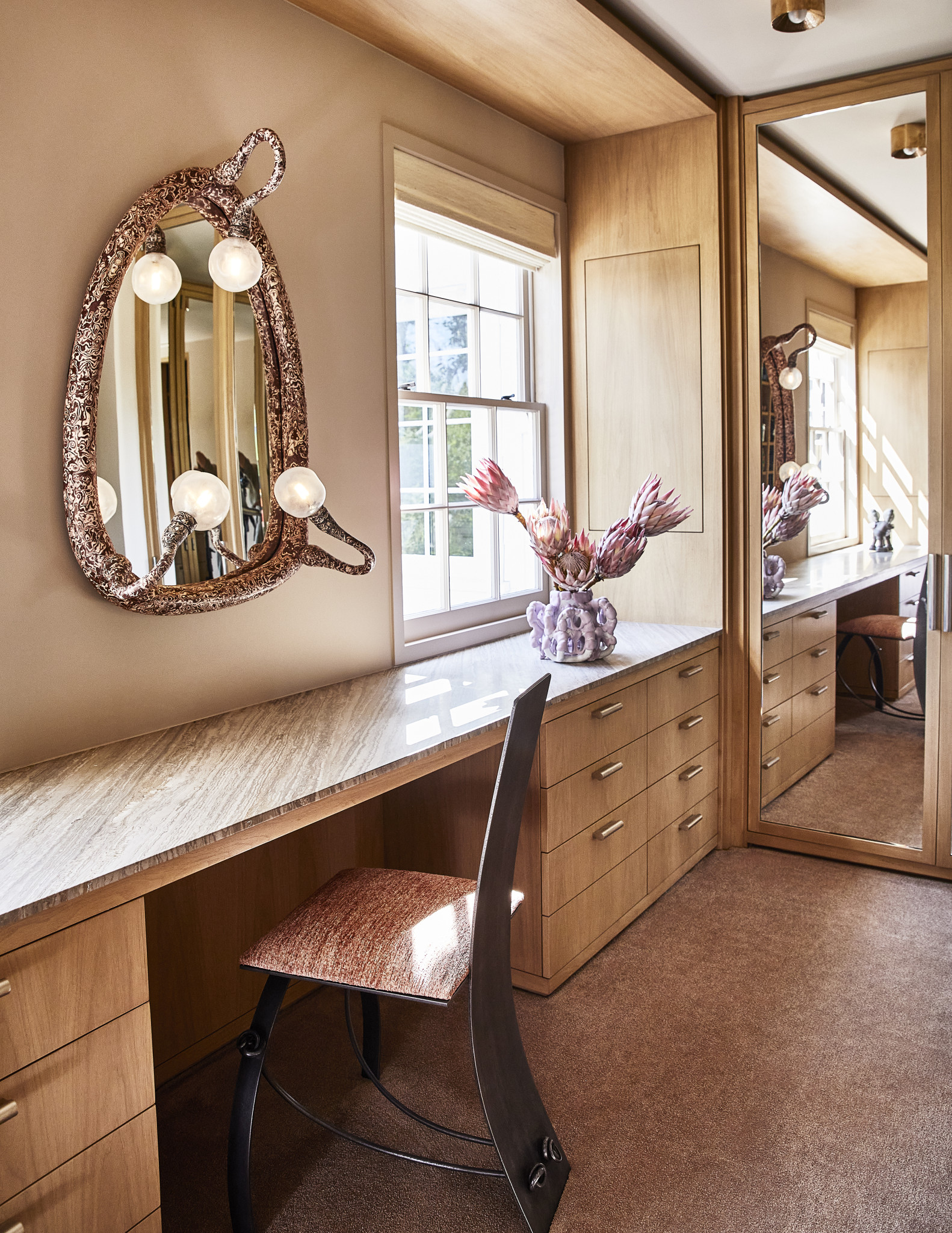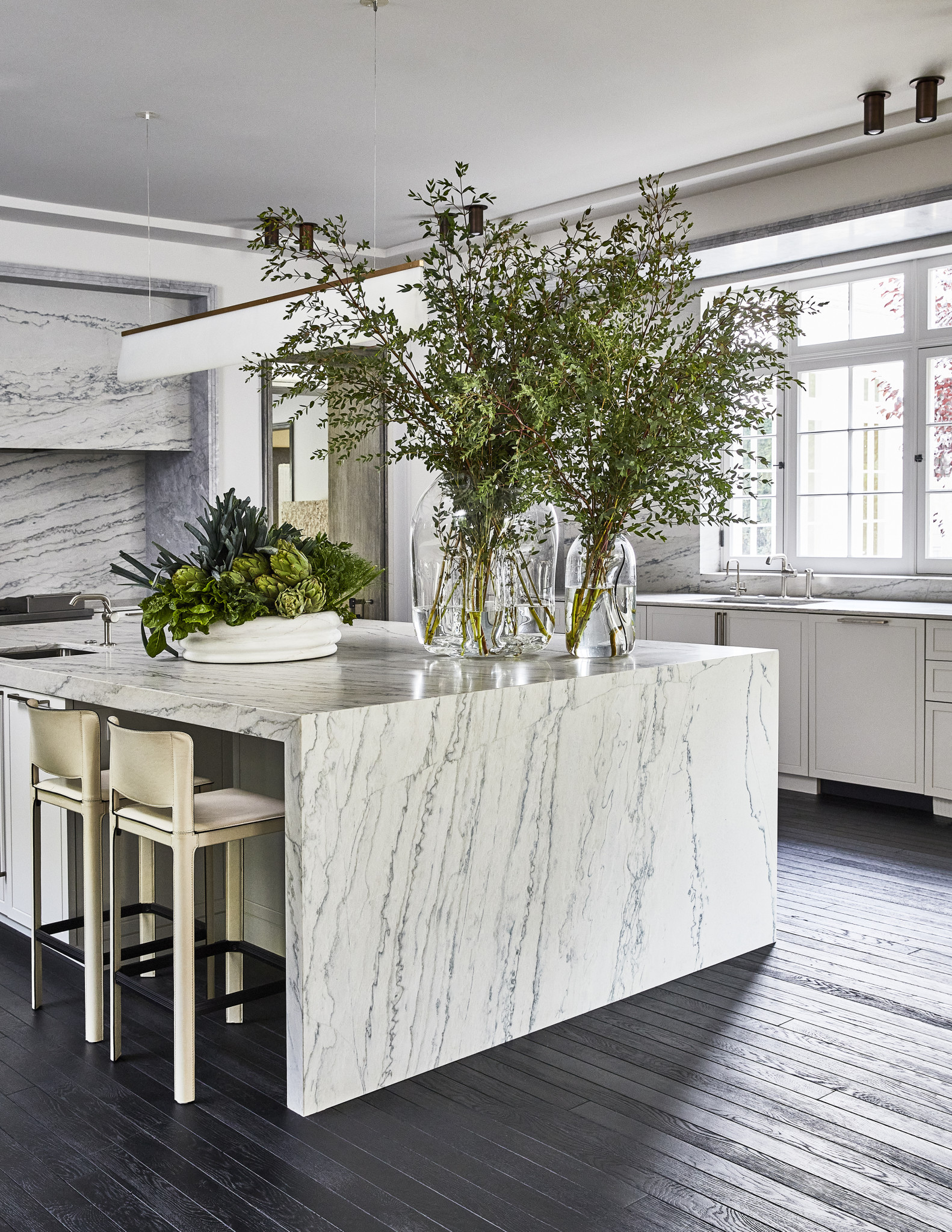 Στην πολυτελή κουζίνα, οι επιφάνειες από μάρμαρο και τα ντουλάπια σε λευκό ξύλο τη μετατρέπουν σε σημείο συνάντησης για τους ιδιοκτήτες - ένα μέρος που εμπνέει για ατελείωτη δημιουργικότητα. Εκεί, όπως και στα περισσότερα σημεία της κατοικίας, πανέμορφα φυτά έχουν βρει τη θέση τους σε βάζα, ενισχύοντας την παρουσία του χρώματος και των φυσικών στοιχείων. Αντίστοιχα, το κυρίως μπάνιο -επενδυμένο εξ ολοκλήρου με Ceppo Beige πέτρα- αποπνέει μια αίσθηση γλυπτικής καθαρότητας. Οι γήινοι τόνοι και η μονοχρωματική παλέτα προσφέρουν μια σχεδόν διαλογιστική εμπειρία, όπου το φως -που εισέρχεται ανεμπόδιστο από το παράθυρο-αναδεικνύει κάθε στοιχείο του design.