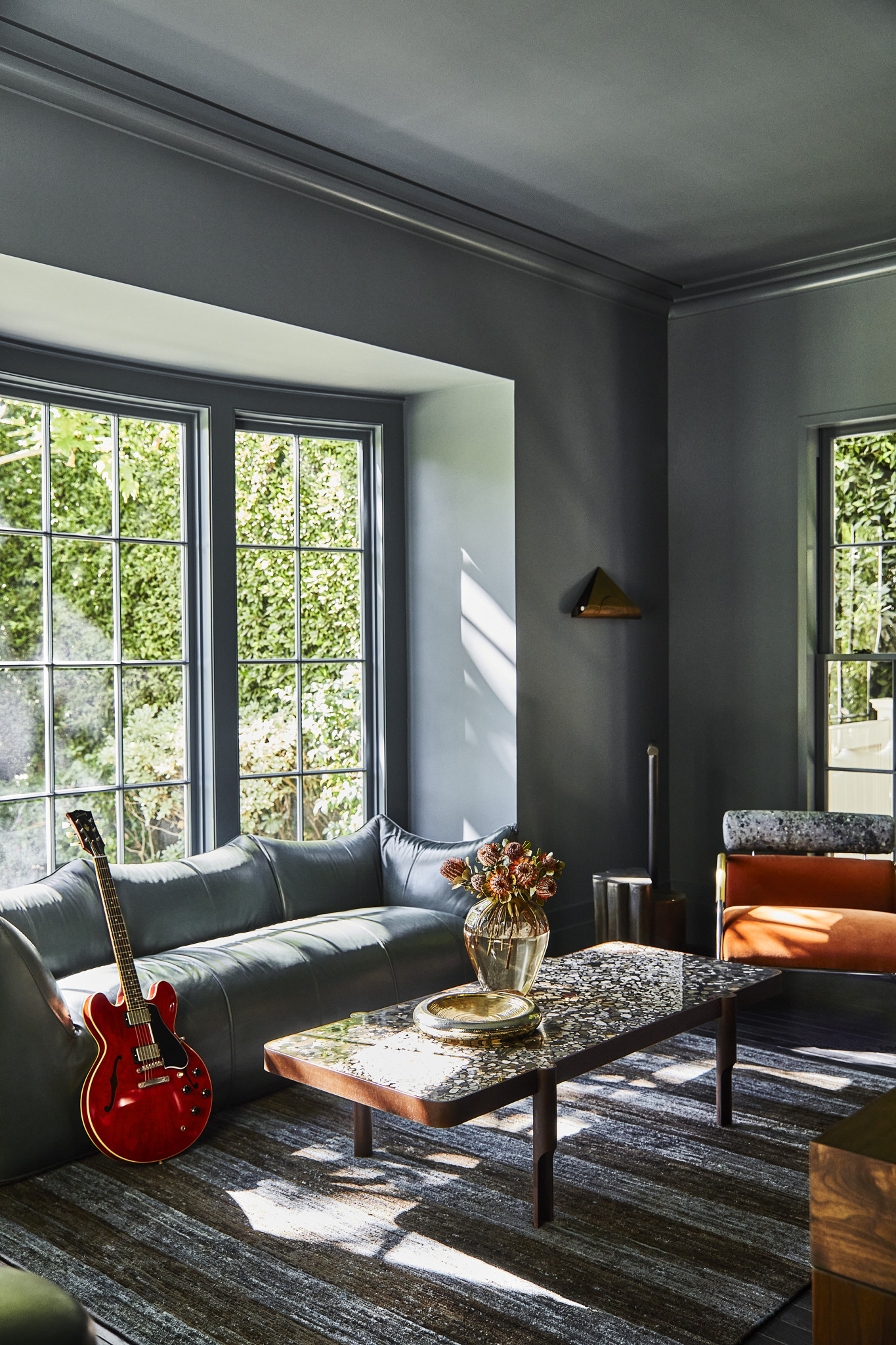Η αγάπη της interior designer για τα υλικά και τις αντιθέσεις τους αποτυπώνεται σε κάθε λεπτομέρεια μέσα σε αυτό το σπίτι. Ξεκινώντας από το καθιστικό, εκεί η συνάντηση διαφορετικών εποχών και υφών στα υφάσματα συνθέτει μια cozy ατμόσφαιρα, με μια glam πινελιά που δεν περνά απαρατήρητη. Το δρύινο πάτωμα, το χαλί από μετάξι στο χρώμα του κεχριμπαριού και τα αντικείμενα σε τόνους του χαλκού συνδυάζονται αρμονικά και συνθέτουν έναν ενδιαφέροντα διάλογο ανάμεσα στο φως και στην ύλη. Γλυπτικά έπιπλα, επιλεγμένα artworks και redesigned vintage κομμάτια ενώνουν το παλιό με το νέο, χωρίς τίποτα να φαντάζει επιτηδευμένο. Ο χώρος αποτελεί ένα σκηνικό που ισορροπεί ανάμεσα στη νοσταλγία και το σύγχρονο σχεδιαστικό ύφος. Η Kelly Wearstler, άλλωστε, έχει τη μοναδική ικανότητα να κάνει το vintage να δείχνει μοντέρνο, προσδίδοντάς του χαρακτήρα.