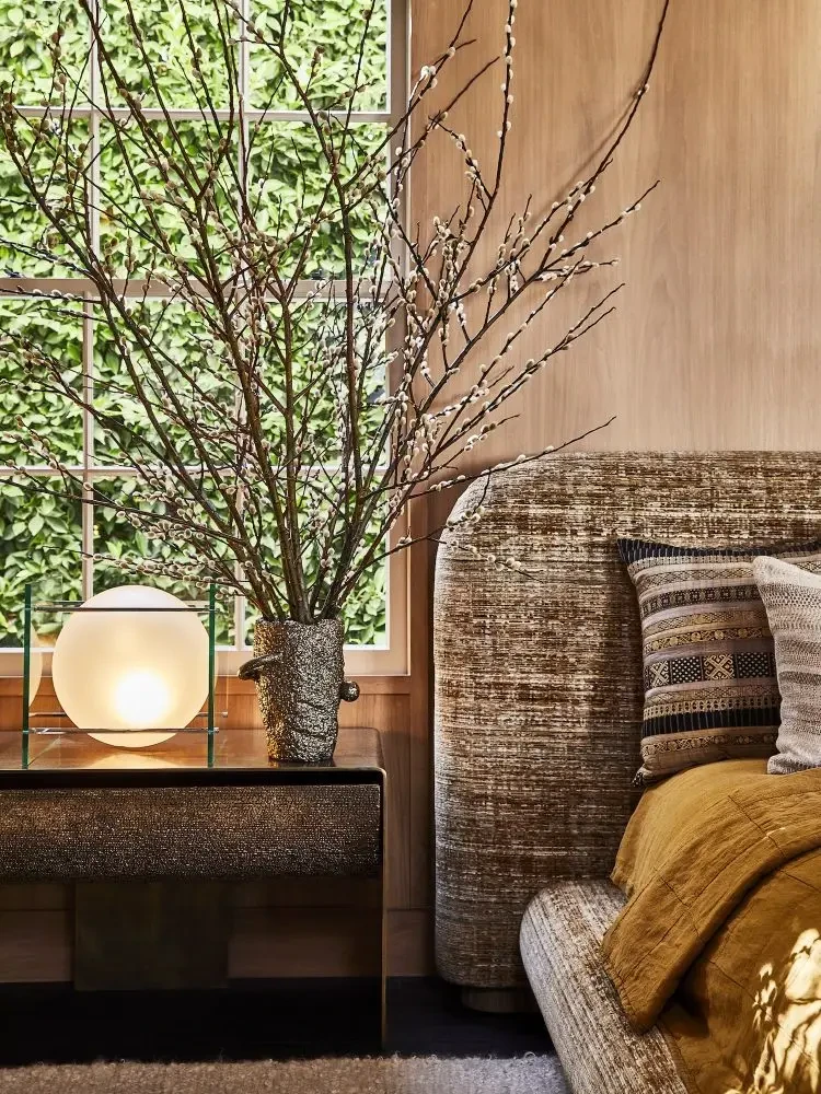 Όσο για το υπνοδωμάτιο, η θέα προς το καταπράσινο εξωτερικό περιβάλλον μοιάζει σαν να φέρνει μέσα το τοπίο. Οι θερμές αποχρώσεις και ο ζεστός φωτισμός, οι μεταλλικές λεπτομέρειες, τα απαλά υφάσματα, τα μαξιλάρια με τις ethnic σχεδιαστικές επιρροές και η διακριτική παρουσία του ανοιχτόχρωμου ξύλου στον τοίχο προσφέρουν μια αίσθηση ηρεμίας. Ένας μικρός προσωπικός παράδεισος, όπου όλα τα στοιχεία δένουν φανταστικά μεταξύ τους, έτσι ώστε ο χώρος αυτός να σε παρασέρνει σε στιγμές απόλυτης χαλάρωσης.