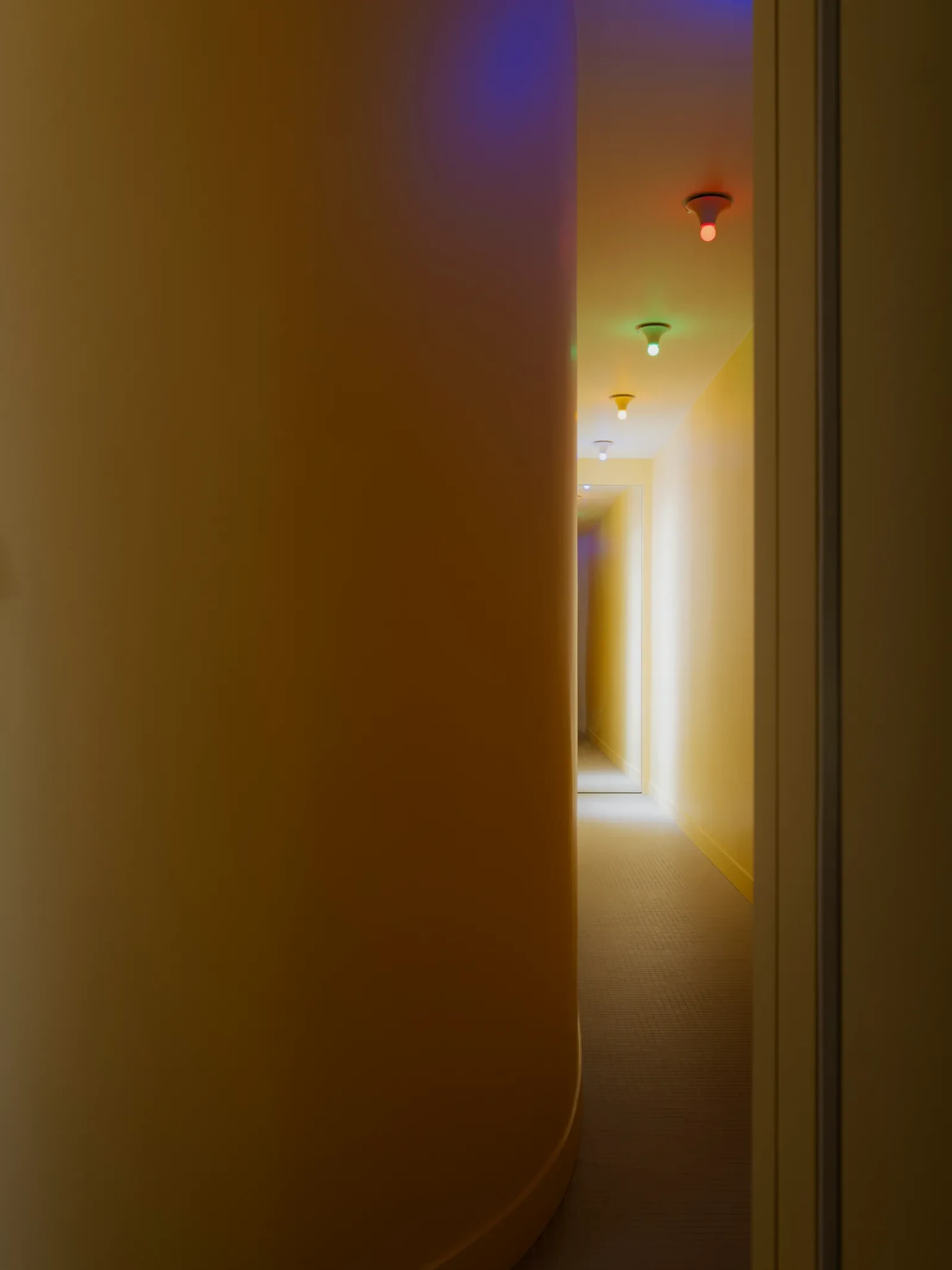 Ένας μακρύς διάδρομος, πάνω από δέκα μέτρα, κυκλώνει την αυλή του κτιρίου, δημιουργώντας μια αίσθηση βάθους και εντυπωσιακής προοπτικής. Τα χρώματα και ο φωτισμός μεταφέρουν τον επισκέπτη από τη ζωηρή αισθητική του Memphis σε σχεδόν σουρεαλιστικές ατμόσφαιρες, παραπέμποντας σε κινηματογραφικές εμπνεύσεις τύπου David Lynch. Ο διάδρομος με τα κίτρινα vanilla μωσαϊκά ολοκληρώνεται με μια εντυπωσιακή πόρτα-καθρέφτη, ενώ ο φωτισμός από πολύχρωμες λάμπες στον οροφή δημιουργεί μικρά φωτεινά «νησιά» μέσα στον χώρο.