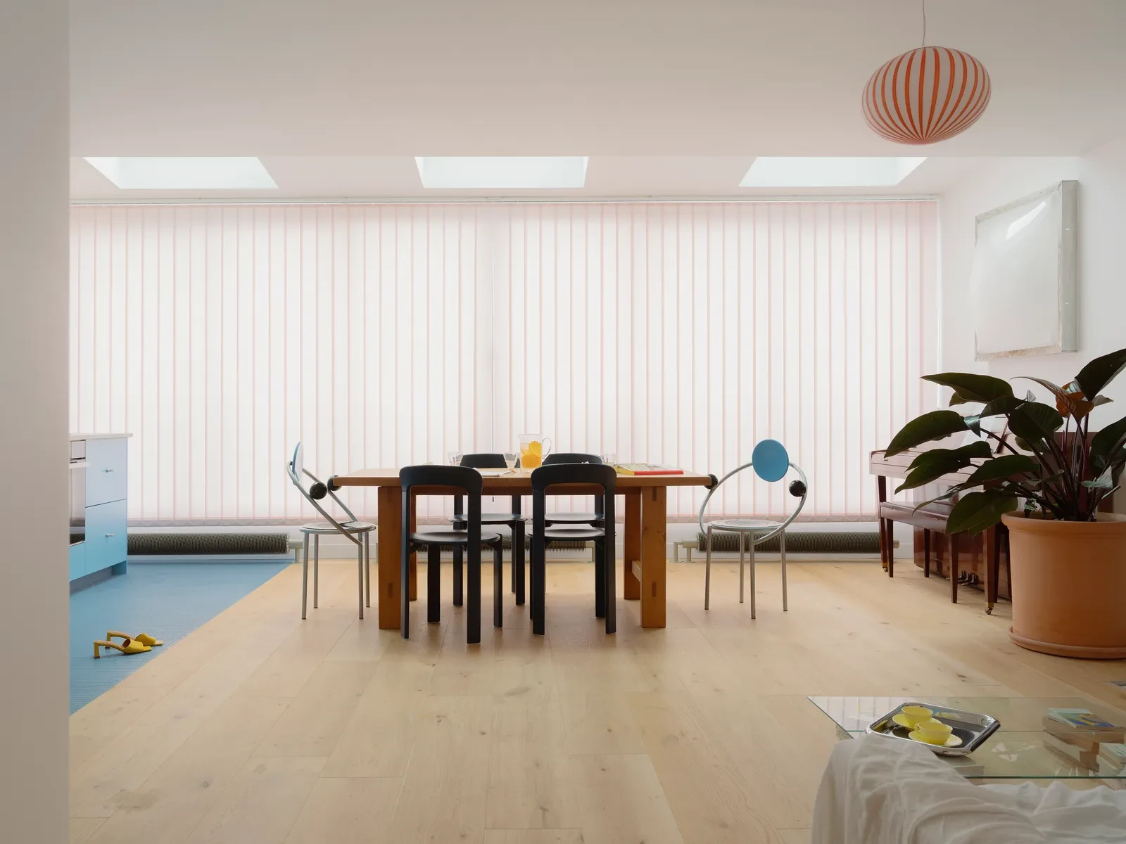 Η πρόκληση ήταν να ενταχθεί ο νέος σχεδιασμός σε έναν ήδη υπάρχοντα χώρο με αντικείμενα συλλεκτικής αξίας. Τα έπιπλα Memphis, όπως οι καρέκλες Michele de Lucchi, συνυπάρχουν με καινούργια στοιχεία που αλλάζουν αμέσως την αίσθηση του χώρου, όπως τα καλιφορνέζικα παντζούρια. Η διάθεση μεταβάλλεται ανάλογα με το αν τα παντζούρια είναι ανοιχτά ή κλειστά. Ανοιχτά, η ζωή του Παρισιού διαχέεται μέσα στο διαμέρισμα, κλειστά, δημιουργείται μια αίσθηση απομόνωσης και ηρεμίας, σαν σε παραθεριστική κατοικία, με απαλή, ροζ φωτεινή ατμόσφαιρα που αγκαλιάζει το χώρο.