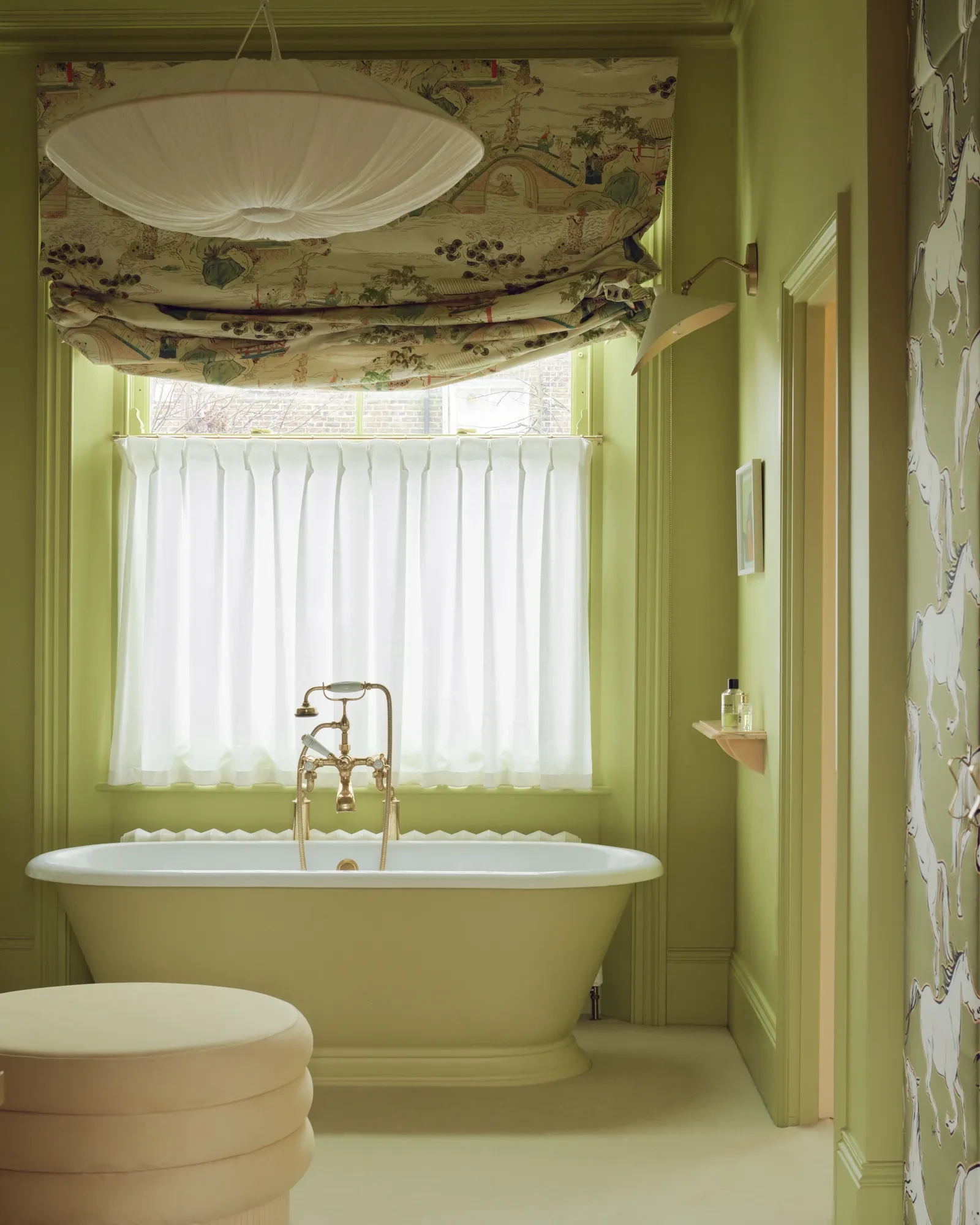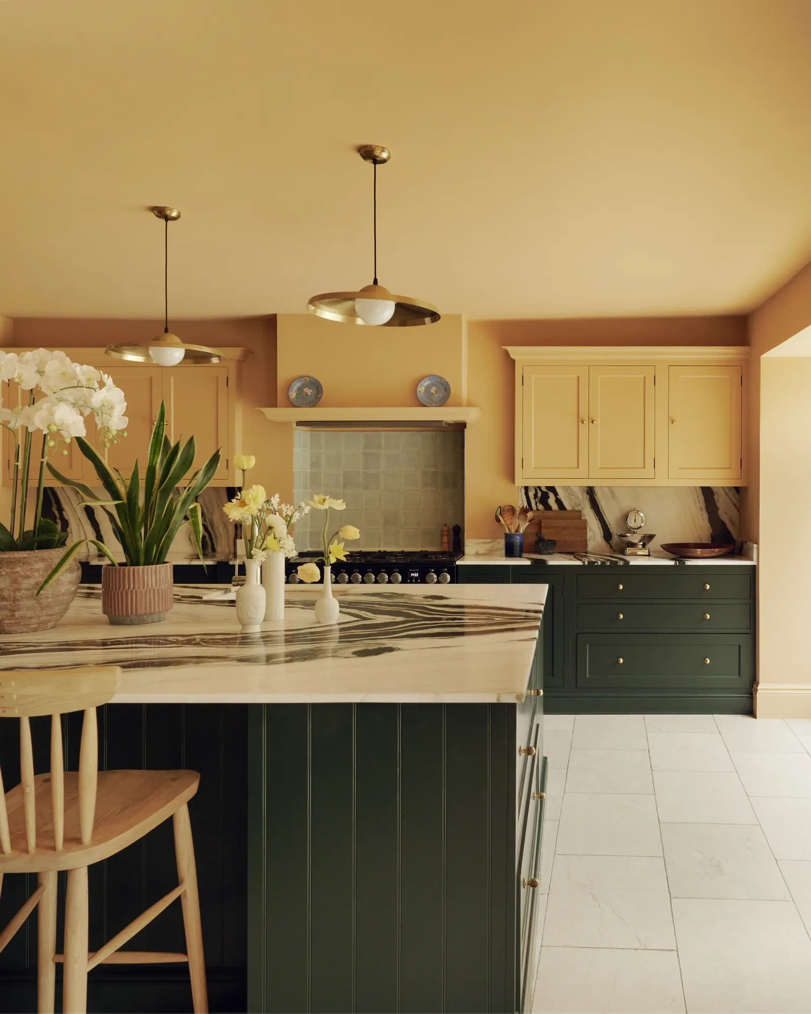 Στην κουζίνα, η χρωματική αφήγηση συνεχίζεται με μια αρμονική εναλλαγή τόνων. Οι τοίχοι και τα πάνω ντουλάπια ντύνονται με φωτεινό λεμονί, ενώ τα χαμηλά ντουλάπια αποκτούν βάθος μέσα από μια βαθιά ελαιώδη πράσινη απόχρωση. Το μαρμάρινο νησί, με σχέδιο «ζέβρας», εισάγει ένα διακριτικό μοτίβο, το μοναδικό σε αυτό το επίπεδο του σπιτιού. Οι μεγάλες επιφάνειες παραμένουν καθαρές από έντονα σχέδια, αφήνοντας το χρώμα να κυριαρχεί. Μοτίβα εμφανίζονται μόνο στις κουρτίνες, με λεπτές λεπτομέρειες όπως λεοπάρ τελειώματα που χαρίζουν ρυθμό και ενδιαφέρον, χωρίς να διαταράσσουν τη συνοχή.
