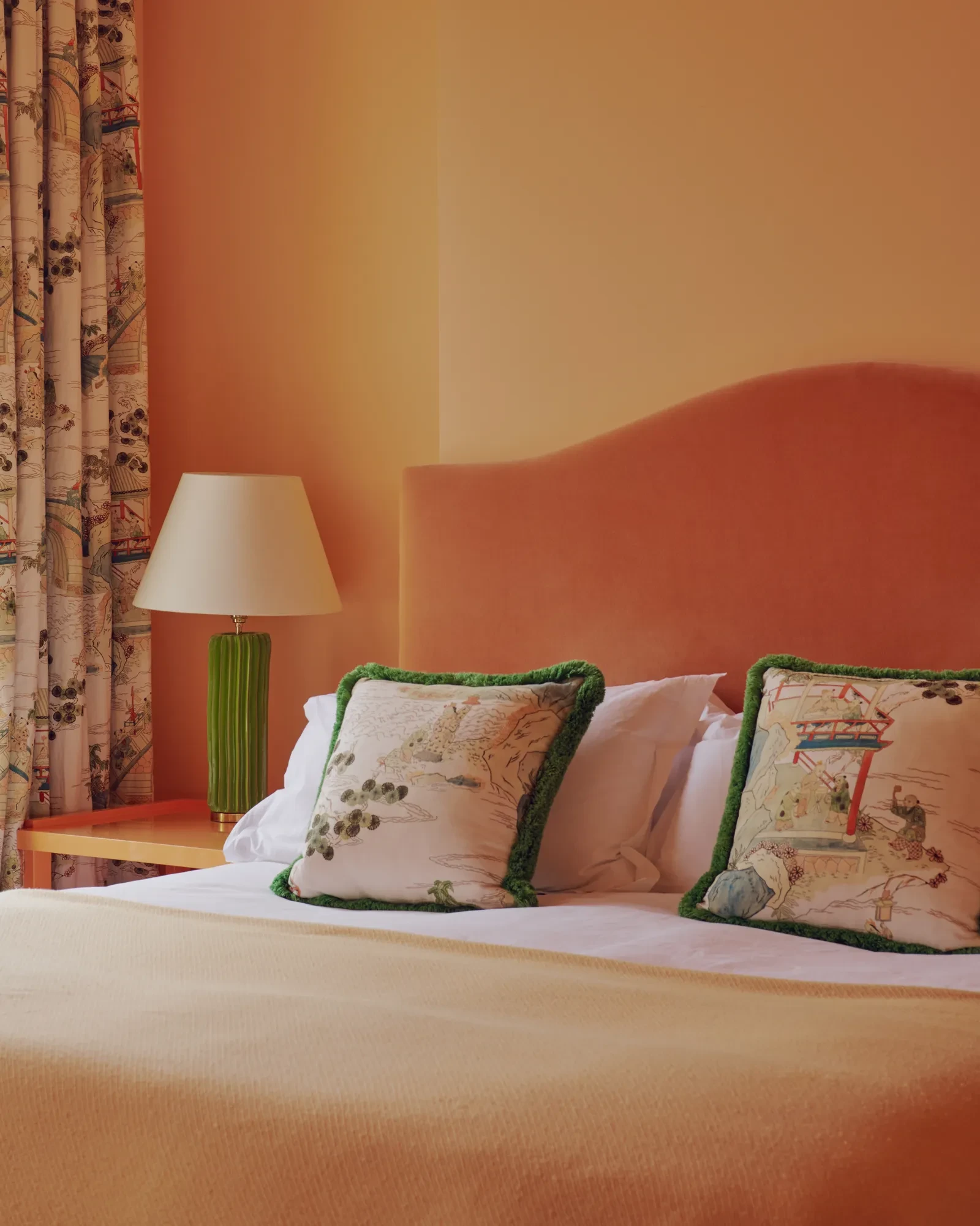 Το υπνοδωμάτιο της Von Halle είναι ένα σκηνικό ρομαντισμού και ζεστής πολυτέλειας. Οι αποχρώσεις του ροδακινί κυριαρχούν στο βελούδινο κεφαλάρι, συνδυασμένες με πράσινα κεραμικά φωτιστικά και λεπτομέρειες από ροζ μάρμαρο. Ο χώρος διαχωρίζεται από το δωμάτιο του συζύγου μέσω βαριών κουρτινών, που θυμίζουν σκηνικό θεάτρου και προσδίδουν μια αίσθηση οικειότητας αλλά και παιχνιδιάρικης μυστικότητας. Η Von Halle επιδιώκει να συνδυάσει την άνεση με τη φαντασία, δημιουργώντας ένα υπνοδωμάτιο που εκπέμπει γαλήνη και δημιουργική διάθεση.