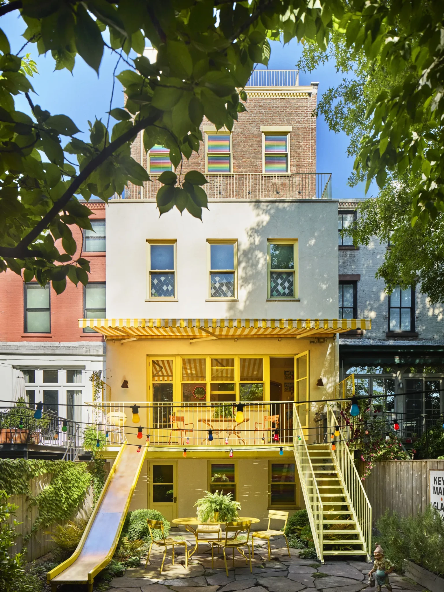 Στην καρδιά του Brooklyn, μια ιστορική κατοικία του 19ου αιώνα ξεχωρίζει για την εκκεντρική και παιχνιδιάρικη προσωπικότητά της. Το πρώτο στοιχείο που τραβάει το βλέμμα είναι η είσοδος. Ένα ειδικά σχεδιασμένο χερούλι από μπρούντζο, που θυμίζει τον Globey από την Pee-wee’s Playhouse, προαναγγέλλοντας την παράξενη και σουρεαλιστική ατμόσφαιρα που ακολουθεί μέσα στο σπίτι. Το πολύχρωμο πάνελ από παλιά καρουζέλ, οι διαφημιστικές πινακίδες και η παρουσία του Mr. ZIP, του καρτούν χαρακτήρα που δημιουργήθηκε τη δεκαετία του ’60 για να προωθήσει το ταχυδρομικό κώδικα, δίνουν τον τόνο ενός σπιτιού όπου η φαντασία και η δημιουργικότητα κυριαρχούν από την πρώτη στιγμή.
