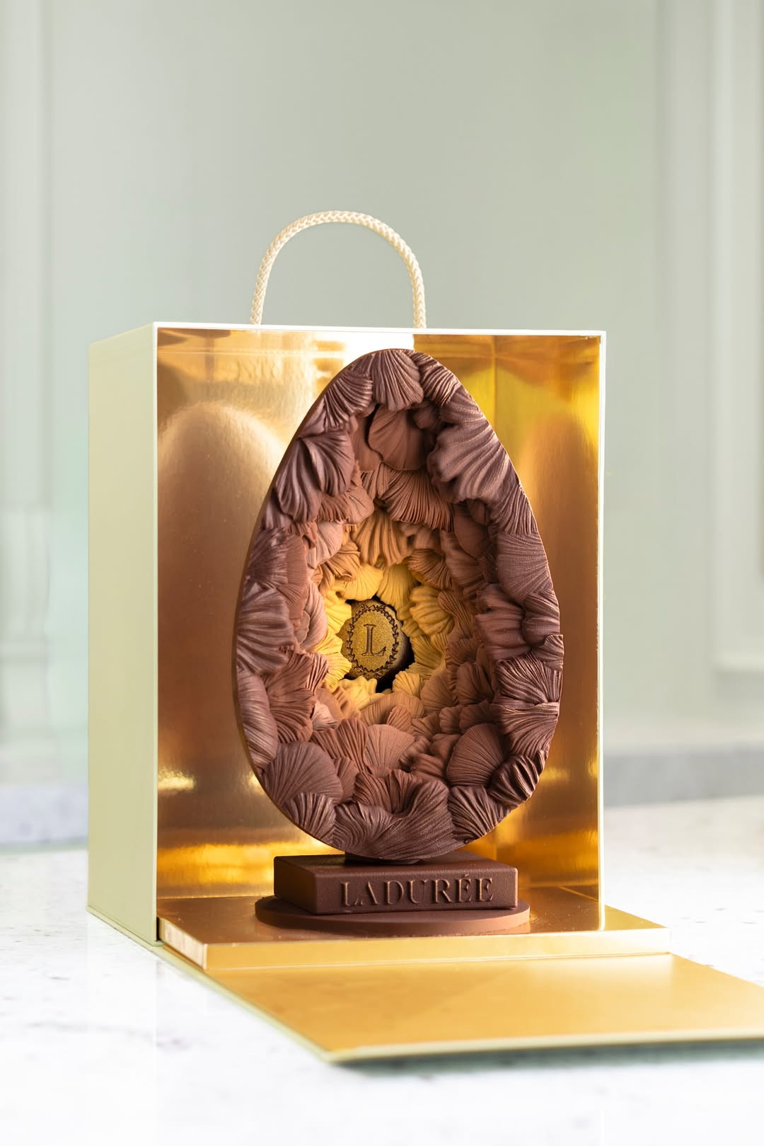 Το Ladurée στο Παρίσι μας προσκαλεί σε μια πραγματική πασχαλινή απόλαυση που συνδυάζει τέχνη και γεύση. Δημιουργημένο από τον Executive Pastry Chef Julien Alvarez, το επιδόρπιο αυτό αποτυπώνει όλη την τεχνογνωσία και τη φινέτσα του οίκου, προσφέροντας μια εκλεπτυσμένη εμπειρία για κάθε λάτρη της σοκολάτας. Η δημιουργία συνδυάζει μοναδικές υφές και γεύσεις: ένα αφράτο μπισκότο που λιώνει στο στόμα, πραλίνα φιστικιού με καραμέλα, ανάλαφρη σαντιγί Guanaja και μια κομψή, λεπτομερή διακόσμηση. Διατίθεται ήδη σε ατομική μερίδα, ενώ η μεγαλύτερη εκδοχή για έξι άτομα θα κυκλοφορήσει στις 4 Απριλίου.