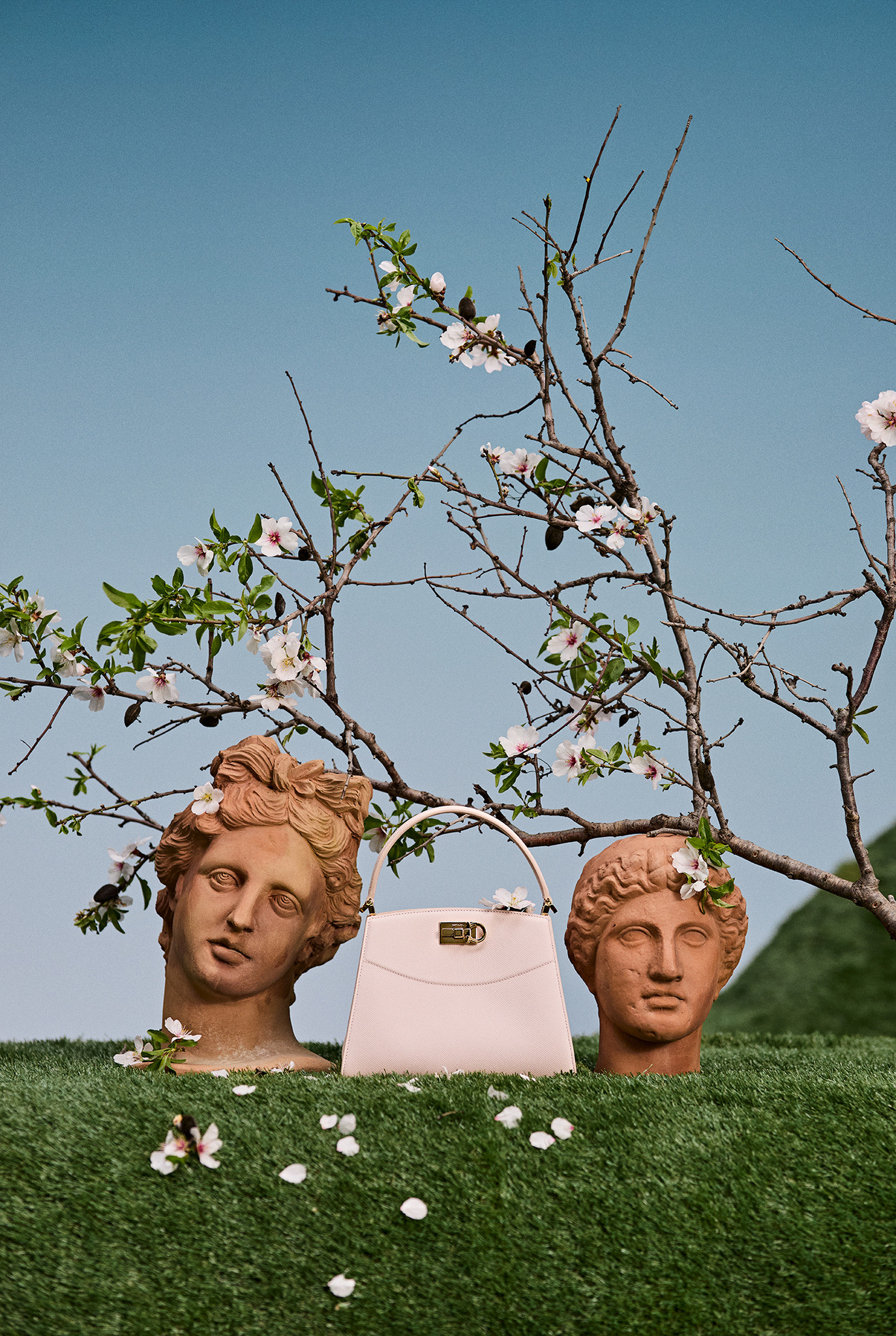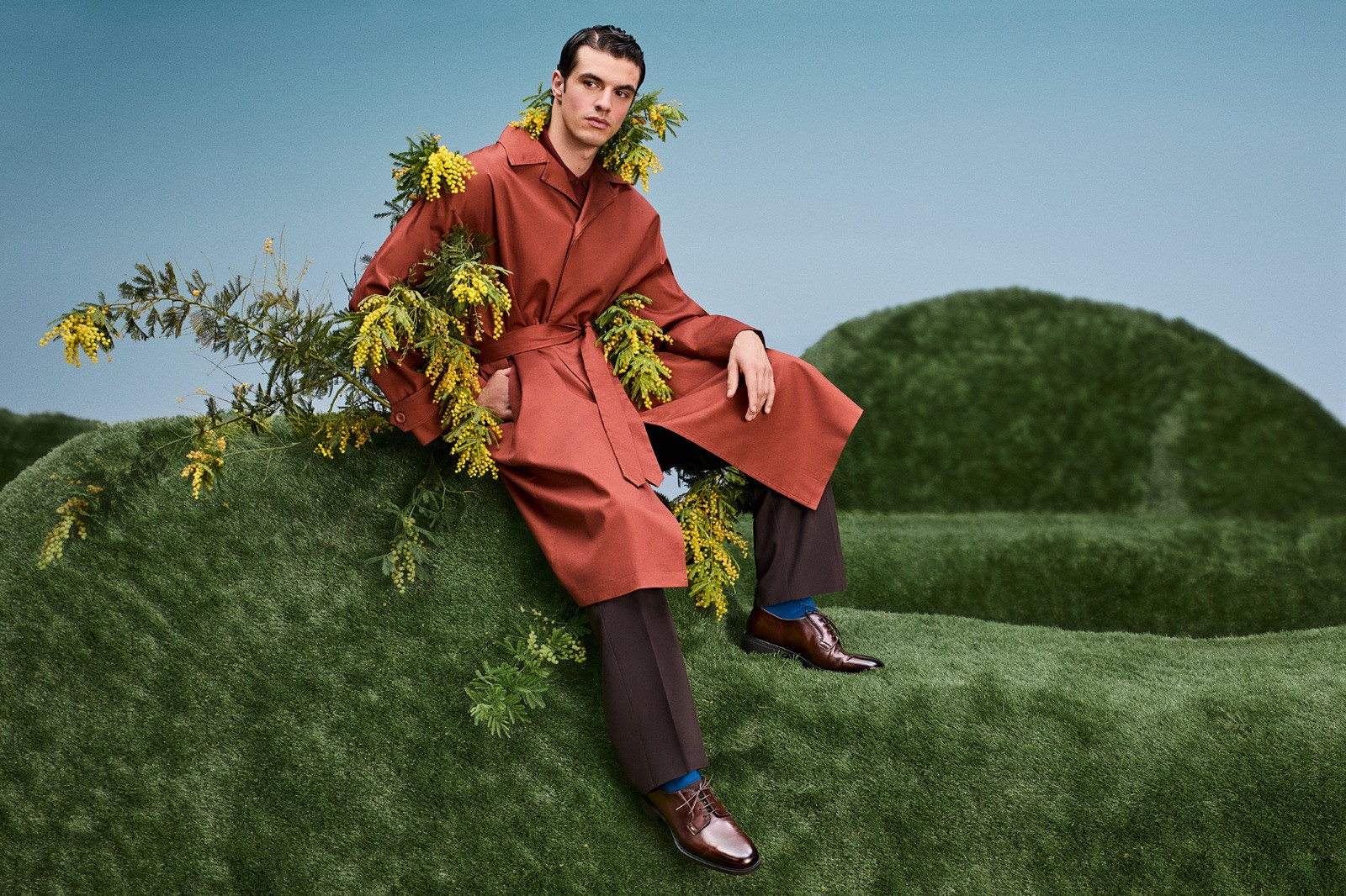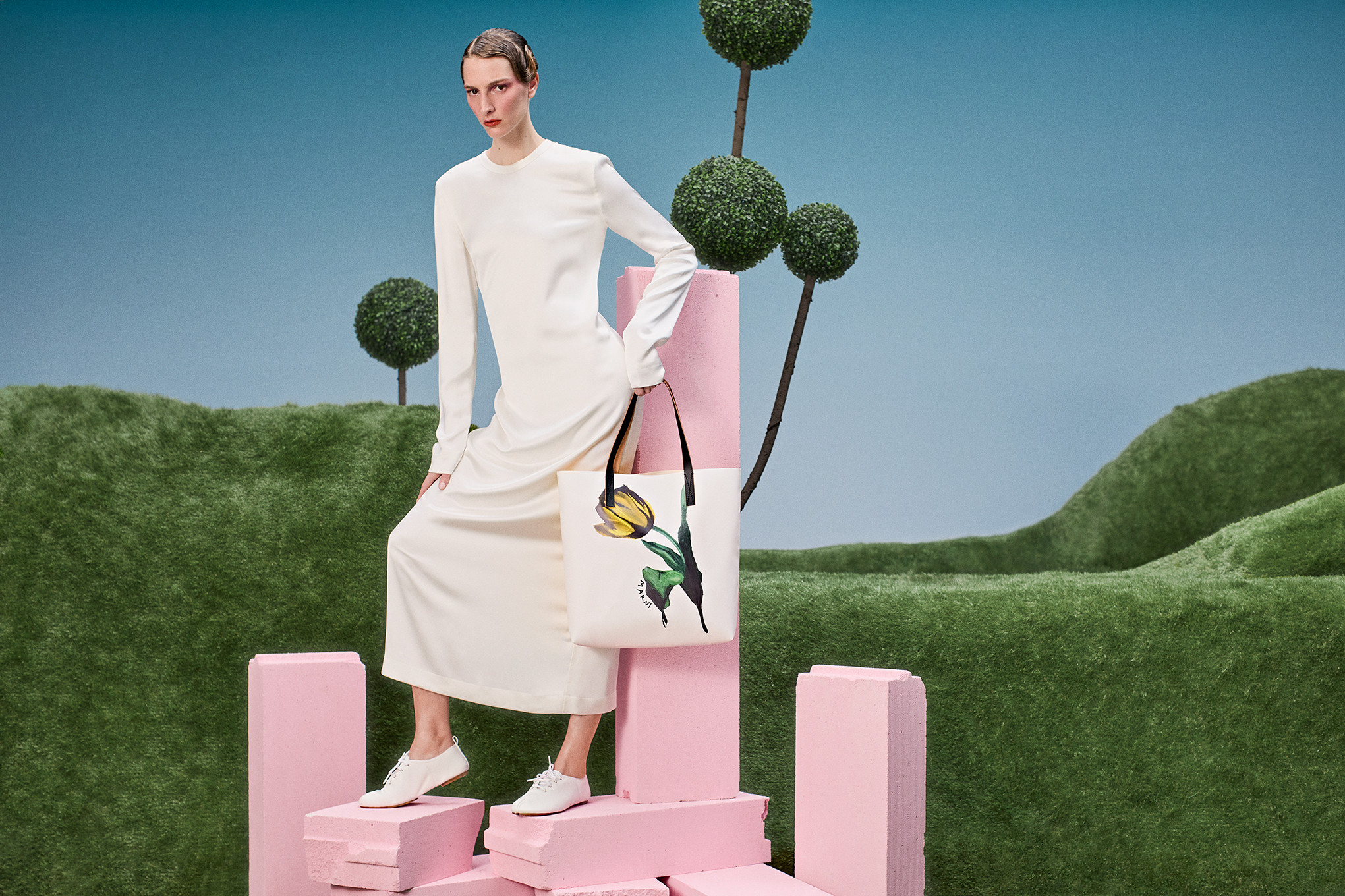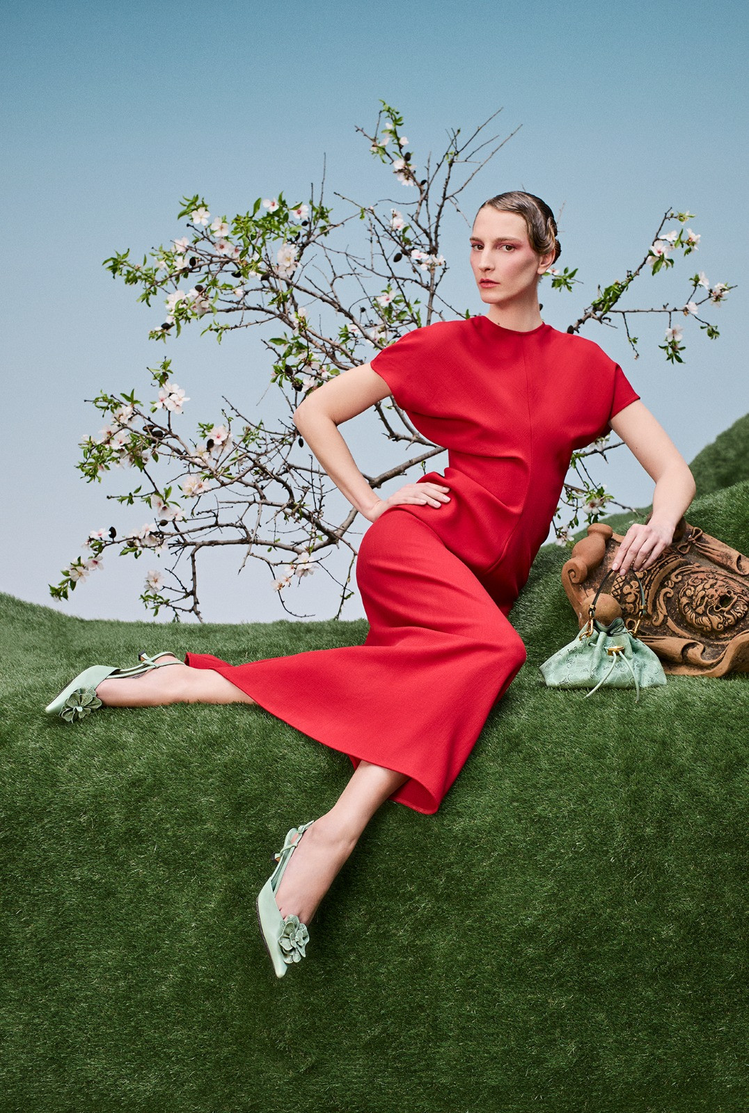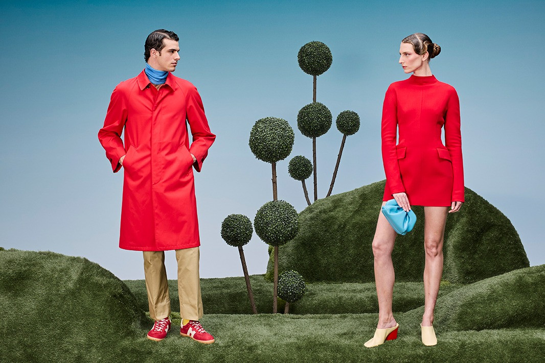 Το σκηνικό θυμίζει έναν ποιητικό, σχεδόν σουρεαλιστικό κήπο: κυματιστοί λόφοι από πράσινο, γεωμετρικά διαμορφωμένοι θάμνοι και γλυπτικές μορφές από τερακότα συνθέτουν ένα περιβάλλον που ισορροπεί ανάμεσα στη φύση και την αρχιτεκτονική. Μέσα σε αυτό το τοπίο, η συλλογή της KALOGIROU αναδεικνύεται σαν μέρος μιας καλλιτεχνικής εγκατάστασης, όπου κάθε item λειτουργεί ως στοιχείο μιας μεγαλύτερης αισθητικής αφήγησης.