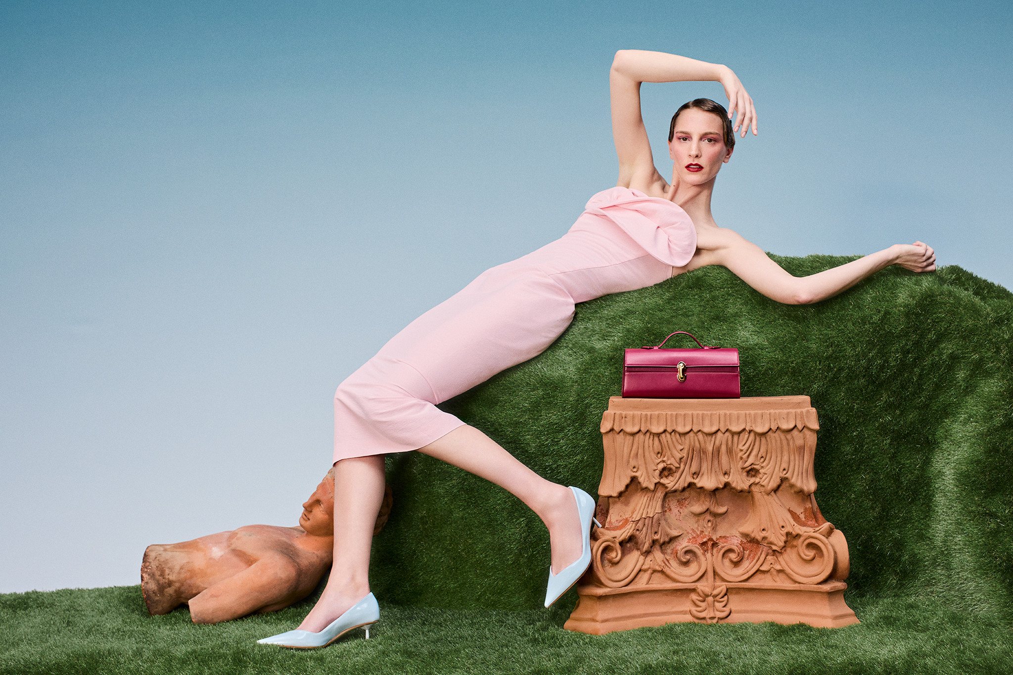 Η εικαστική ταυτότητα της καμπάνιας αντλεί έμπνευση από την κλασική τέχνη, ενώ παράλληλα εισάγει μια σύγχρονη, σχεδόν θεατρική διάσταση. Ροζ αρχιτεκτονικές δομές, γεωμετρικές φόρμες και γλυπτά δημιουργούν μια σκηνογραφία που θυμίζει υπαίθρια γκαλερί. Σε αυτό το σκηνικό, τα μοντέλα εμφανίζονται σαν σύγχρονες μυθικές μορφές - φιγούρες που μοιάζουν να ανήκουν σε έναν φανταστικό κόσμο, αλλά ταυτόχρονα αποπνέουν σύγχρονη κομψότητα και αυτοπεποίθηση. Οι κινήσεις τους είναι διακριτικές και σχεδόν χορογραφημένες, σαν να περιηγούνται σε έναν ιδιωτικό παράδεισο, όπου κάθε βήμα αποκαλύπτει ένα νέο στοιχείο της ιστορίας.