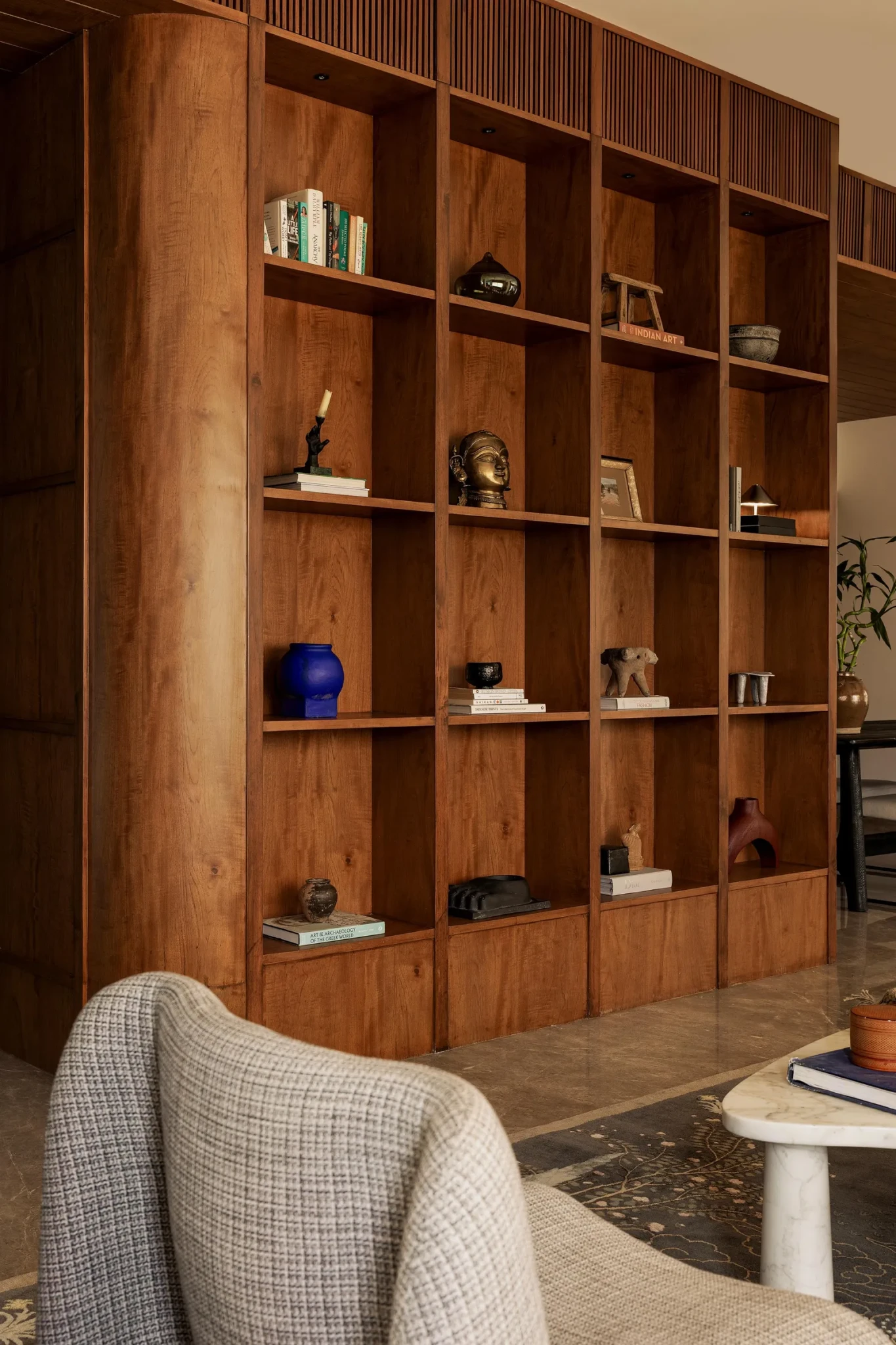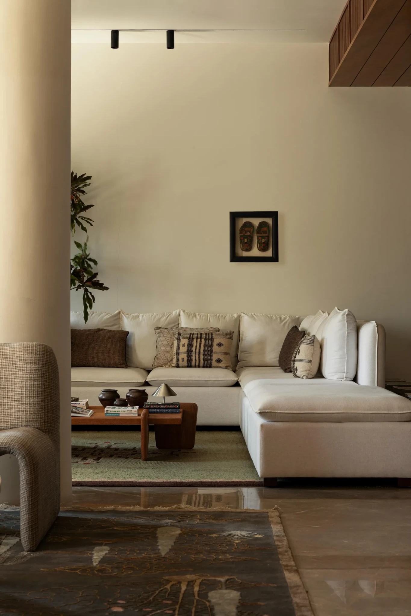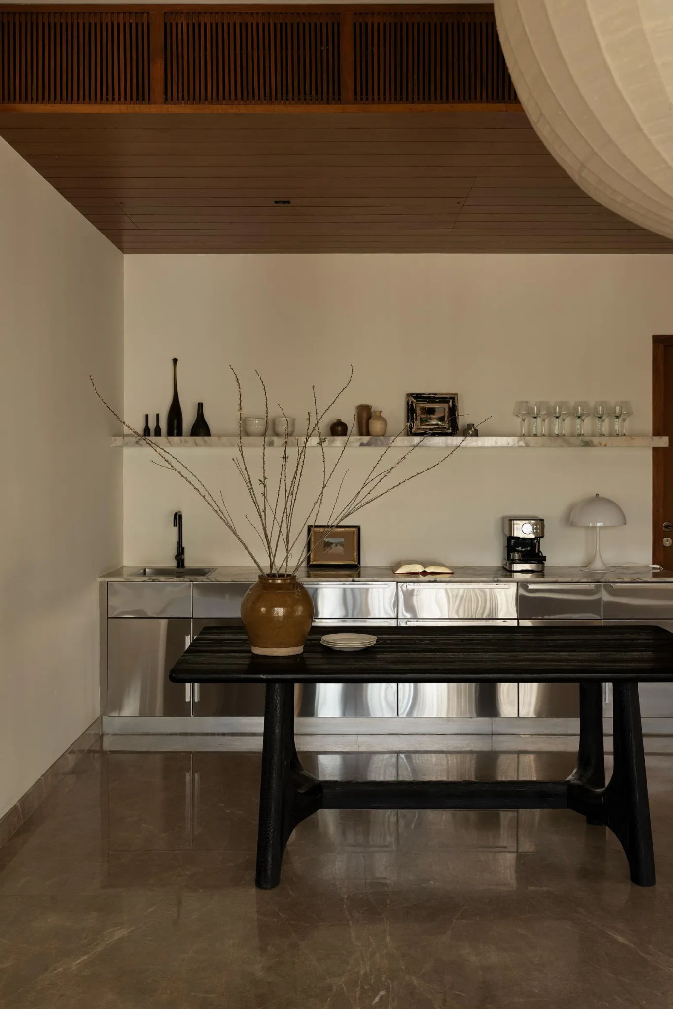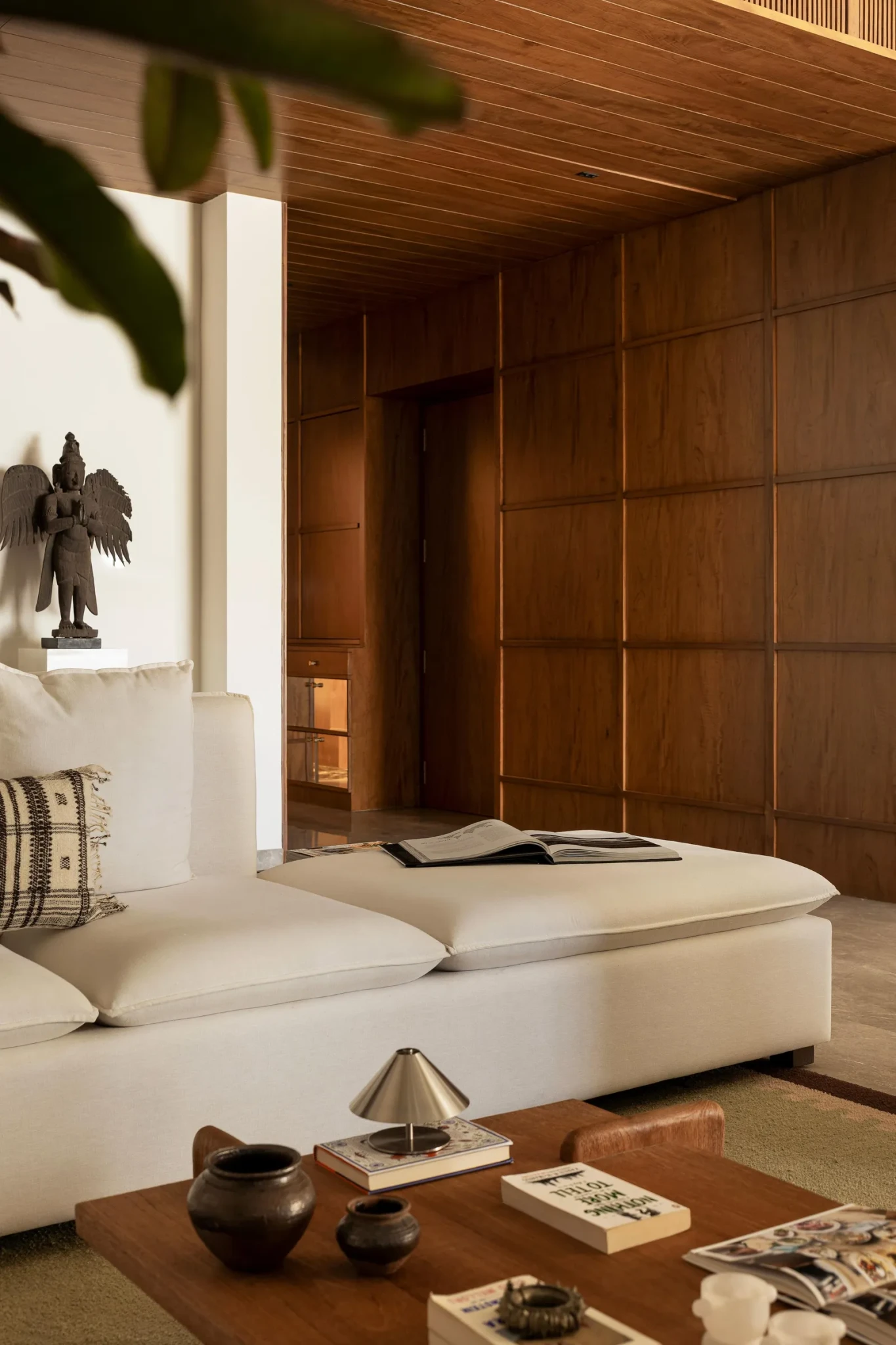 Σε ένα τέτοιο διαμέρισμα 3.500 τ.π., η αρχιτέκτονας και interior designer Gowri Adappa προχώρησε σε μια πλήρη αναθεώρηση του αρχικού σχεδίου. Το σπίτι, που φιλοξενεί ένα ζευγάρι και τα δύο τους σκυλιά, στερούνταν χαρακτήρα και coziness - αρετές στις οποίες κάθε κατοικία έχει δικαίωμα. Έτσι, απογυμνώθηκε μέχρι τον δομικό του πυρήνα και αναδομήθηκε με νέα λογική: διαφάνεια, φωτεινότητα, υλικό βάθος. Η διάταξη απέκτησε ρευστότητα, οι ζώνες επικοινωνούν μεταξύ τους μέσω αθέατων ορίων, και ο μοντερνιστικός παλμός συνυπάρχει με διακριτικές ινδικές αναφορές και mid-century εντάσεις.