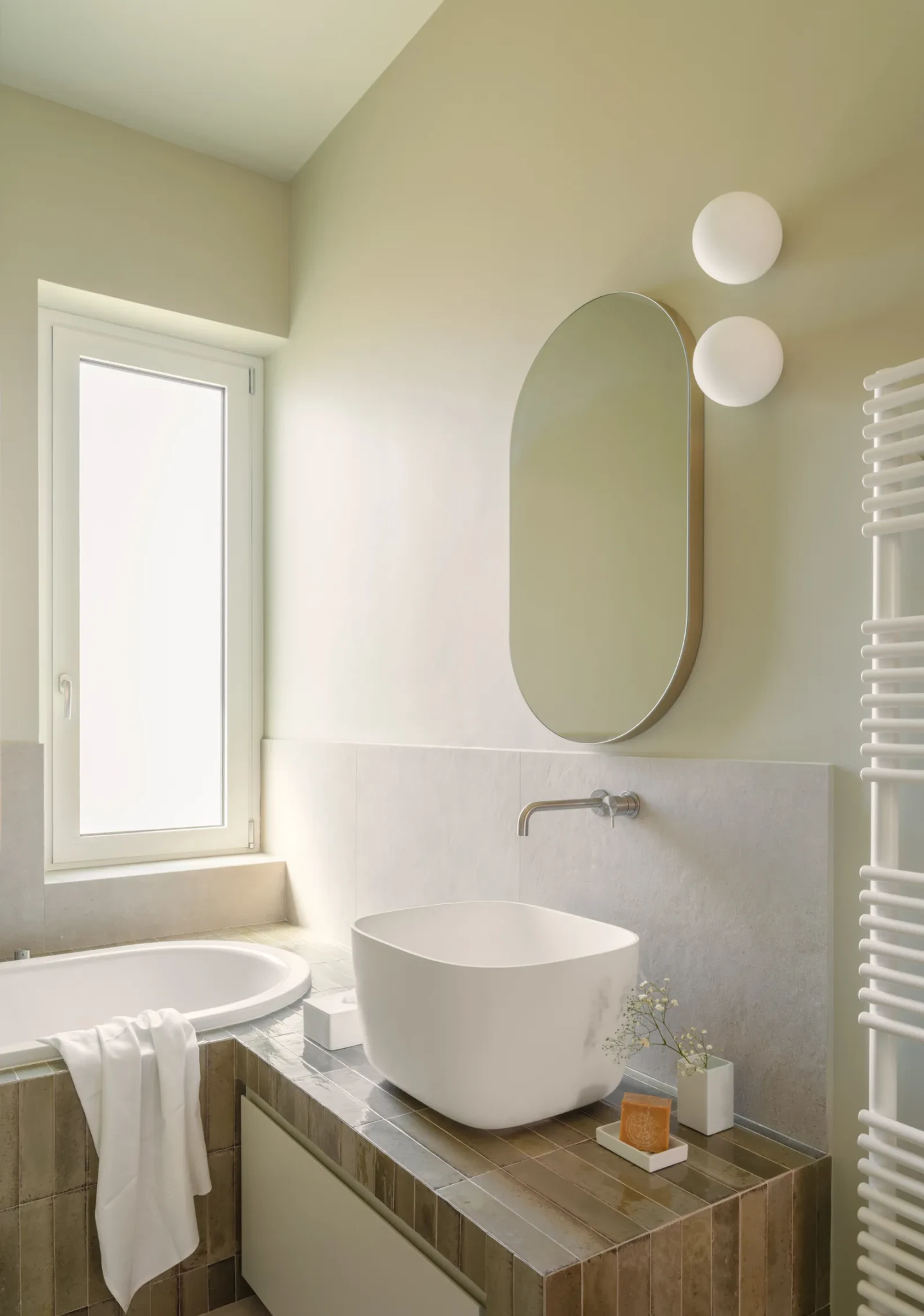 Στην αντίθετη πλευρά του σπιτιού, τα υπνοδωμάτια υιοθετούν μια πιο ήπια αισθητική. Οι παστέλ αποχρώσεις, τα φυσικά υλικά και το παρκέ σε σχέδιο ψαροκόκαλο δημιουργούν ένα περιβάλλον που ευνοεί την ηρεμία. Η μετάβαση από τους ανοιχτούς, κοινωνικούς χώρους στους πιο ιδιωτικούς γίνεται σχεδόν ανεπαίσθητα, διατηρώντας τη συνοχή της κατοικίας.