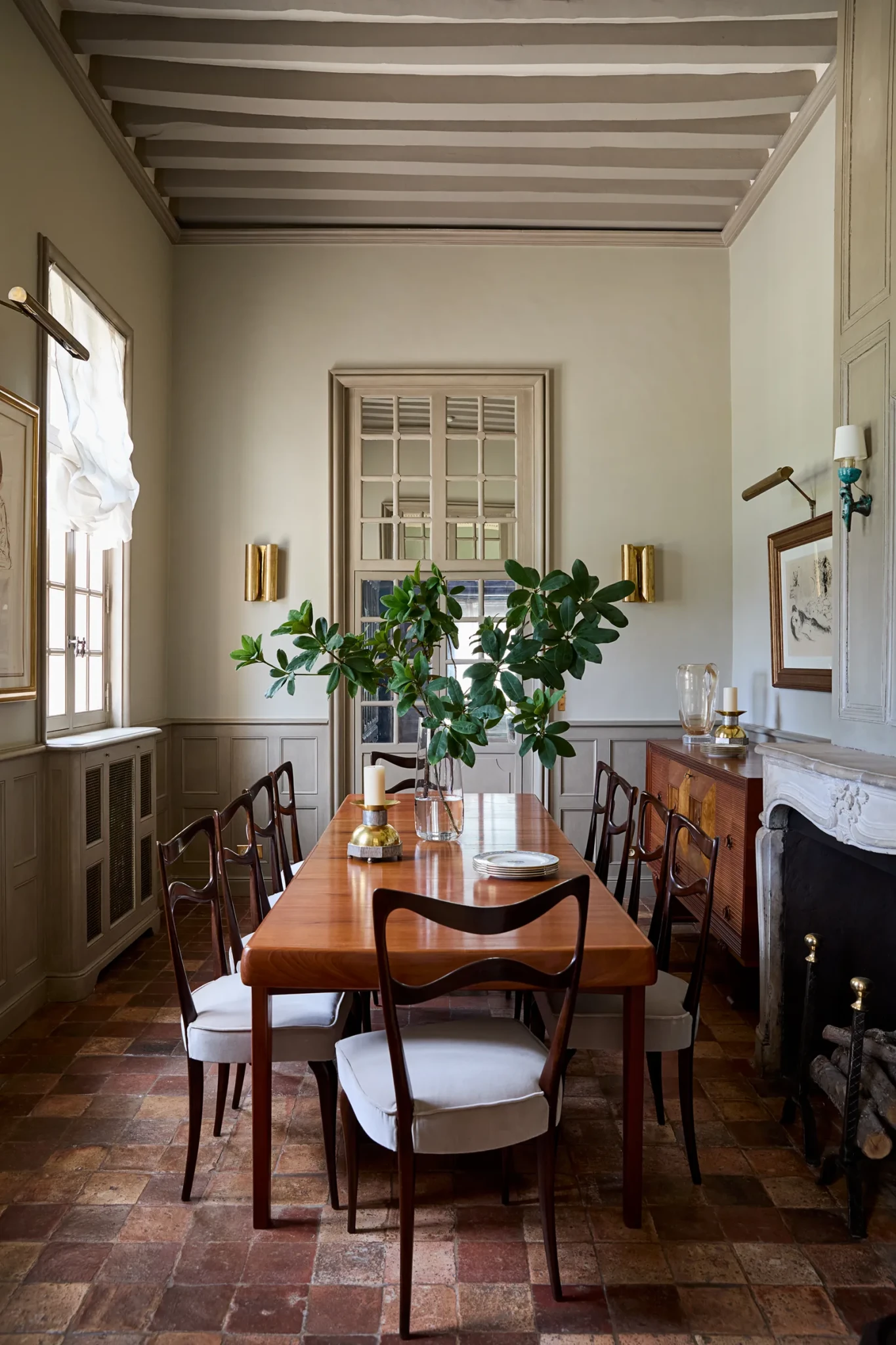 Στην τραπεζαρία, τα τραπέζια και οι καρέκλες αντλούν επιρροές από το σκανδιναβικό και το ιταλικό design, ενώ οι φωτιστικές επιλογές προσθέτουν μια διακριτική αίσθηση θεατρικότητας στο δωμάτιο. Η αντίθεση ανάμεσα στις καθαρές γραμμές των επίπλων και τη διακοσμητική αρχιτεκτονική του χώρου δημιουργεί μια ιδιαίτερη ισορροπία.