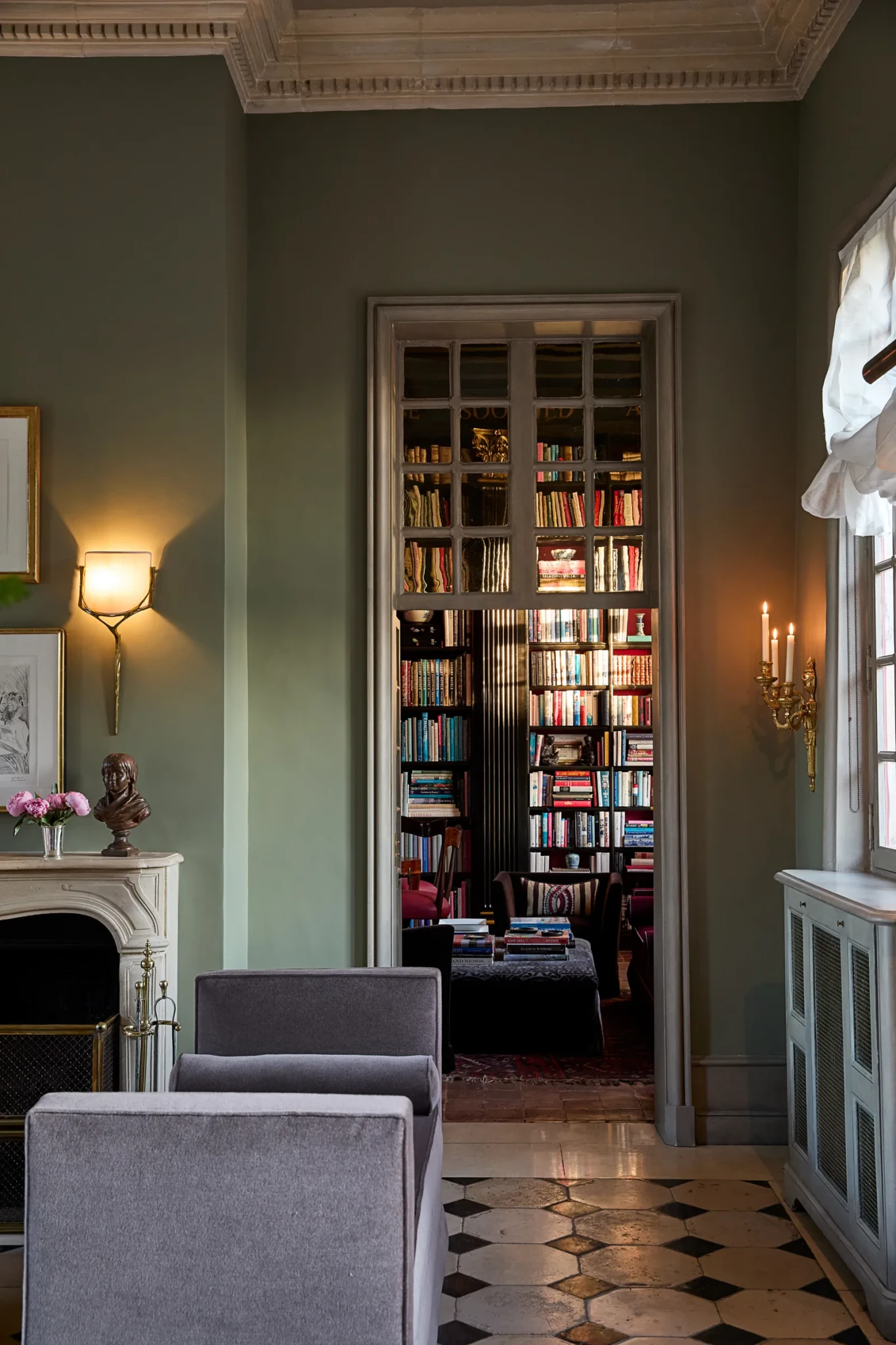 Αντίστοιχα, στη βιβλιοθήκη, τα μοτίβα στο δάπεδο και οι τολμηρές υφασμάτινες επιλογές δημιουργούν έναν χώρο με έντονη προσωπικότητα, που μοιάζει να συνδυάζει την κλασική ατμόσφαιρα ενός château με μια καλλιτεχνική διάθεση.