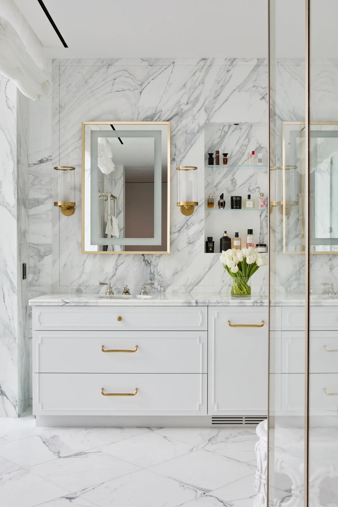 Τα ντουλάπια και τα ράφια της κουζίνας είναι γυάλινα και διακρίνονται από κρυφό φωτισμό, ενώ συμπληρώνονται με στοιχεία από λευκό μάρμαρο και ορείχαλκο.