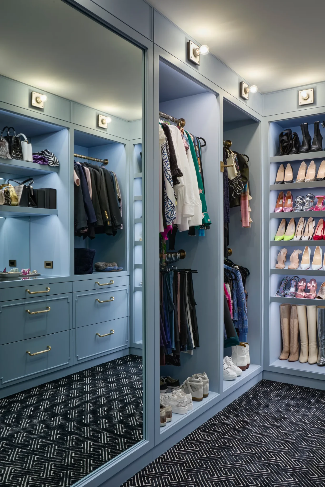 Ξεκινώντας από την είσοδο που δημιουργήθηκε με σκοπό την αίσθηση της δραματικότητας: ένας διάδρομος επενδυμένος με κομψά πάνελ από την Féau Boiseries στο Παρίσι, όπου κρύβεται μια πόρτα που οδηγεί στην τουαλέτα, της οποίας οι τοίχοι είναι επενδυμένοι με ταπετσαρία Gucci. Κρεμαστά φανάρια Jamb, ένα γραφικό ασπρόμαυρο μαρμάρινο δάπεδο και μια ριγέ ταπετσαρία από την Iksel οδηγούν στο υπόλοιπο σπίτι.