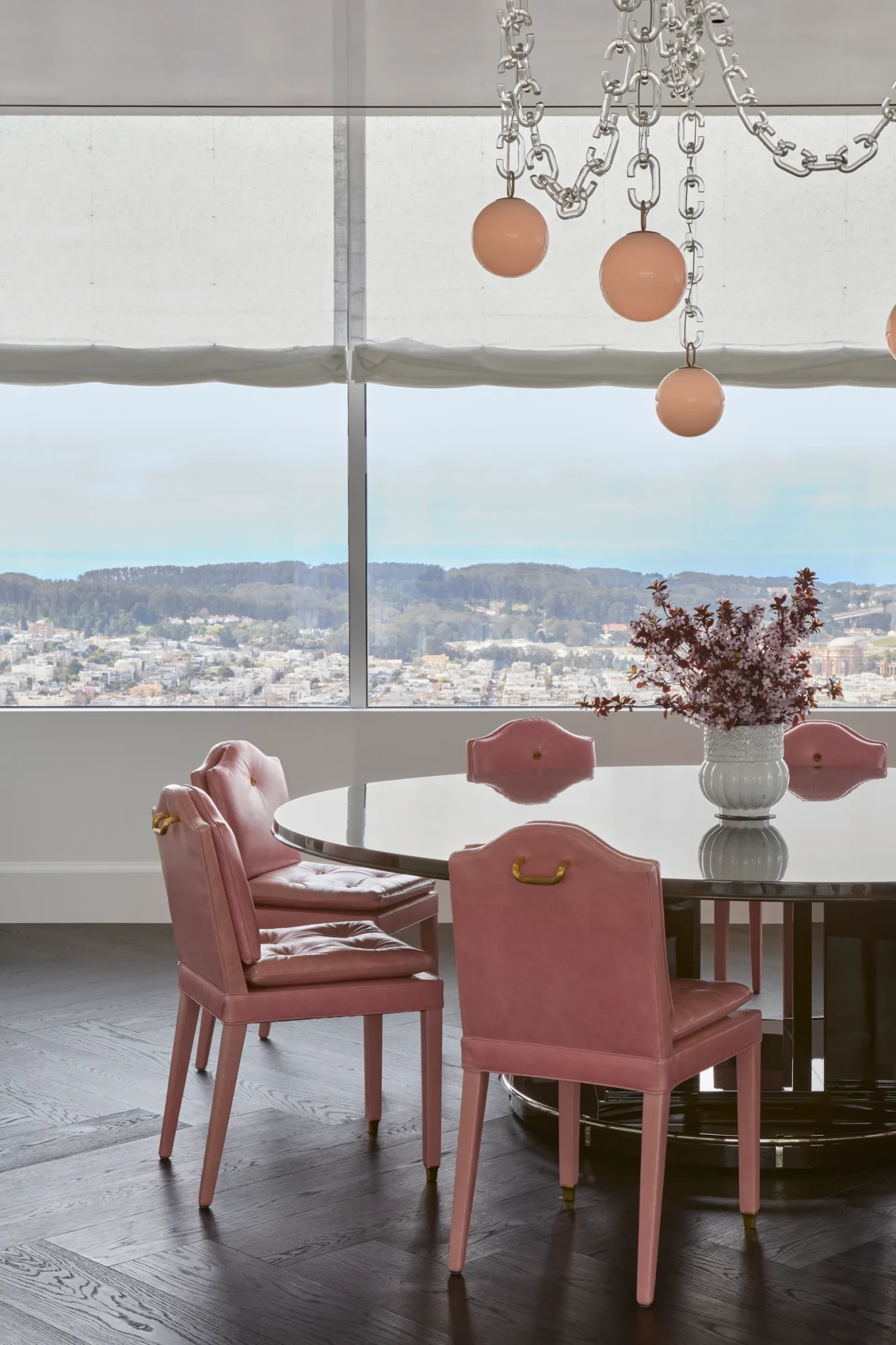 Ένα στρογγυλό τραπέζι κοσμεί την τραπεζαρία με ροζ δερμάτινες καρέκλες επίσης από την «The Warborough Collection». ‘Ενα ζευγάρι βελούδινες πολυθρόνες που βρίσκονται απέναντι από το πιάνο με ουρά που είναι ένα από τα κύρια σημεία εστίασης του χώρου, σύμφωνα με τα ζητούμενα του ιδιοκτήτη. Οι πολυέλαιοι από το Trueing Studio της Νέας Υόρκης στην τραπεζαρία και το καθιστικό και τα φωτιστικά που αναδεικνύουν τα έργα τέχνης του πελάτη συμπληρώνουν και ζεσταίνουν το χώρο κατά τις βραδινές ώρες. Οι γυαλιστερές οροφές συμβάλλουν στην αντανάκλαση του φωτός και προσθέτουν βάθος στο δωμάτιο.
