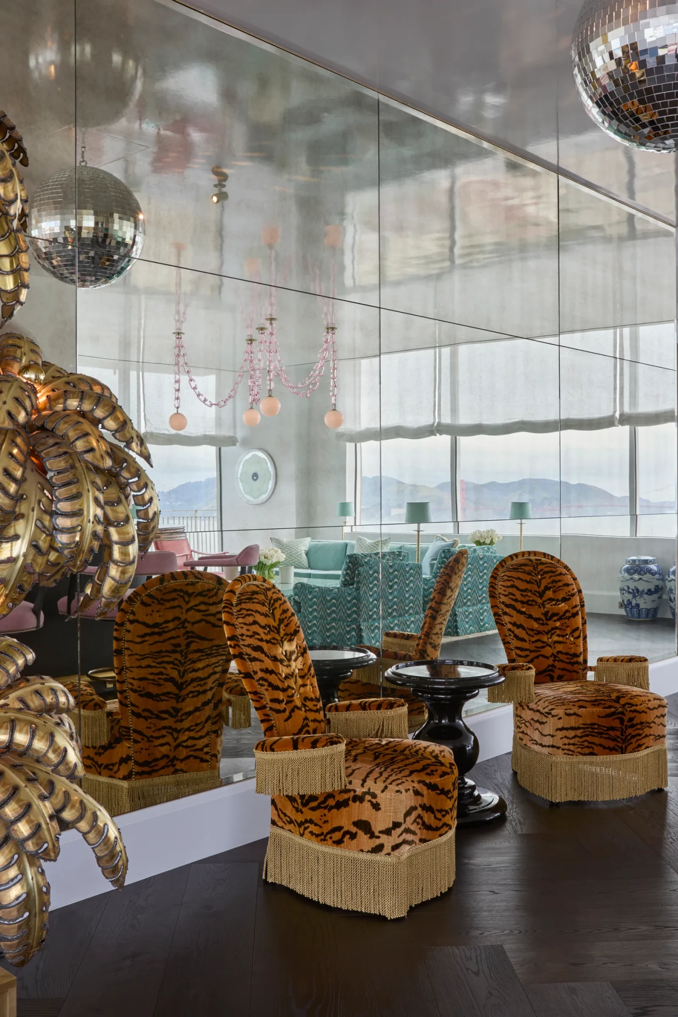 Το σαλόνι υποδέχεται τους καλεσμένους του με ένα εντυπωσιακό μπαρ από ροζ ονυχίτη με κρυφό φωτισμό και μια disco ball. Μπροστά του στέκονται ροζ βελούδινα σκαμπό και δύο πολυθρόνες από το Hotel Costes στο Παρίσι, με βελούδινες τιγρέ ταπετσαρίες δημιουργώντας μια υπέροχη αντίθεση. Η χρωματική παλέτα του υπόλοιπου καθιστικού είναι εμπνευσμένη από τη θάλασσα του San Francisco, ενώ τον χώρο συμπληρώνουν ιδιαίτερα αντικείμενα όπως ένας βελούδινος καναπές, πολυθρόνες από τη συλλογή «The Warborough Collection» κι ένα χαλί Anemone σε ειδικό χρώμα από τη "The Rug Company". Σε ένα επιπλέον και πιο casual καθιστικό ο καναπές είναι Sedilla.