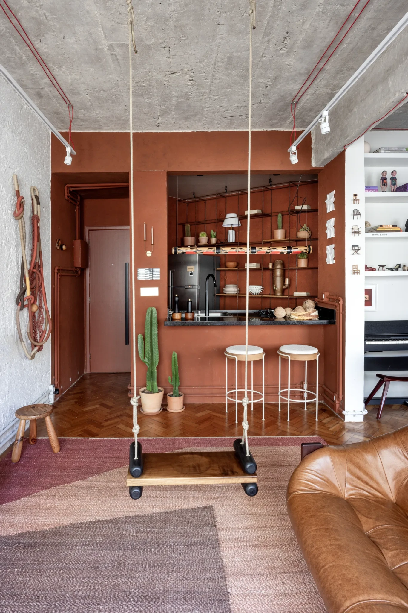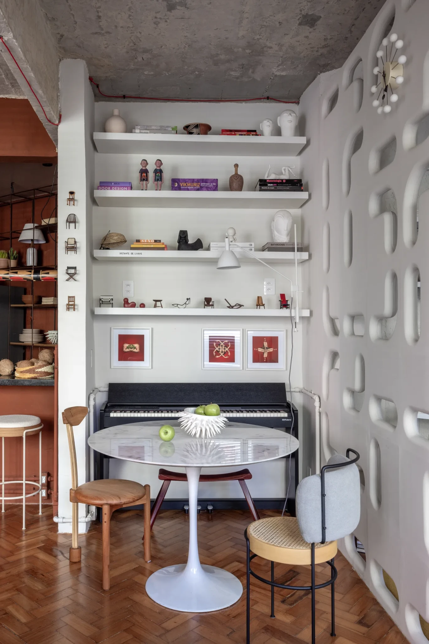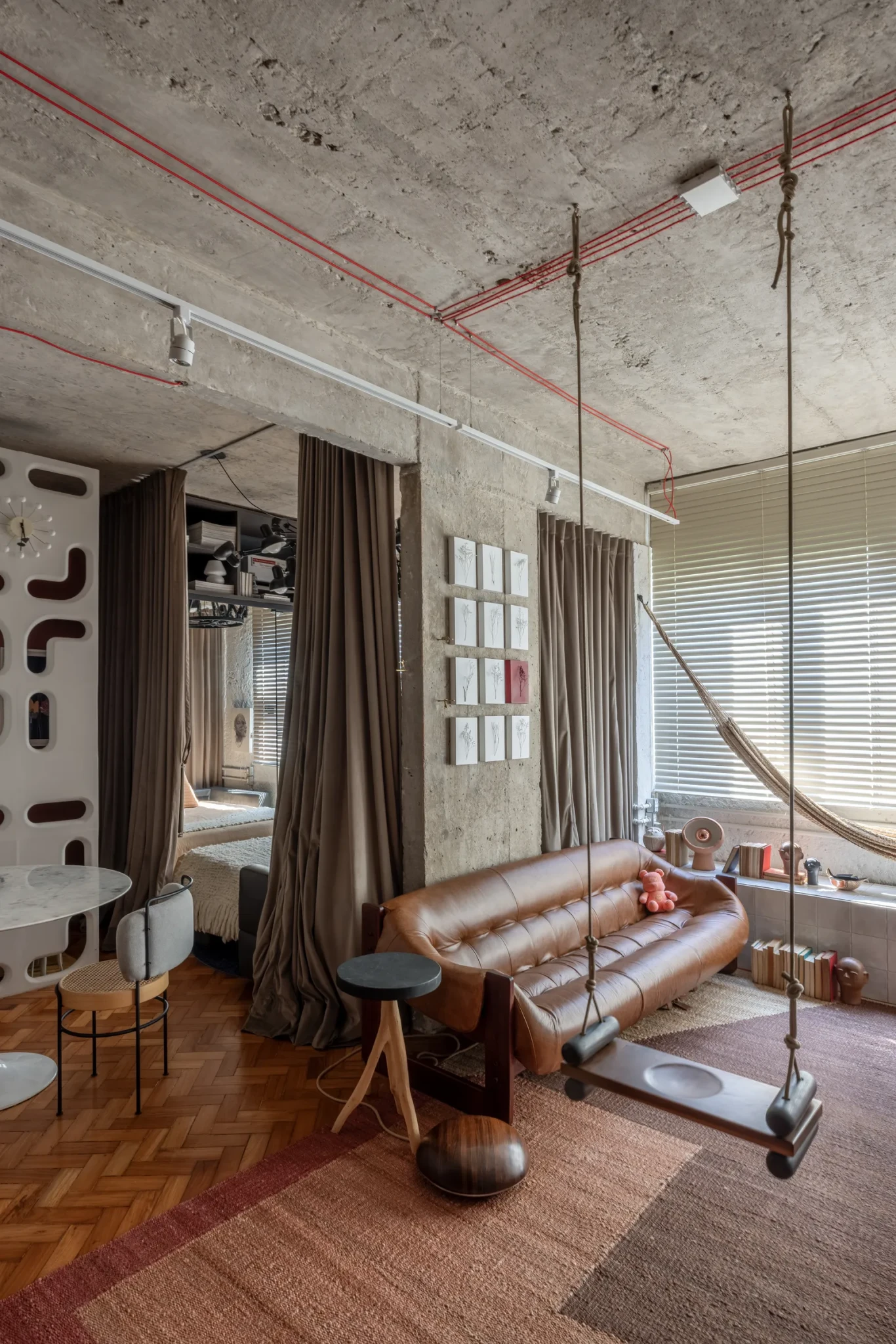 Η αναφορά στο cobogó, μαζί με τα κεραμικά πλακάκια, το εμφανές σκυρόδεμα και το φυσικό ξύλο, επανασυνδέει το διαμέρισμα με τον πυρήνα της λατινοαμερικανικής αρχιτεκτονικής, τη σχέση ανάμεσα στην υλικότητα, το περιβάλλον και τον άνθρωπο. Το αποτέλεσμα είναι ένας χώρος που δεν ακολουθεί τάσεις, αλλά διατυπώνει μια αυθεντική πρόταση κατοίκησης με ρίζες, ιστορία και χαρακτήρα.