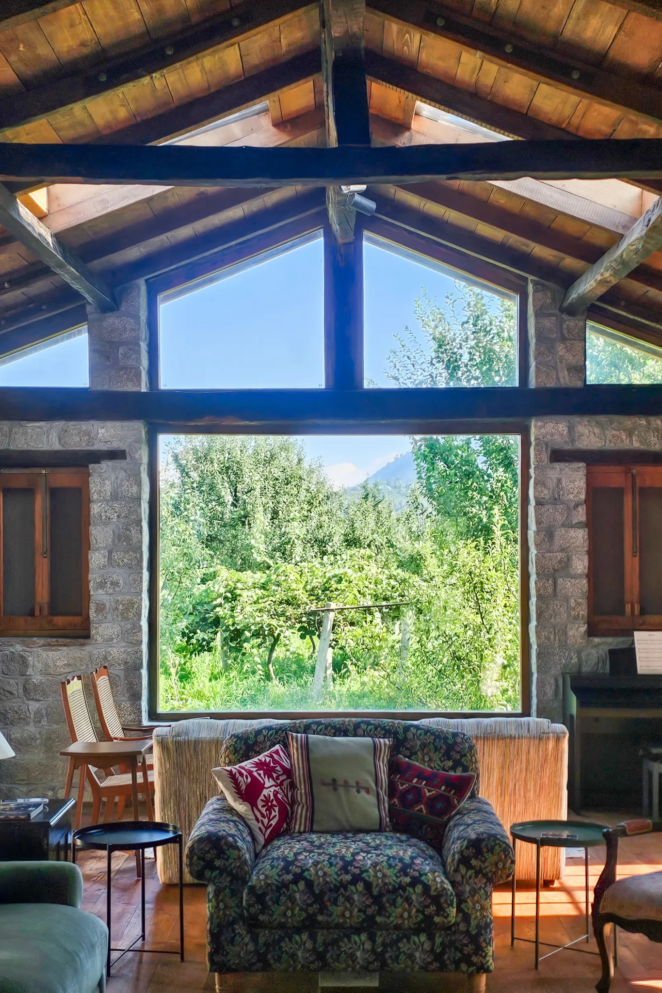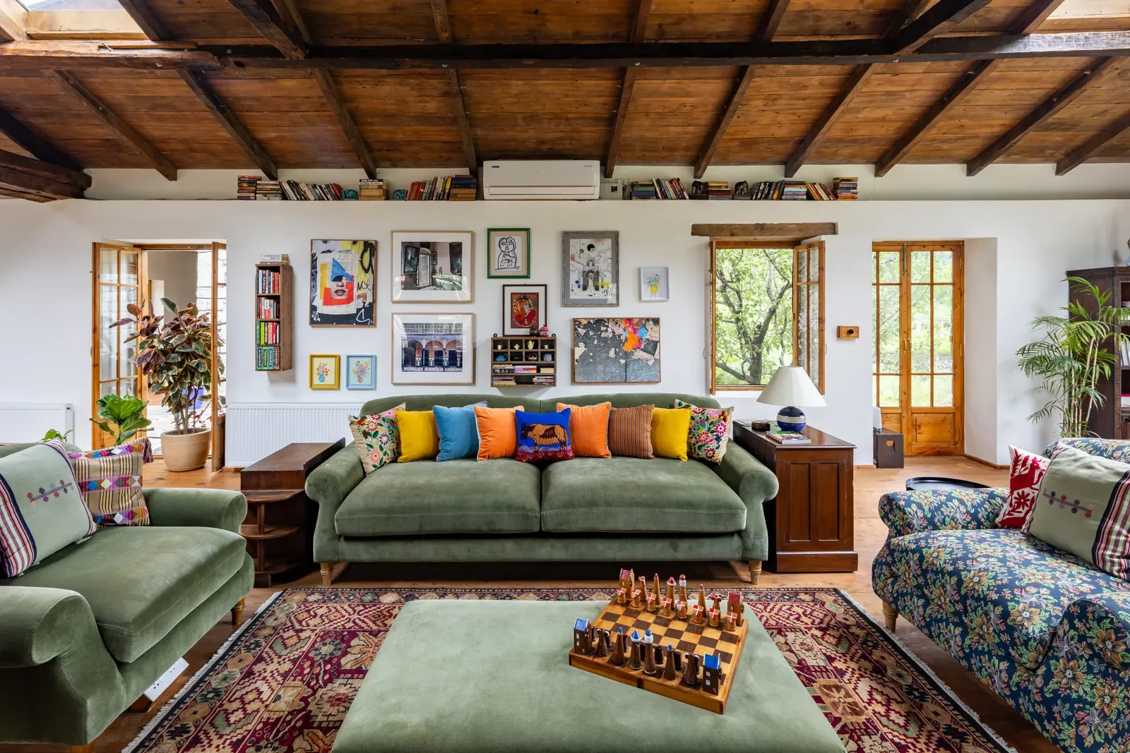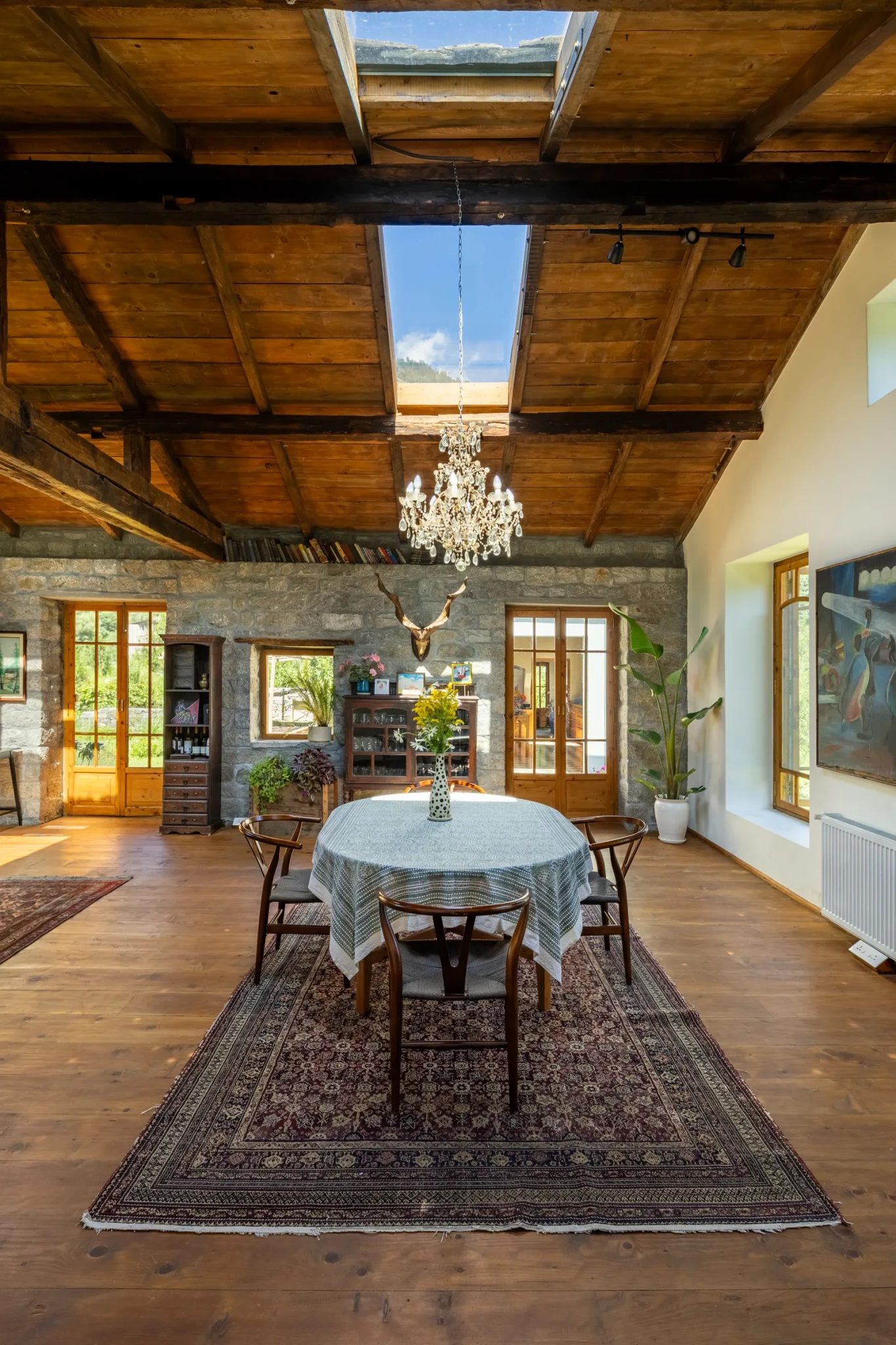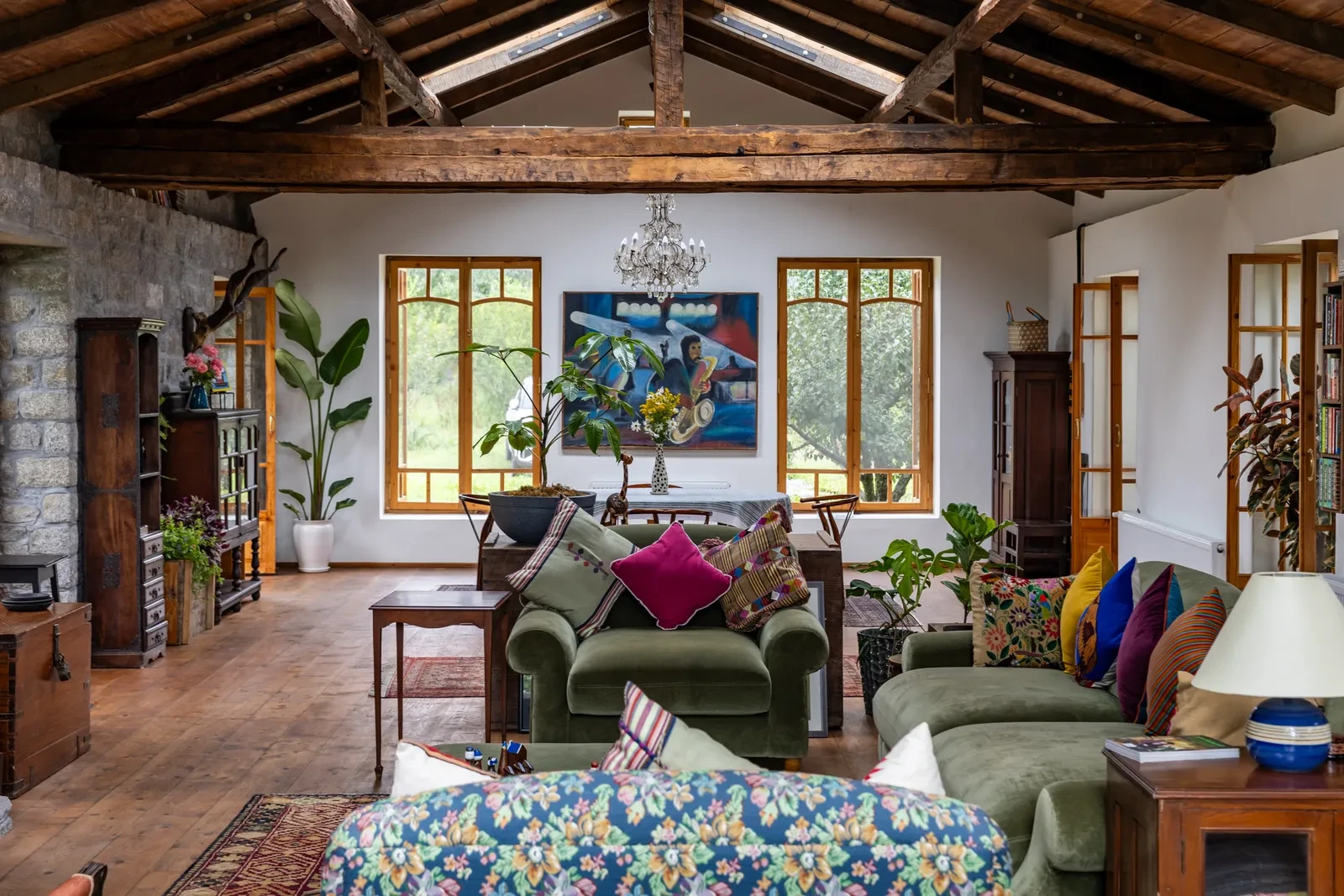Το κεντρικό καθιστικό και η τραπεζαρία αποτελούν έναν μεγάλο, ενιαίο, ηλιόλουστο χώρο που σχεδιάστηκε για με σκοπό την επικοινωνία και την οικειότητα. Στο σαλόνι κυριαρχούν οι εκκεντρικοί πράσινοι καναπέδες και το κεντρικό πουφ, τα οποία είναι φτιαγμένα στα μέτρα της οικογένειας από την Καλκούτα, με ειδικό ύφασμα επιλεγμένο από το Δελχί, ενώ τα μαξιλάρια προέρχονται από το Μεξικό. Το τζάκι είναι εμπνευσμένο από τις παραδοσιακές αγγλικές εστίες και γίνεται το επίκεντρο των βραδιών, ενώ τα μεγάλα παράθυρα που αντικρίζουν την κοιλάδα αγκαλιάζουν το φως και τον αέρα, ενισχύοντας την απευθείας σχέση του χώρου με την φύση.