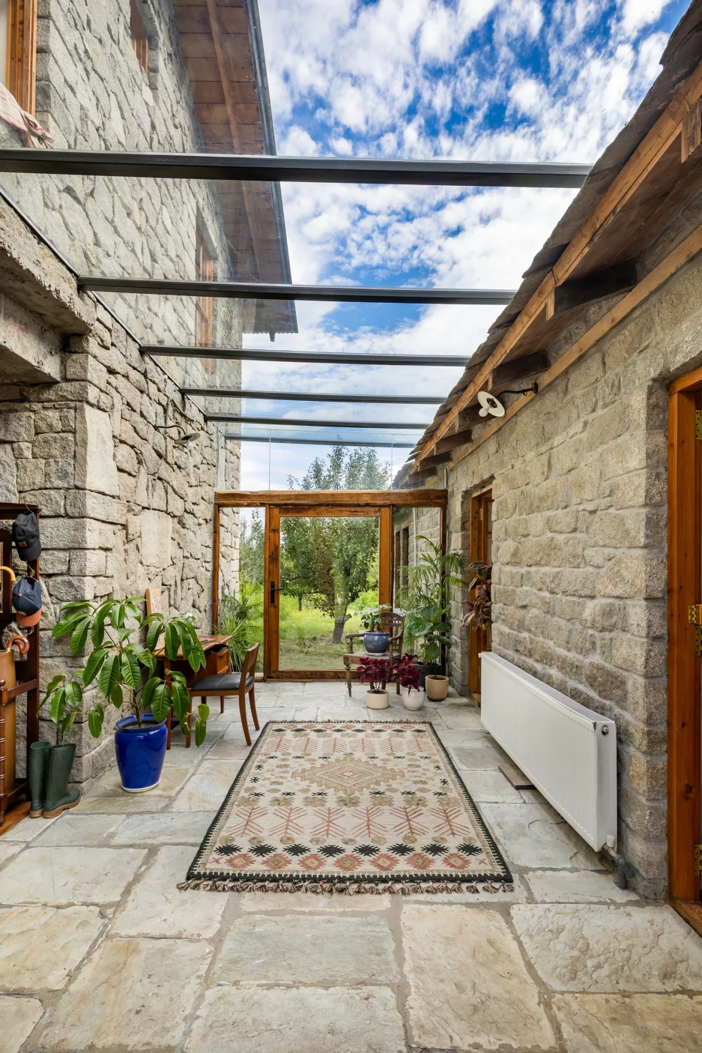 Στην είσοδο του σπιτιού διακρίνεται μια φιλόξενη είσοδος, η οποία κοσμείται με ένα παλιό χαλί που βρέθηκε στην τοπική αγορά, καθώς επίσης και φυτά σε γλάστρες από ντόπιους τεχνίτες, στοιχεία που δίνουν αμέσως έναν αέρα οικειότητας και χαρακτήρα στο χώρο.