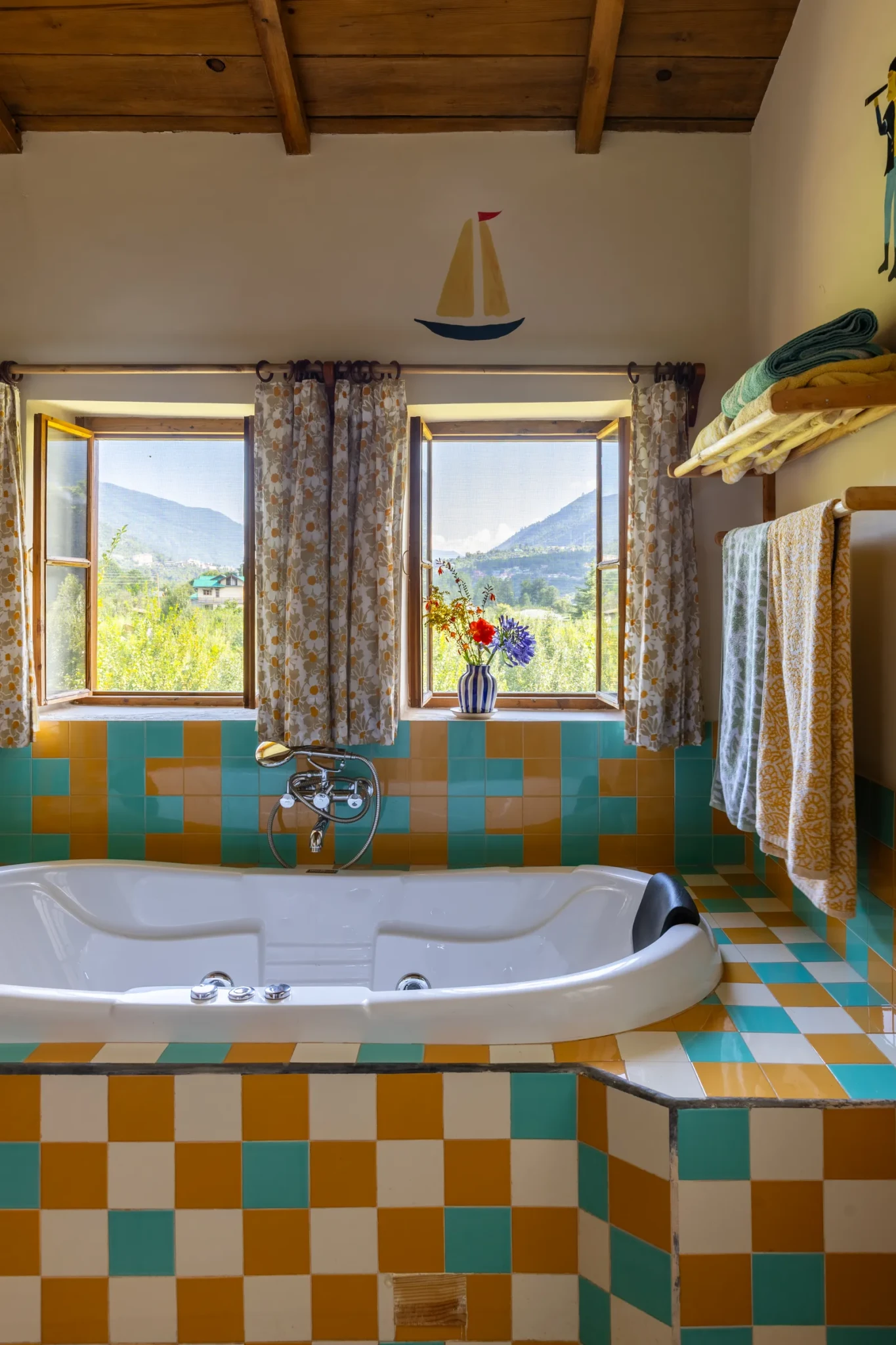 Το μπάνιο του δωματίου διαθέτει μια πολύχρωμη μπανιέρα, εμπνευσμένη από ένα ζωγραφιστό ύφασμα. Τα ασύμμετρα πλακάκια που την κοσμούν επιλέχθηκαν με αγάπη και προσοχή στις λεπτομέρειες.