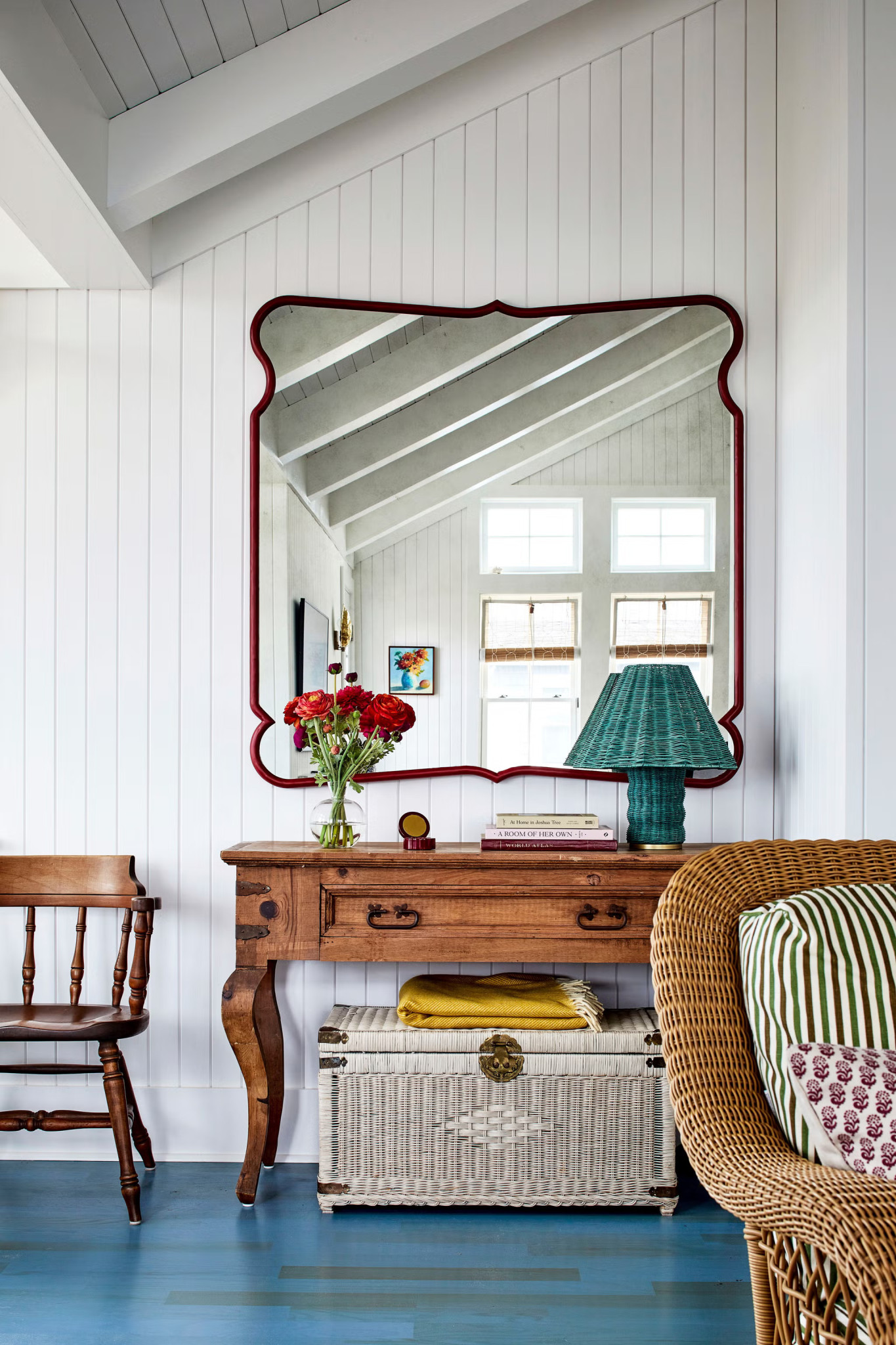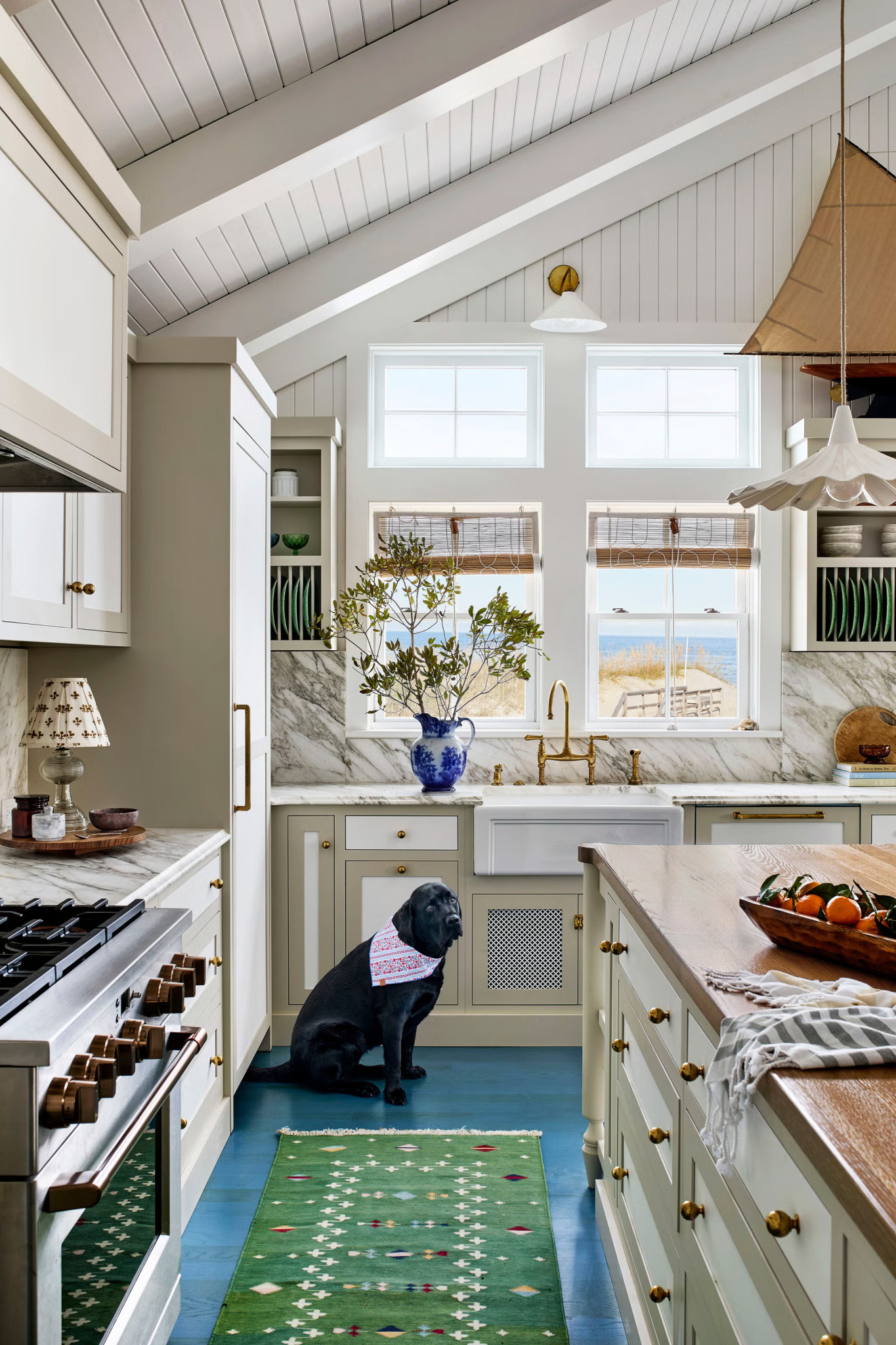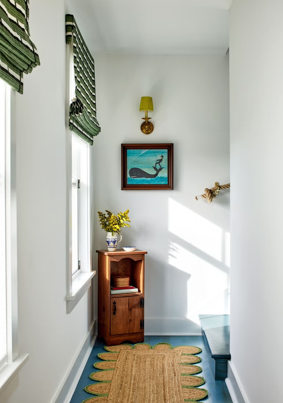 Κεντρικό ρόλο στη συνολική αισθητική παίζουν τα υλικά που επιλέχθηκαν για να αποκτούν χαρακτήρα όσο περνά ο καιρός. Τα ξύλινα πατώματα είναι βαμμένα σε μια απαλή μπλε απόχρωση, μια επιλογή που δεν είναι μόνο αισθητική αλλά και πρακτική, καθώς αντέχει στη φθορά της άμμου και της υγρασίας. Οι επενδύσεις στους τοίχους ενισχύουν τη ναυτική αναφορά, ενώ τα μεταλλικά στοιχεία από ακατέργαστο ορείχαλκο σχεδιάστηκαν ώστε να πατινάρουν φυσικά. Το σπίτι δεν προσπαθεί να διατηρήσει την τελειότητα, αλλά να εξελίσσεται μέσα από τη χρήση.
