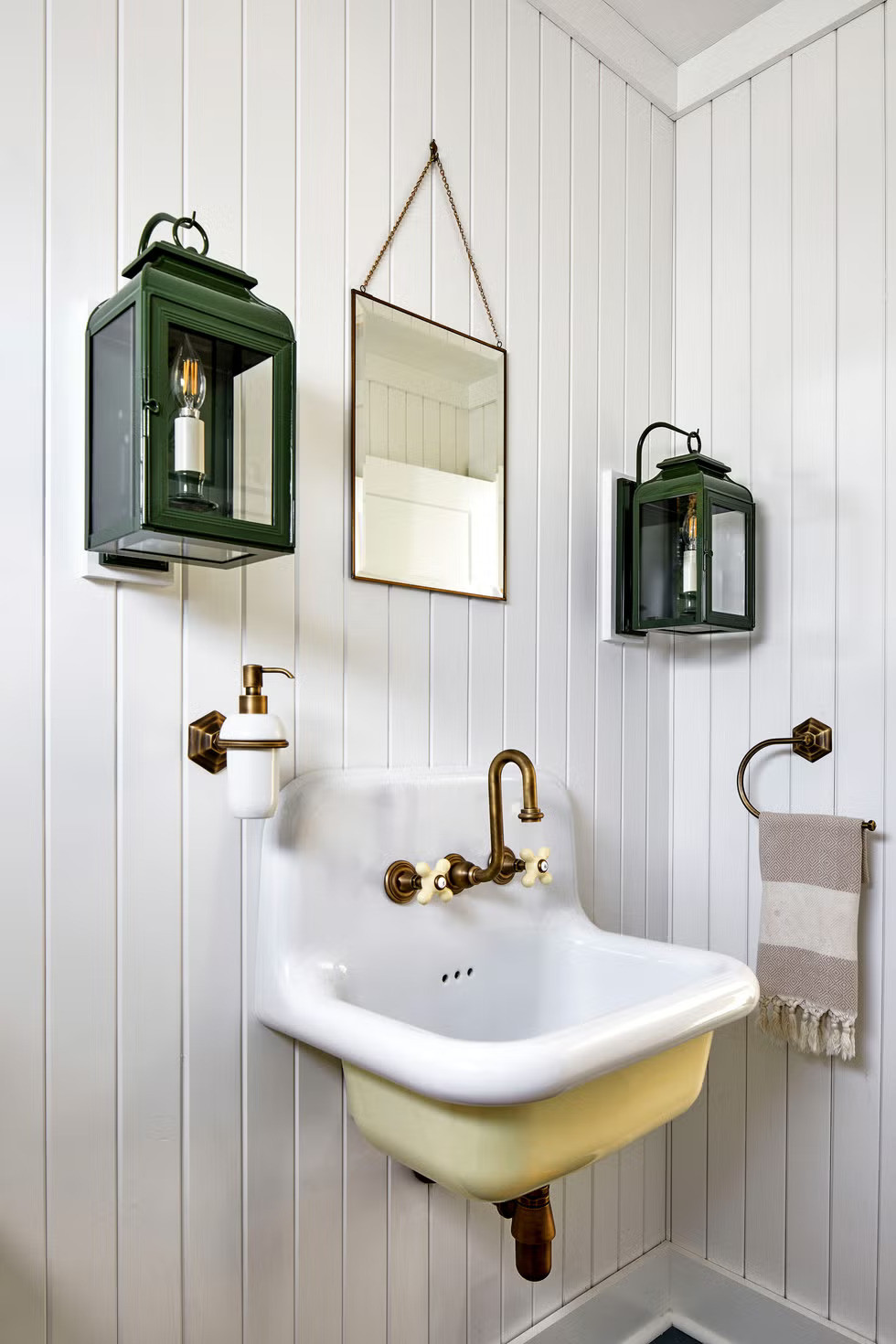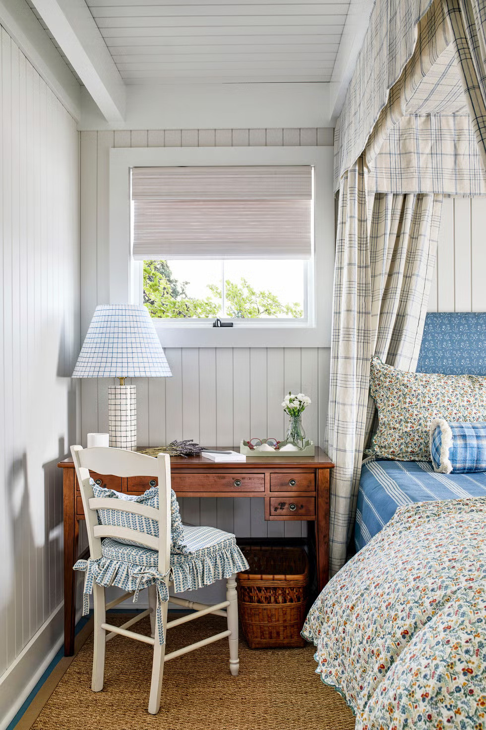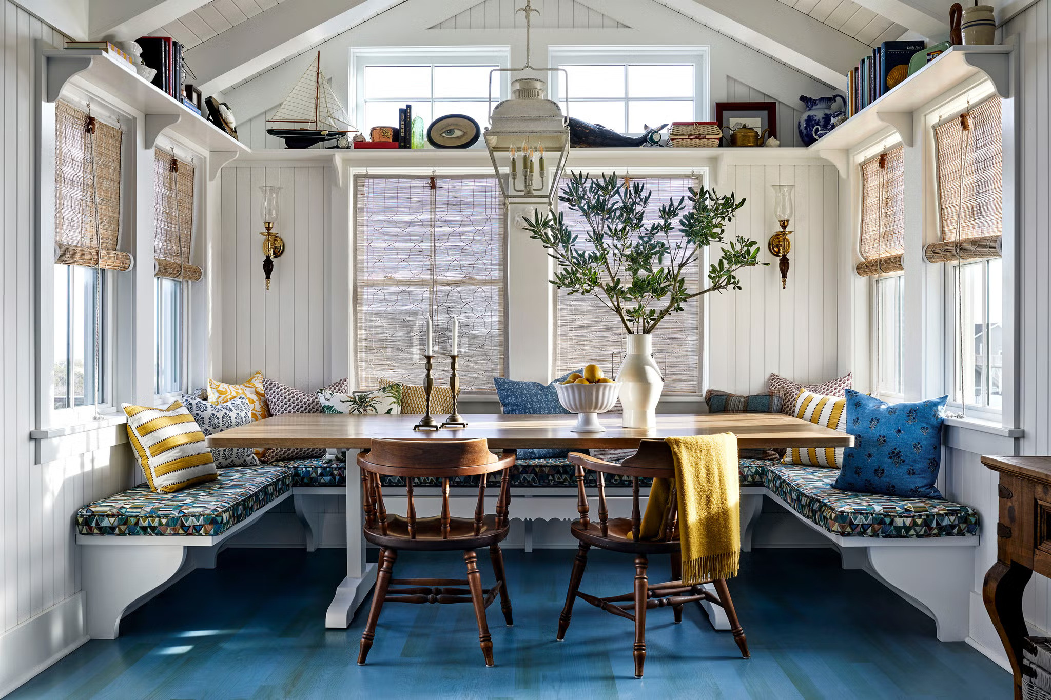 Κεντρικό ρόλο στη συνολική αισθητική παίζουν τα υλικά που επιλέχθηκαν για να αποκτούν χαρακτήρα όσο περνά ο καιρός. Τα ξύλινα πατώματα είναι βαμμένα σε μια απαλή μπλε απόχρωση, μια επιλογή που δεν είναι μόνο αισθητική αλλά και πρακτική, καθώς αντέχει στη φθορά της άμμου και της υγρασίας. Οι επενδύσεις στους τοίχους ενισχύουν τη ναυτική αναφορά, ενώ τα μεταλλικά στοιχεία από ακατέργαστο ορείχαλκο σχεδιάστηκαν ώστε να πατινάρουν φυσικά. Το σπίτι δεν προσπαθεί να διατηρήσει την τελειότητα, αλλά να εξελίσσεται μέσα από τη χρήση.