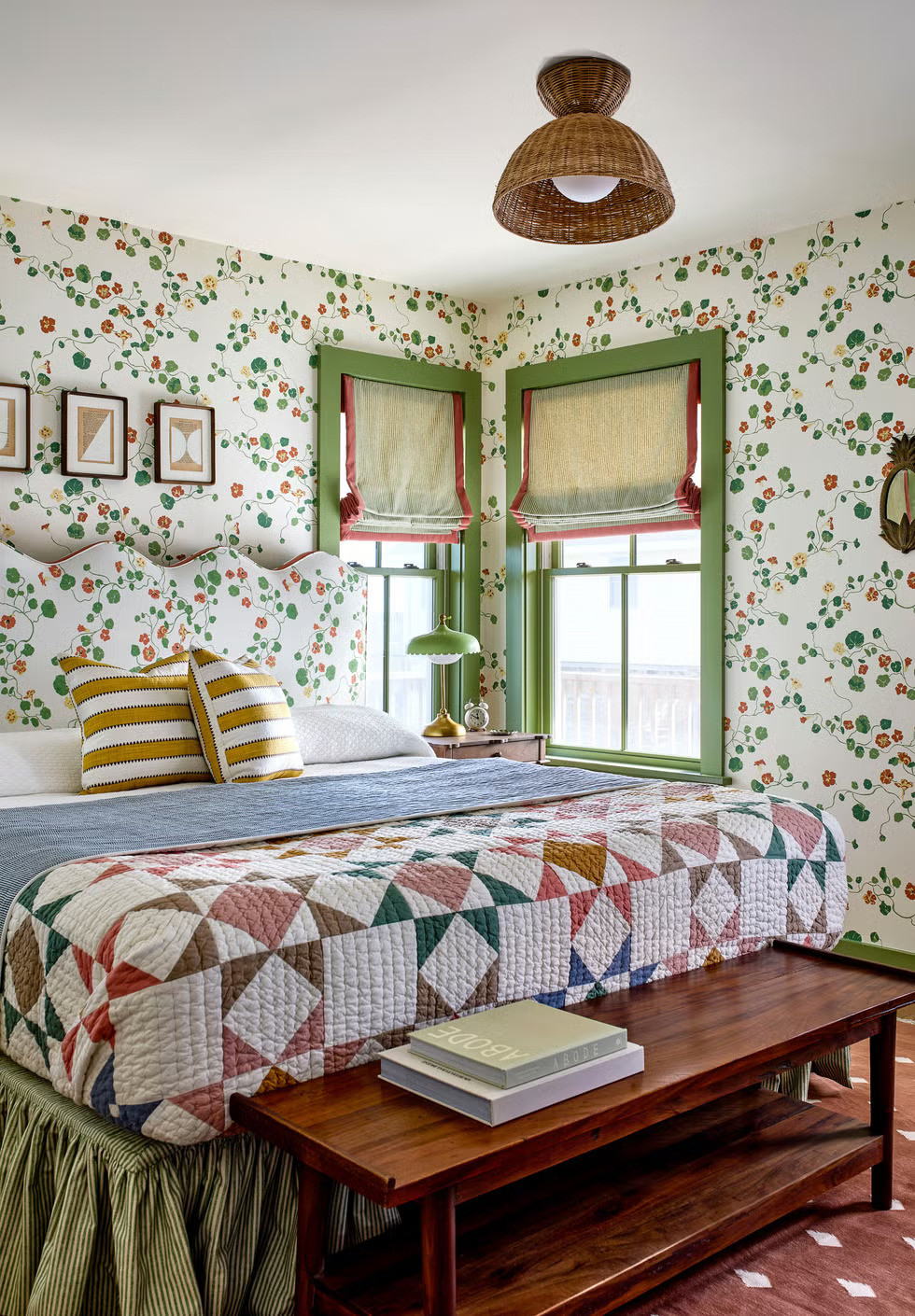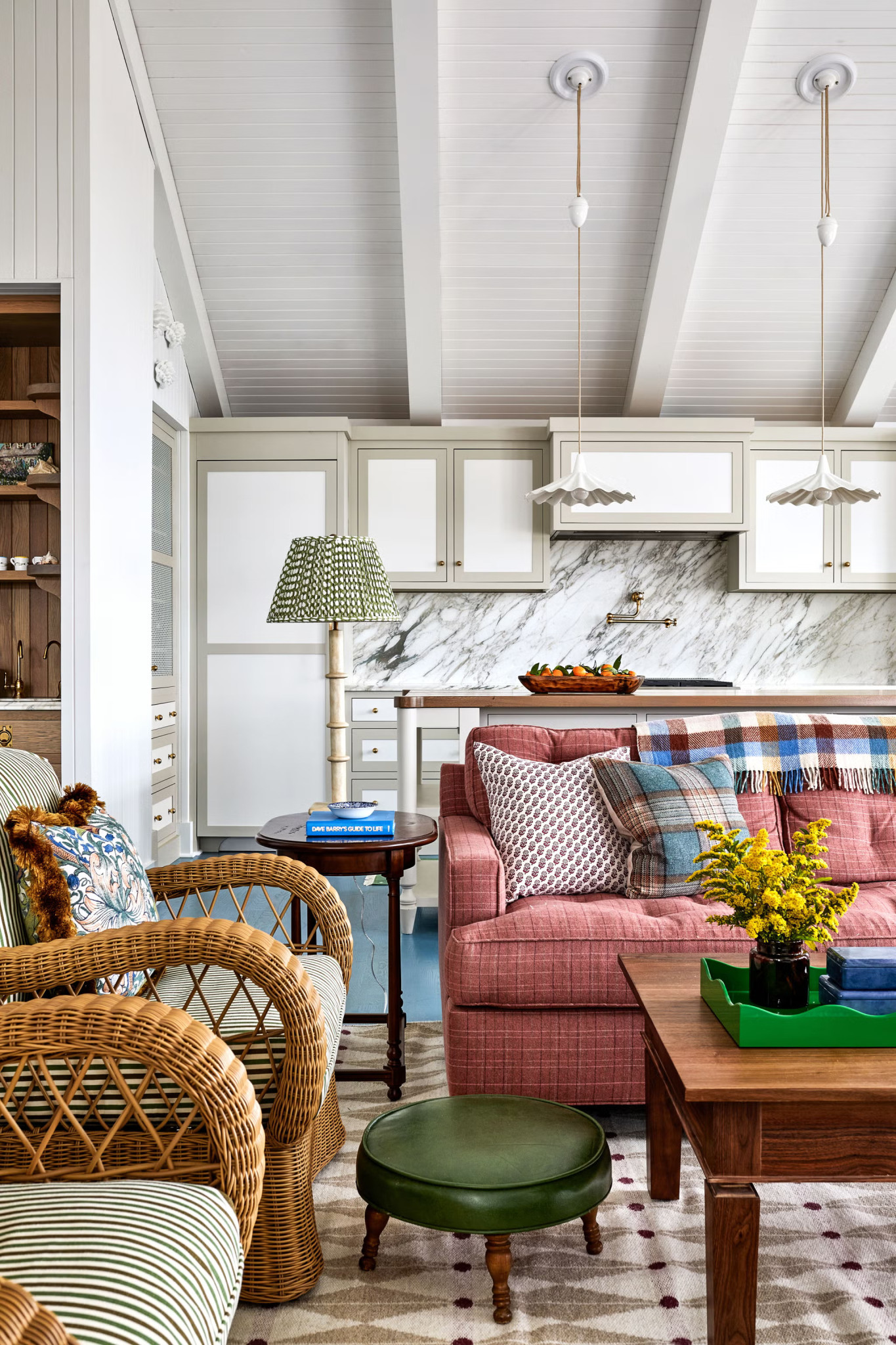 Στο καθιστικό, η προσέγγιση απομακρύνεται από την αυστηρή συμμετρία. Οι καναπέδες, οι πολυθρόνες από ρατάν και τα βοηθητικά τραπέζια διαφορετικών στιλ συνθέτουν ένα σκηνικό που θυμίζει μια συλλογή αντικειμένων με ιστορία. Τα υφάσματα είναι ανθεκτικά αλλά ταυτόχρονα μαλακά στην όψη, ενώ η μίξη μοτίβων και χρωμάτων δημιουργεί ένα layered αποτέλεσμα. Τίποτα δεν δείχνει επιτηδευμένο, αλλά αντίθετα, όλα μοιάζουν να έχουν τοποθετηθεί φυσικά με την πάροδο του χρόνου.