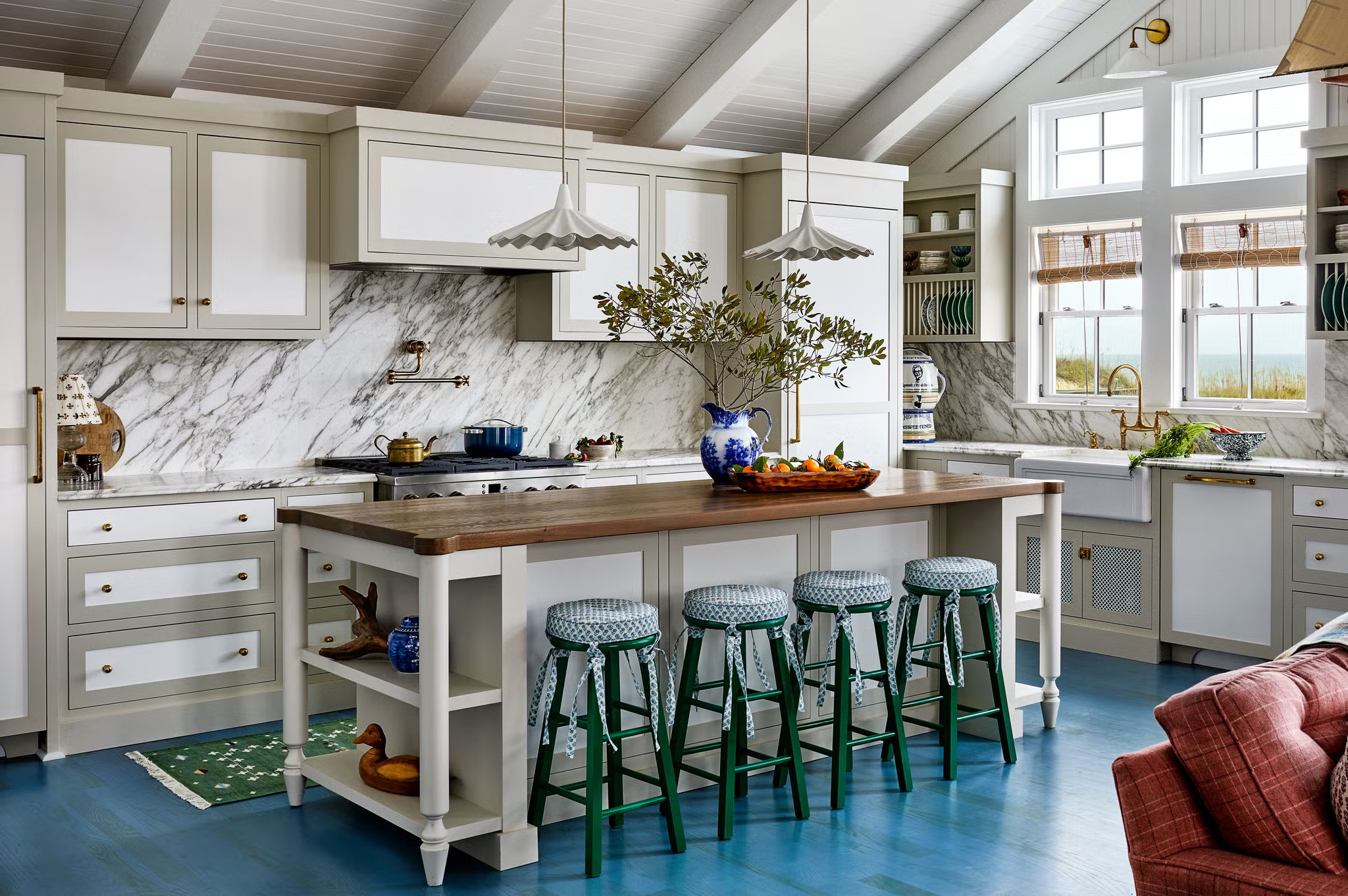 Η κουζίνα αποτελεί την καρδιά του σπιτιού και είναι σχεδιασμένη για να εξυπηρετεί την καθημερινότητα αλλά και τη φιλοξενία. Τα δίχρωμα ντουλάπια προσθέτουν βάθος και χαρακτήρα, ενώ ο συνδυασμός των ανοιχτών ραφιών και των κλειστών αποθηκευτικών χώρων ισορροπεί ανάμεσα στην πρακτικότητα και την αισθητική. Στο κέντρο, η νησίδα με τις καμπύλες λεπτομέρειες λειτουργεί ως σημείο συγκέντρωσης, είτε για πρωινό καφέ είτε για χαλαρές στιγμές μετά την παραλία. Οι λεπτομέρειές της θυμίζουν περισσότερο ένα έπιπλο παρά μια τυπική νησίδα, ενισχύοντας έτσι τη ζεστασιά του χώρου.