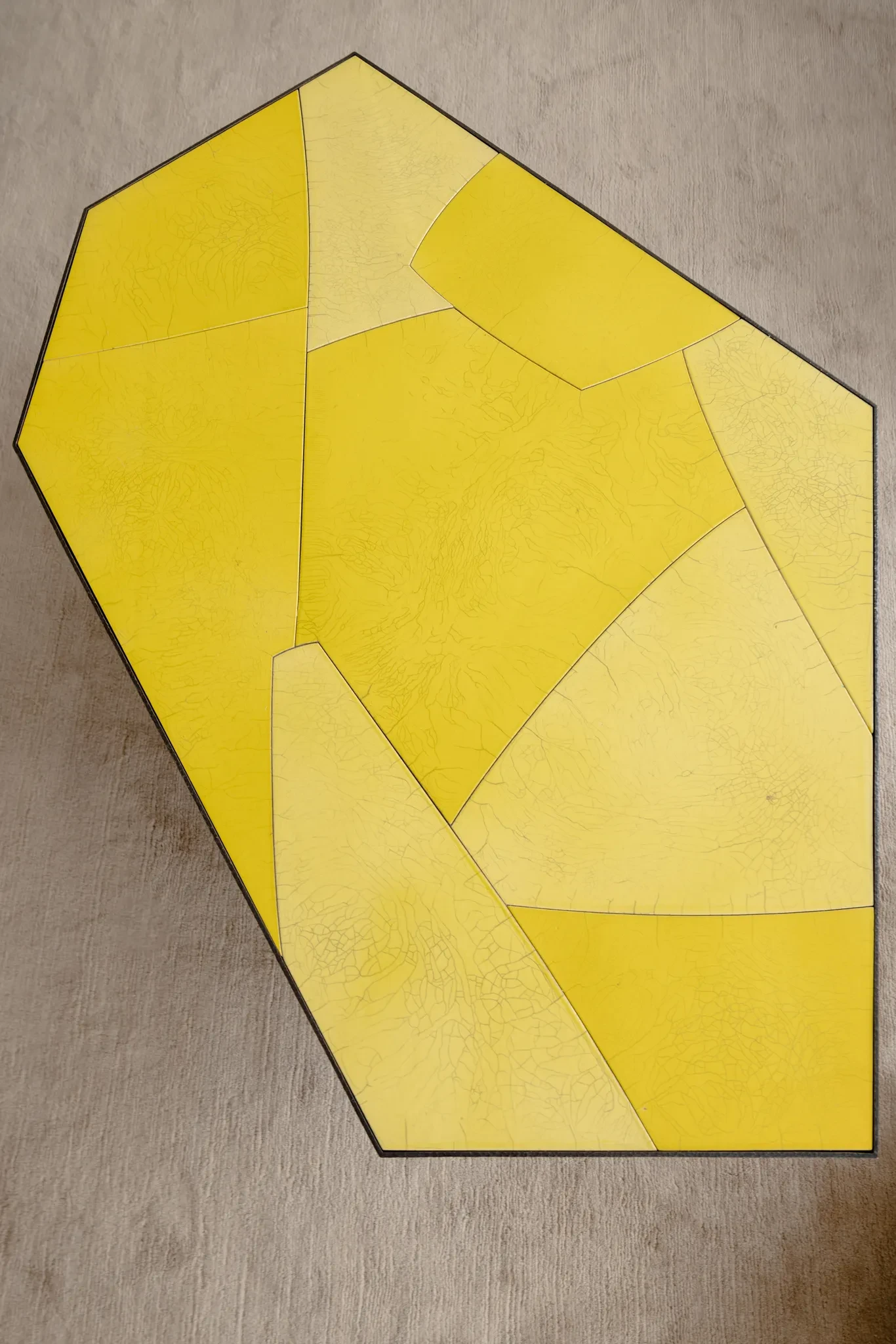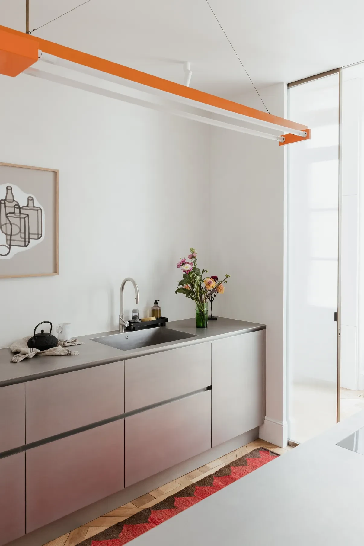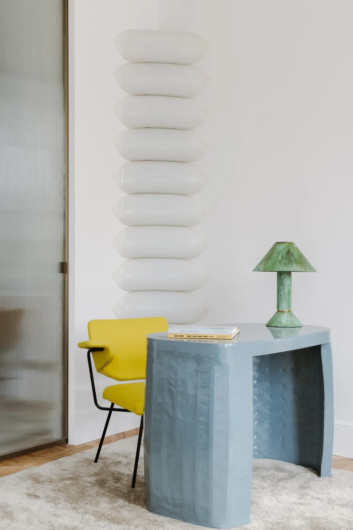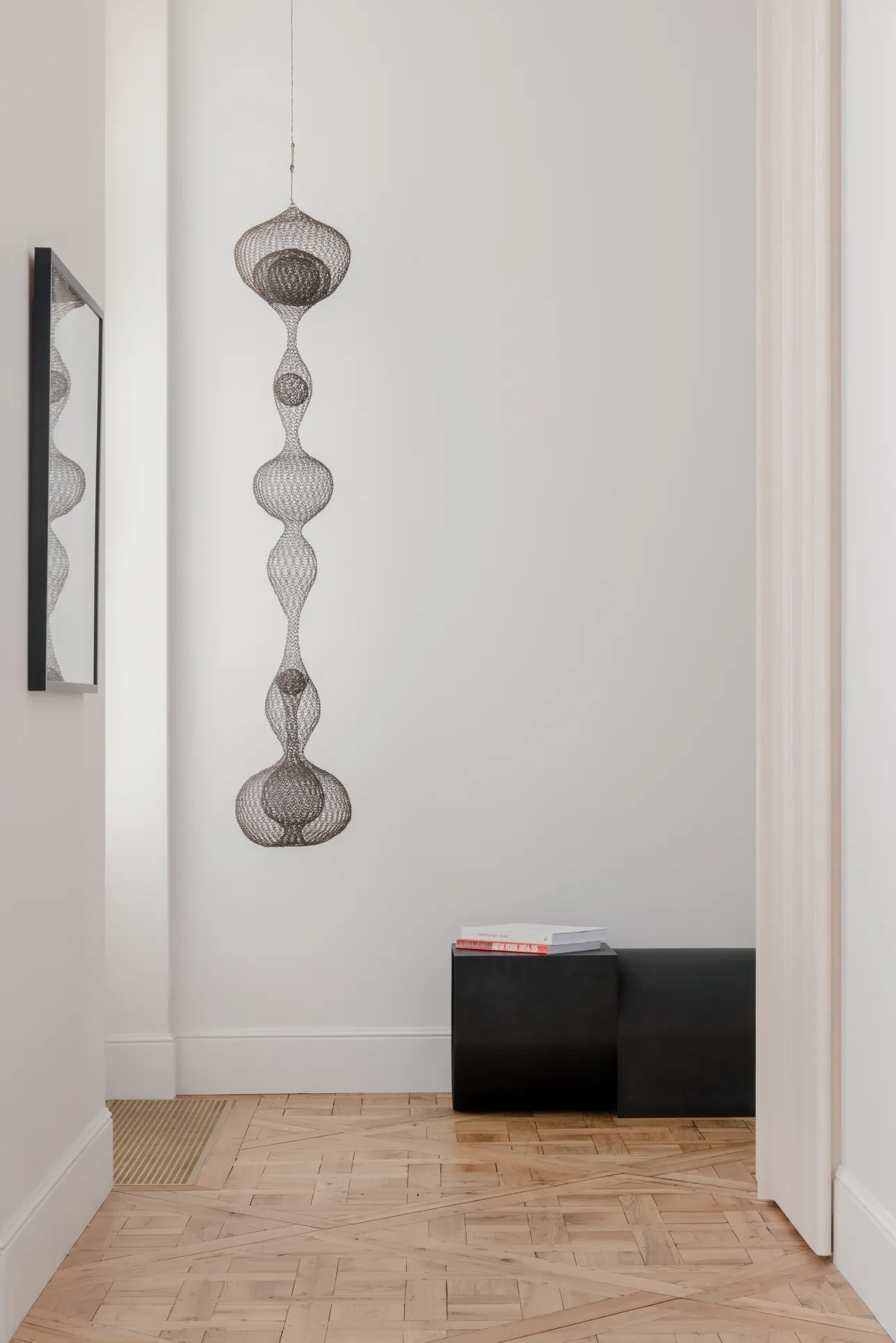 Η είσοδος κοσμείται από ένα γλυπτικό φωτιστικό της Delphine Grandvaux, που λειτουργεί σαν εικαστική εισαγωγή στο ύφος του διαμερίσματος. Στην κουζίνα, ένας πίνακας τέμπερας της Anya Zholud δίνει ζωντάνια στα μεταλλικά ντουλάπια, συνδυάζοντας το ψυχρό ατσάλι με τη θερμή πινελιά του χρώματος. Στο δωμάτιο των επισκεπτών, ένα πολυλειτουργικό έπιπλο - ταυτόχρονα γραφείο και ντουλάπα - δημιουργήθηκε ειδικά για τον χώρο, με την παραδοσιακή τεχνική της λάκας να του προσδίδει βάθος και υφή.