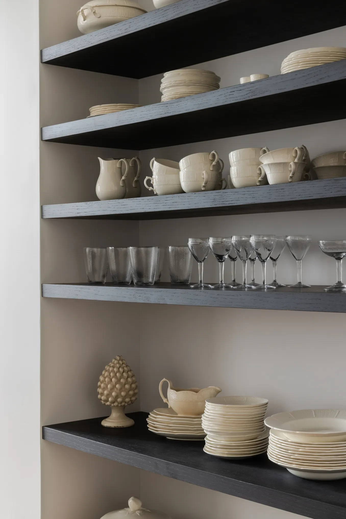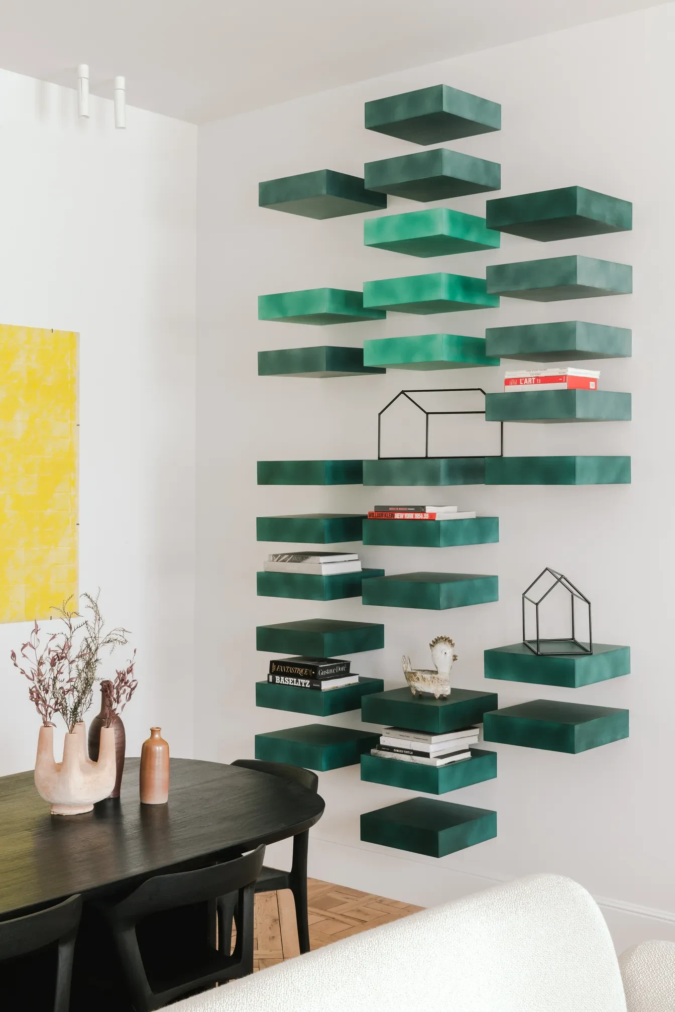 Τα ράφια της Mireille Herbst, βαμμένα σε ένα φωτεινό πράσινο της άνοιξης, συνομιλούν με το χειροποίητο τραπέζι Raku της Fabienne L’Hostis σε θερμούς τόνους του φθινοπώρου. Η τραπεζαρία από αφρικανικό μαόνι, σχεδιασμένη σε συνεργασία με τη Liz Hopkins, φέρνει στο εσωτερικό τη βαθειά θερμότητα του χειμώνα, ενώ η vintage πολυθρόνα Gio Ponti, επενδυμένη σε βελούδο “σκουριάς”, προσδίδει στο καθιστικό μια αίσθηση διακριτικής πολυτέλειας. Κατά τη διάρκεια των εργασιών, η αποκάλυψη παλιών βουργουνδί τοιχογραφιών αποτέλεσε απρόσμενη έμπνευση, δίνοντας κατεύθυνση σε ολόκληρη την παλέτα των χρωμάτων.