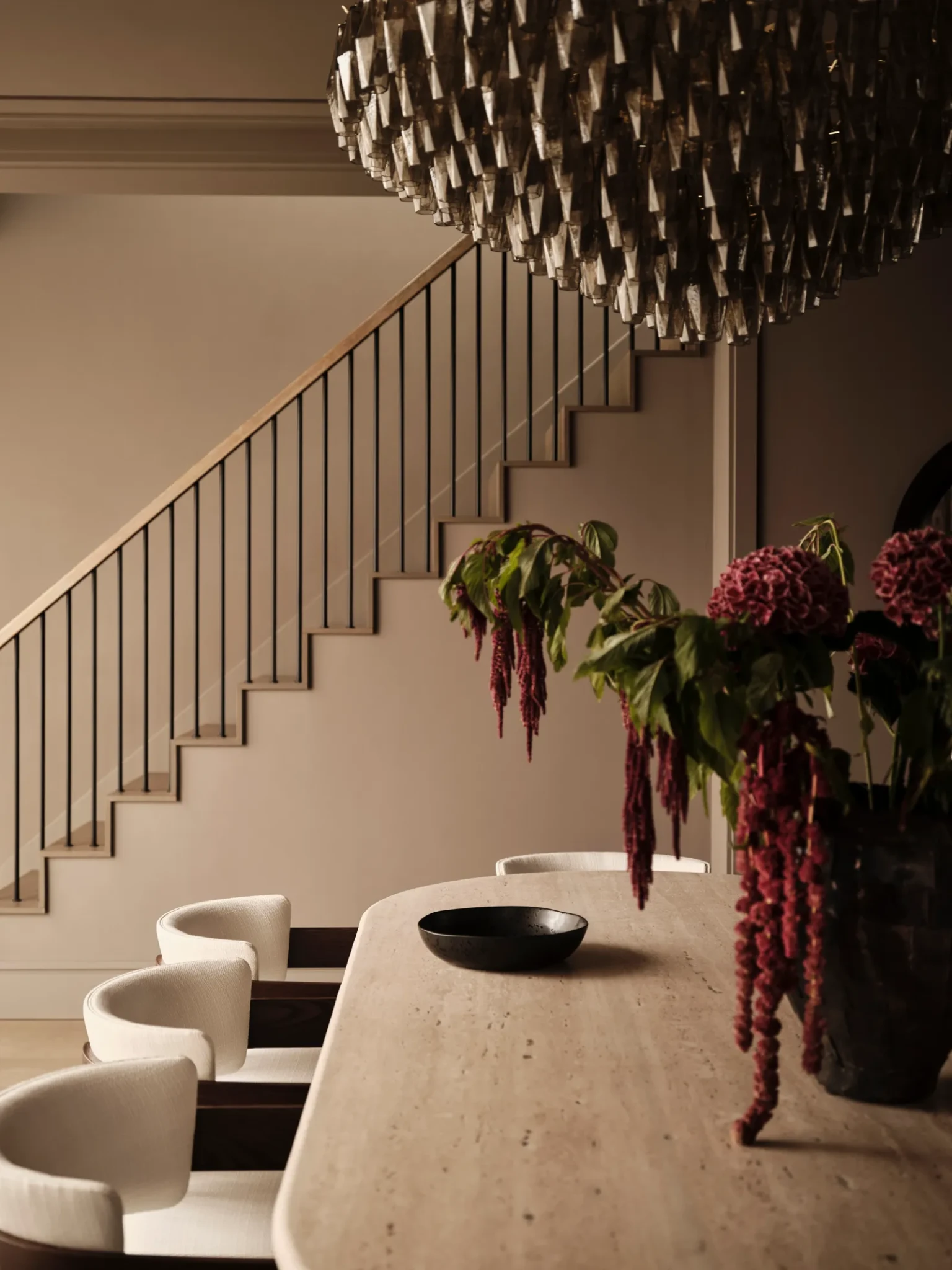 Η τραπεζαρία ξεχωρίζει με τραβερτίνι τραπέζι και έναν πολυέλαιο από Murano που διαθλά το φως σε όλο το δωμάτιο, προσθέτοντας μια αίσθηση πολυτέλειας και κίνησης στην ατμόσφαιρα. Η ίδια η Lafferty σημειώνει ότι αυτό το κομμάτι αλλάζει την ενέργεια της τραπεζαρίας καθώς το φως μεταβάλλεται κατά τη διάρκεια της ημέρας, δίνοντας στο χώρο έναν ακόμα δυναμικό χαρακτήρα.