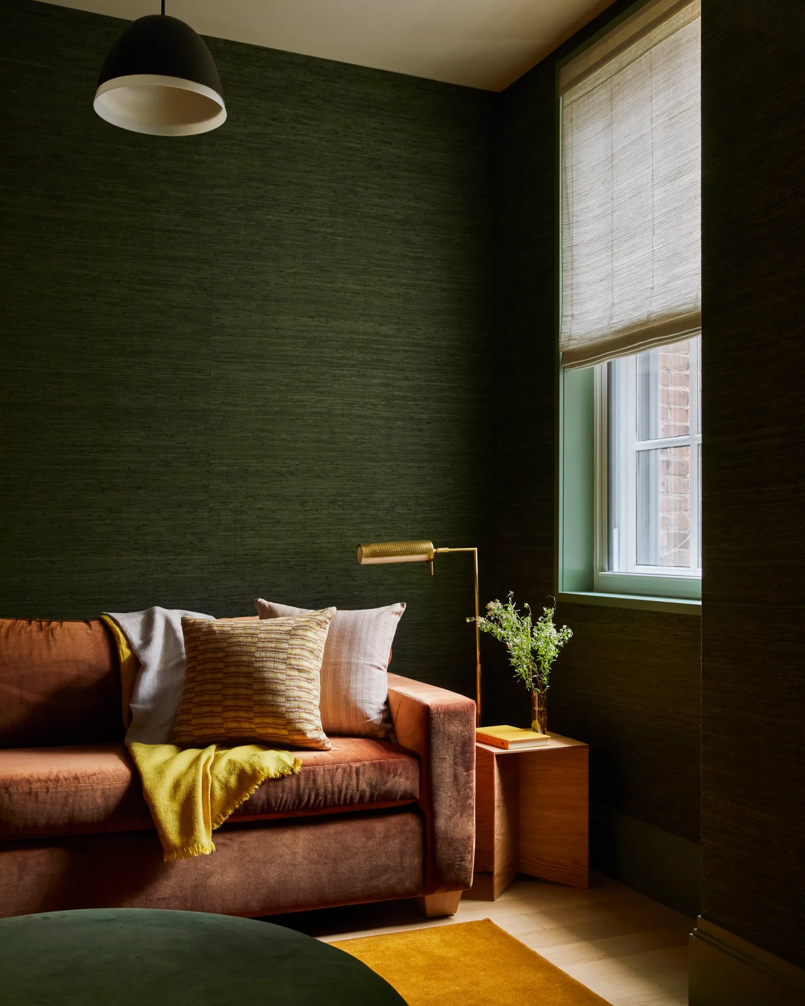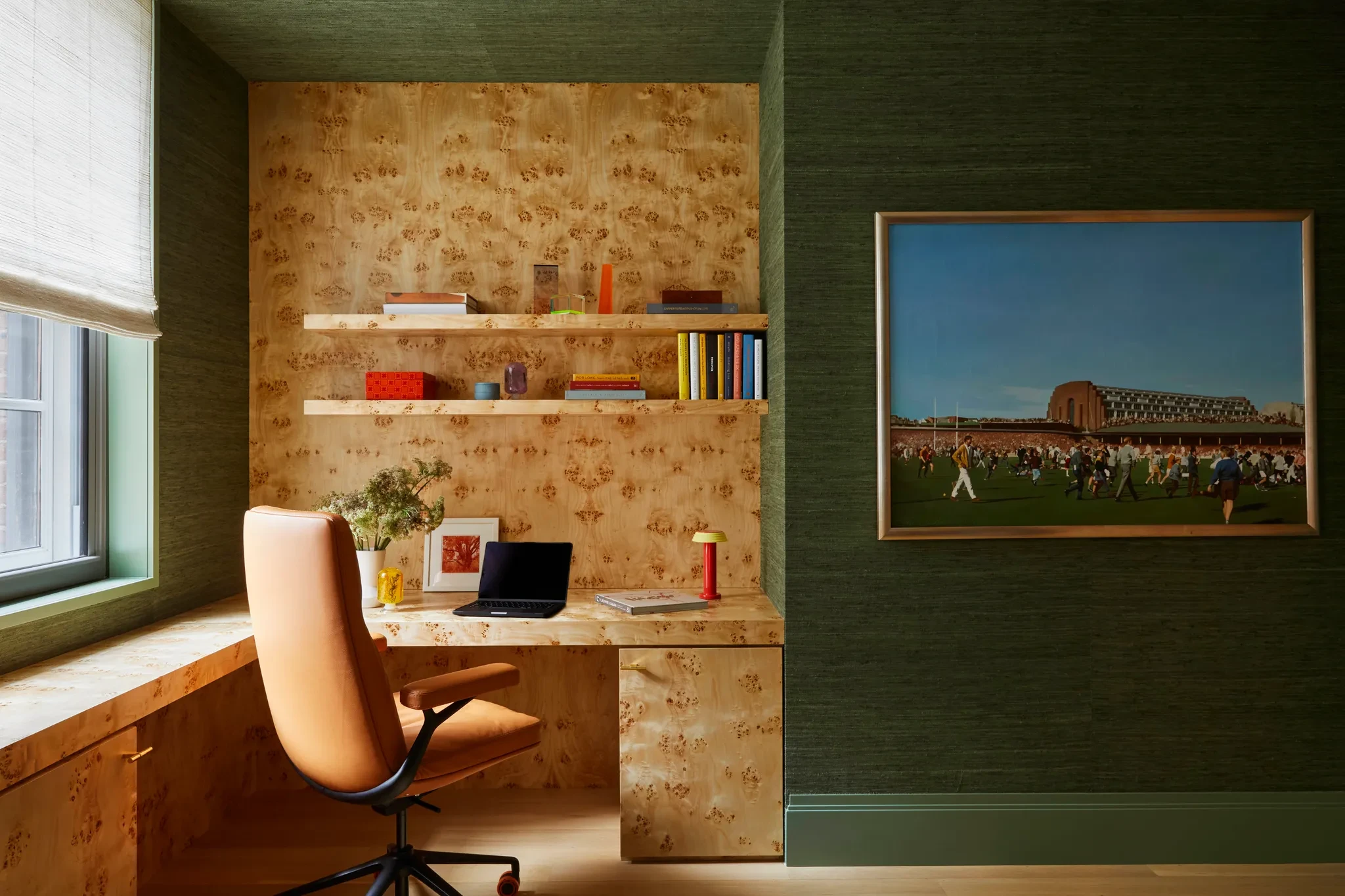 Στο γραφείο, που λειτουργεί παράλληλα ως ξενώνας, το ύφος αλλάζει. Οι τοίχοι ντύνονται σε βαθύ hunter green, προσδίδοντας μια πιο ανδρική ενέργεια και δημιουργώντας ήρεμη αντίθεση με τους υπόλοιπους χώρους. Το δωμάτιο πλαισιώνεται από ένα en suite μπάνιο με τα ίδια πράσινα χρώματα, ενισχύοντας την αίσθηση συνέχειας.