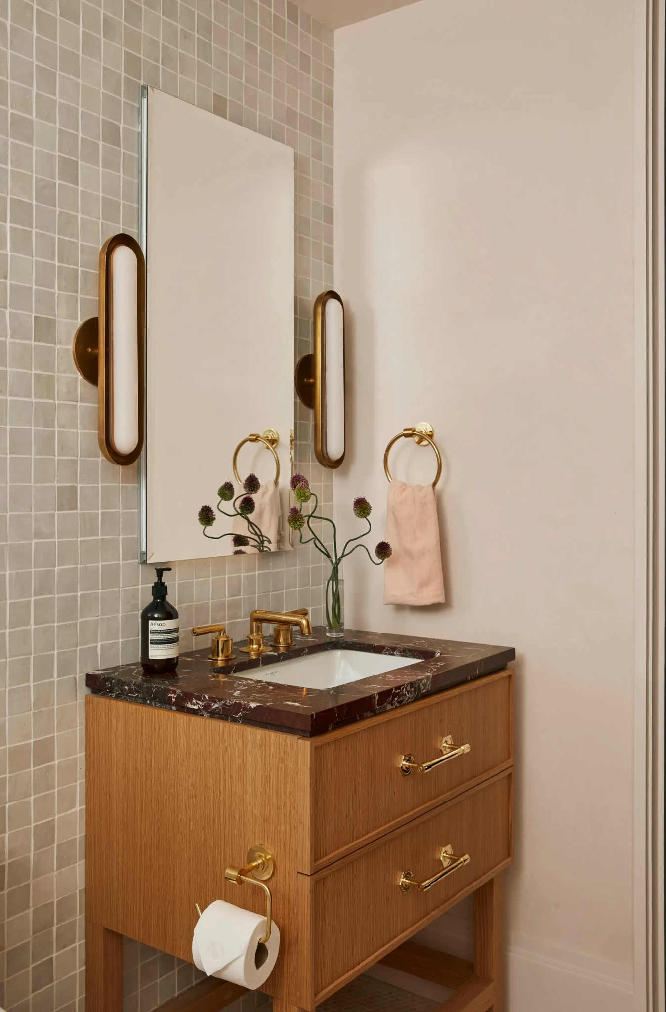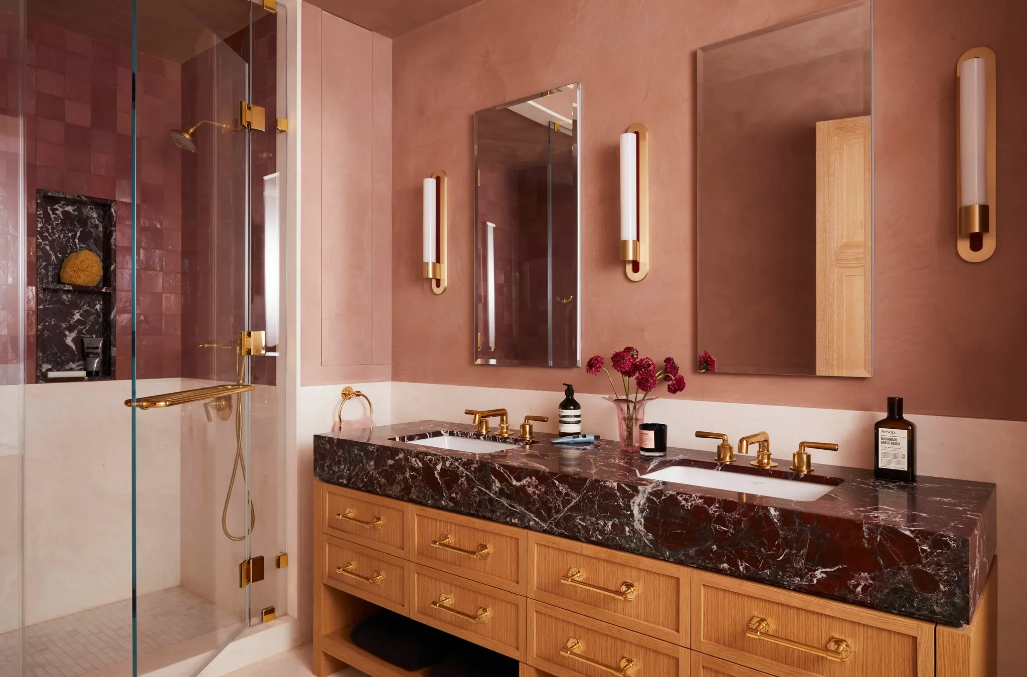 Στο κυρίως μπάνιο, η Forino επιλέγει γυαλιστερά πλακίδια zellige για τους τοίχους του ντους και μια επικάλυψη τύπου tadelakt πάνω από τη ροζ μαρμάρινη επιφάνεια του νιπτήρα. Οι μπρούτζινες λεπτομέρειες από τη Waterworks προσθέτουν λάμψη, ενώ η συνολική σύνθεση αποπνέει ηρεμία και πολυτέλεια χωρίς υπερβολή.