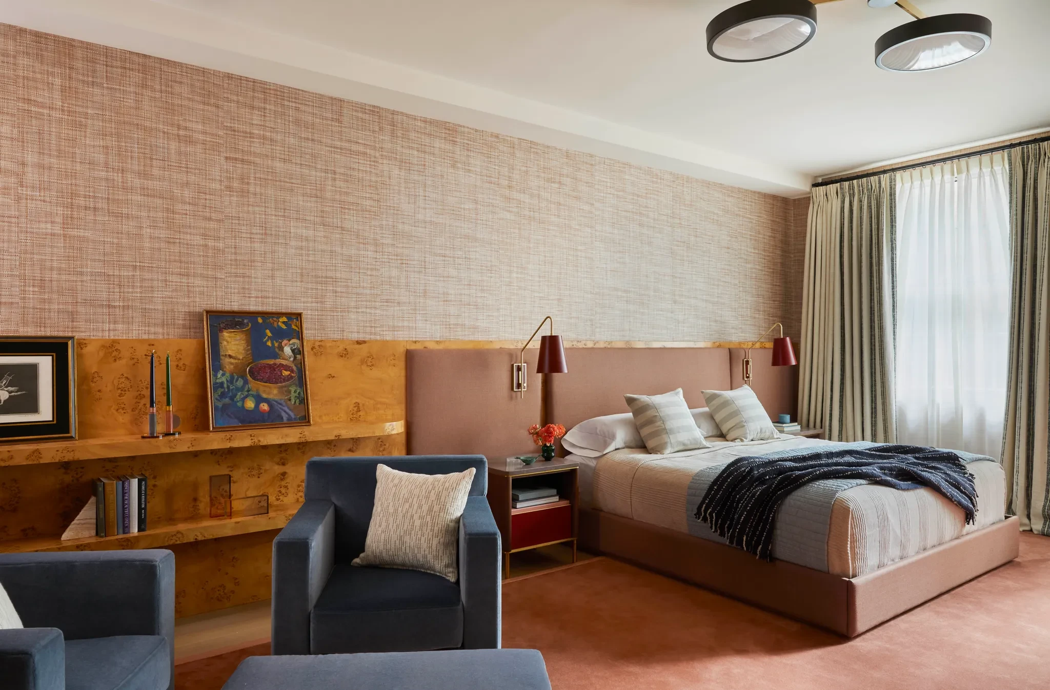 Το κυρίως υπνοδωμάτιο κινείται σε πιο απαλούς τόνους. Ένα προσεκτικά σχεδιασμένο κεφαλάρι από τη Forino, φωτιστικά της Urban Electric Company, κομοδίνα Orior και πολυθρόνες Jean-Michel Frank συνθέτουν μια ατμόσφαιρα ηρεμίας. Το ροζ εμφανίζεται διακριτικά σε υφάσματα και αντικείμενα, πλαισιωμένο από τόνους πράσινου και μπλε που ισορροπούν το σύνολο.