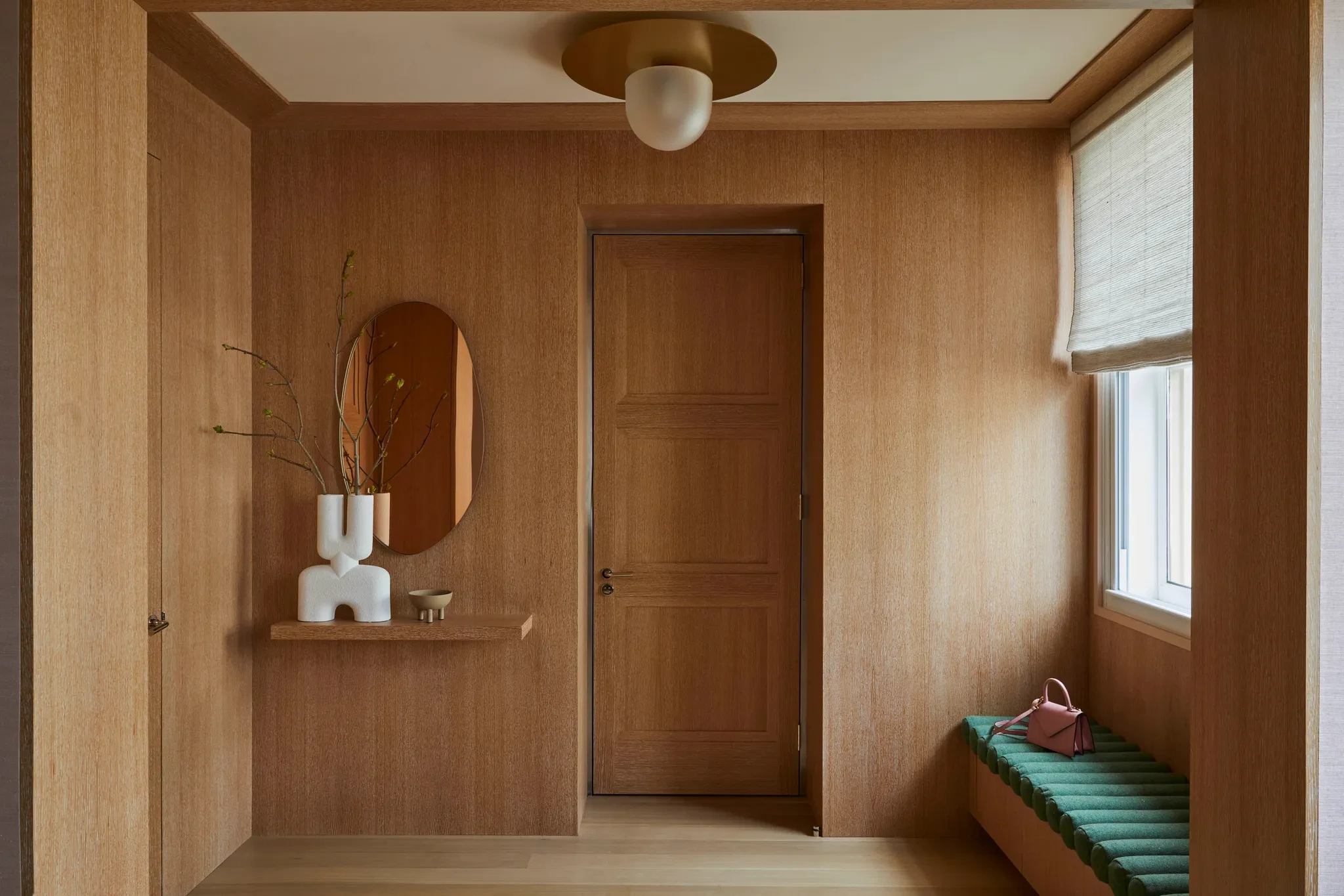 Η Forino φρόντισε κάθε επιφάνεια να αφηγείται μια ιστορία μέσα από την υφή και το υλικό της. Το ξύλο, το μέταλλο, το ύφασμα και το φως συνδυάζονται με απόλυτη ισορροπία. Στην είσοδο, όπου ο ιδιωτικός ανελκυστήρας ανοίγει απευθείας στο φουαγιέ, τα πάνελ από spruce oak και η προσεκτικά μελετημένη φωτεινή παλέτα προϊδεάζουν για το ήρεμο και εκλεπτυσμένο εσωτερικό. Ένα καθιστικό έπιπλο σχεδιασμένο από την ίδια τη Forino με ύφασμα Cassamance, καθρέφτης Sabine Marcelis και φωτιστικό της Urban Electric Company ολοκληρώνουν την υποδοχή.