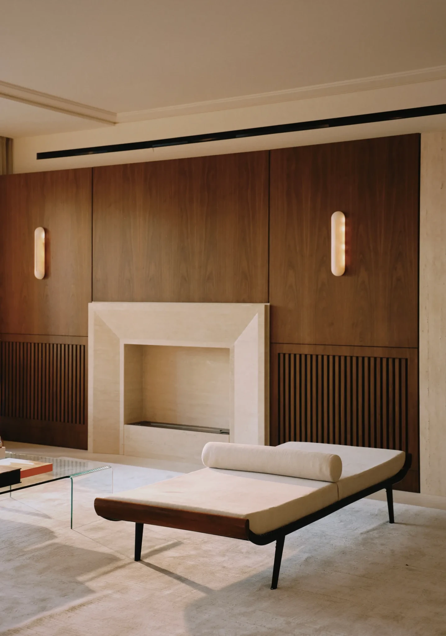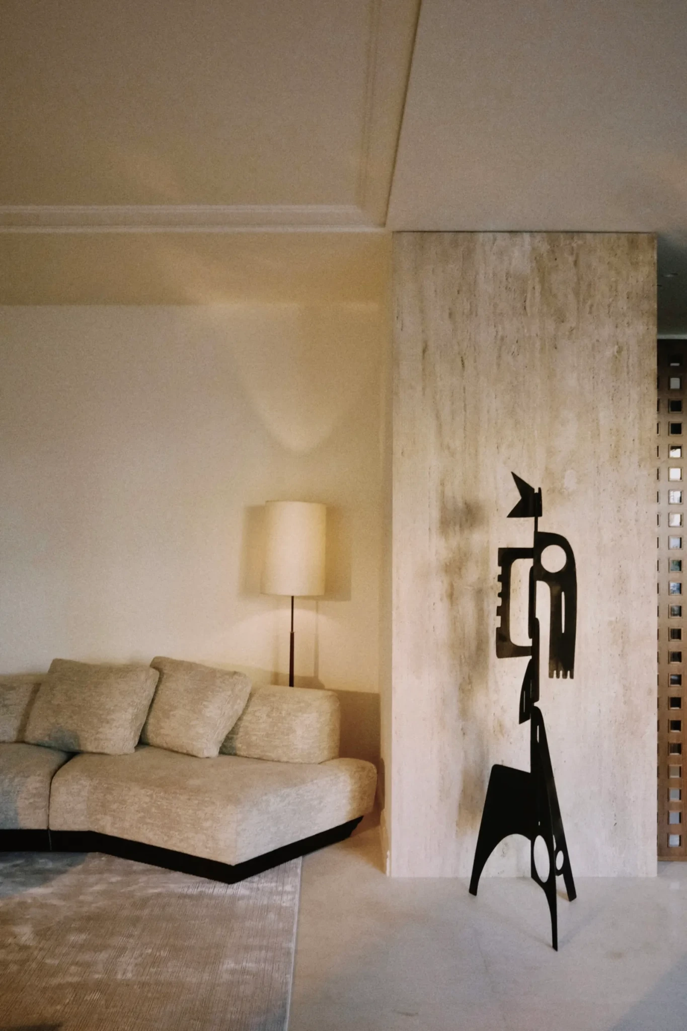 Η εμπειρία ξεκινά από τον προθάλαμο: σκοτεινός, χαμηλοτάβανος, εσκεμμένα κλειστός. Αντί να τον «διορθώσει», ο σχεδιαστής ενίσχυσε τη δραματικότητά του. Επένδυσε τους τοίχους με πάνελ και διάτρητα παραβάν από αμερικανική καρυδιά, πλαισιωμένα με τραβερτίνη. Όταν το φως τα διαπερνά, δημιουργεί σκιές που μοιάζουν να κινούνται. Οι αναφορές στη mashrabiya της αραβικής αρχιτεκτονικής είναι σαφείς, με τετράγωνα ανοίγματα που προκαλούν περιέργεια για όσα ακολουθούν.