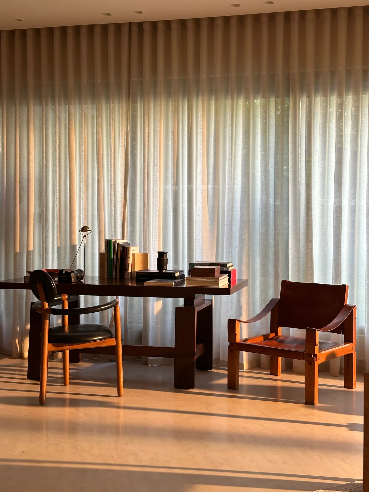 Η παλέτα παραμένει γήινη και ουδέτερη, ώστε να φιλοξενεί την εναλλασσόμενη συλλογή τέχνης. Πολλά από τα έπιπλα είναι σπάνια κομμάτια, που ανακαλύφθηκαν σε υπαίθριες αγορές και γκαλερί στο Παρίσι και το Λονδίνο. Mid-century σχέδια συνυπάρχουν με σύγχρονες δημιουργίες, όλες με έντονη, αλλά ισορροπημένη παρουσία.