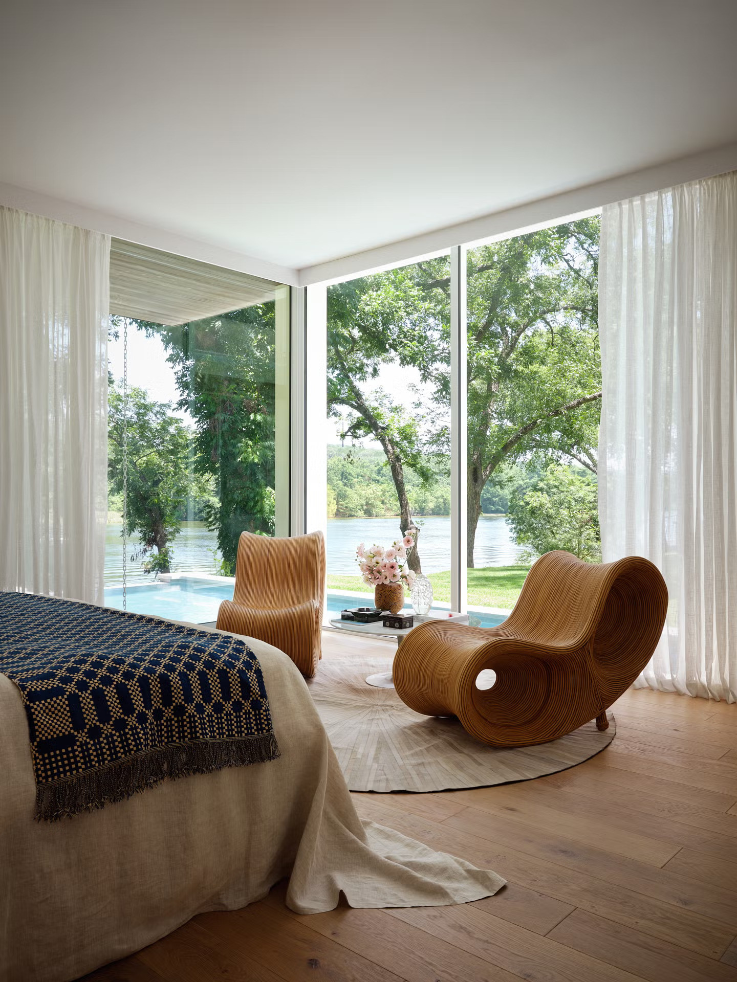 Στα υπνοδωμάτια, η McCabe δημιούργησε χώρους που αντανακλούν ηρεμία και απλότητα. Στον ξενώνα, η χρήση πλαϊνών κουρτινών από τοίχο σε τοίχο και μια οροφή ενισχύουν την αίσθηση της φιλοξενίας, χωρίς να μειώνουν τον φυσικό φωτισμό που εισρέει από τα παράθυρα. Η κύρια κρεβατοκάμαρα υιοθετεί μια λιτή προσέγγιση, όπου οι καμπύλες γραμμές των επίπλων και η επιλογή χρωμάτων σε ουδέτερους τόνους αντανακλούν το νερό της λίμνης και τον ουρανό, ενώ τα ψηλά παράθυρα αγκαλιάζουν τη θέα.