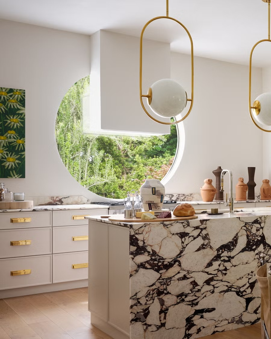 Η κουζίνα, οργανωμένη σε ένα ημι-ανοιχτό πλάνο που ενώνει την τραπεζαρία με το καθιστικό, χρησιμοποιεί εκλεπτυσμένα υλικά για να διατηρήσει μια ομοιόμορφη ροή. Το έντονο μάρμαρο Calacatta Viola της κεντρικής νησίδας συνδέει την κουζίνα με το bar, ενώ η καθαρή γεωμετρία των γραμμών, από τον πάγκο μέχρι τα ανοίγματα, επιτρέπει στο βλέμμα να ταξιδεύει προς τη λίμνη.